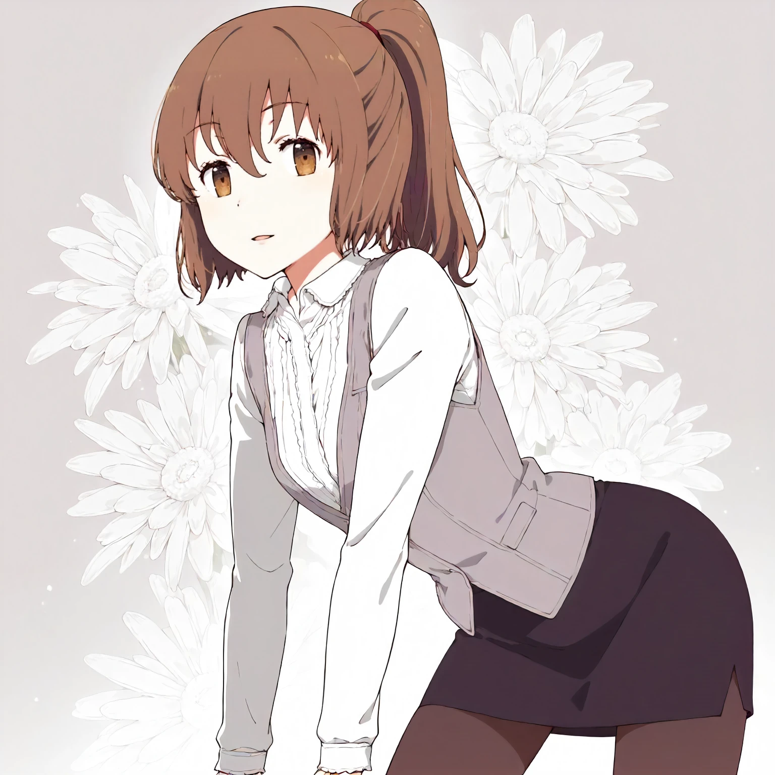 white shirt,gray vest,long_sleeves, black skirt,pencil_skirt, pantyhose,narrow_legs,