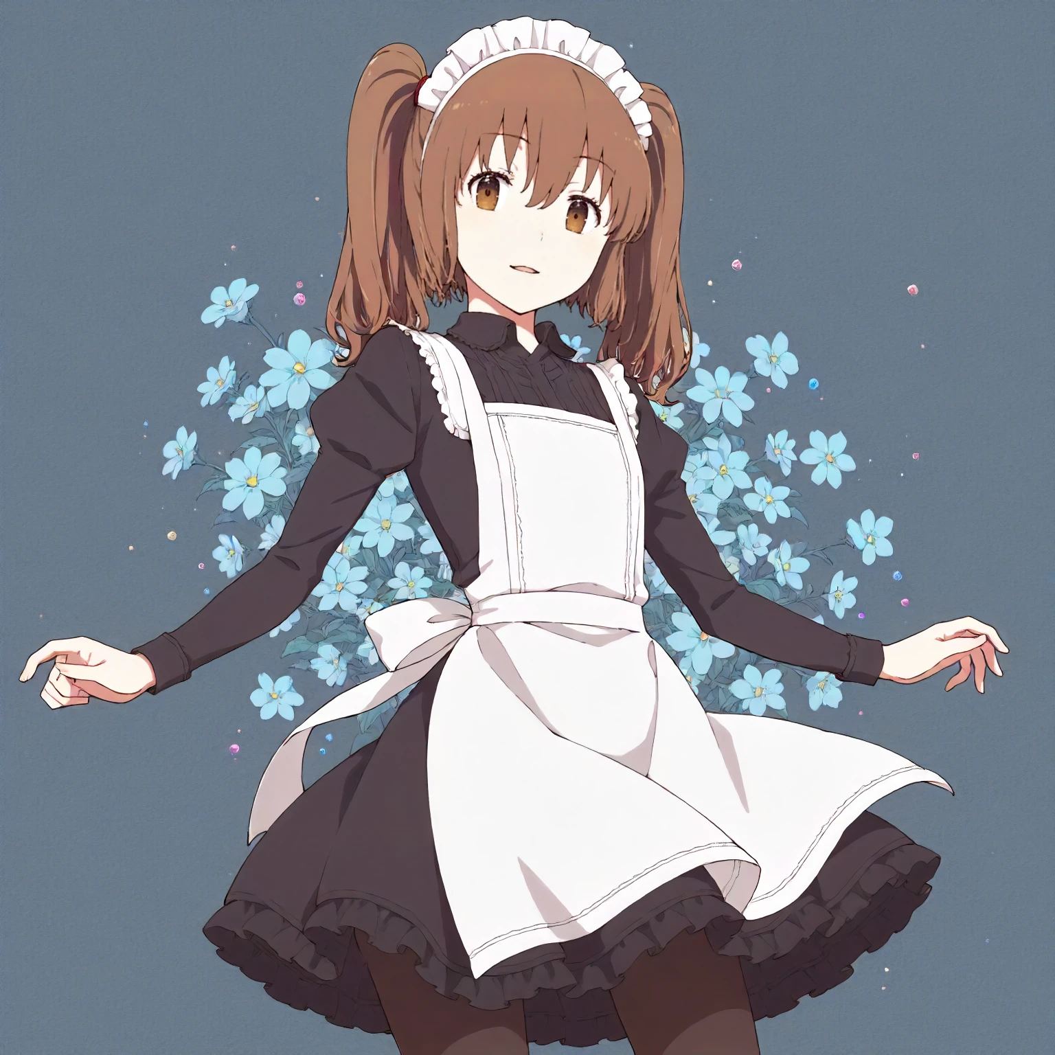maid headdress, black shirt,apron dress,shoulder ruffles,puffy_sleeves,long_sleeves, black skirt,frilled_skirt, black_pantyhose,narrow_legs,