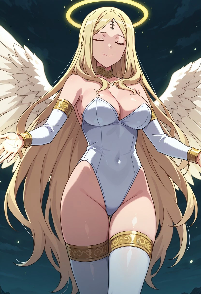 UllminaEAngel, 1girl, solo, long hair, halo on back, blonde hair, parted bangs, very long hair, yellow eyes, forehead cross mark, dark-skinned female, dark skin, large breasts, covered navel, large hips, thick thighs, white thighhighs, angel feathered wings, white highleg leotard, cleavage, golden chocker, detached white sleeves, bare shoulders, thigh gap, golden bracelets, jewelry, angel, bare feet, golden shine, golden bright aura on body, golden light magic in hands, holy aura, golden rays of light,Description