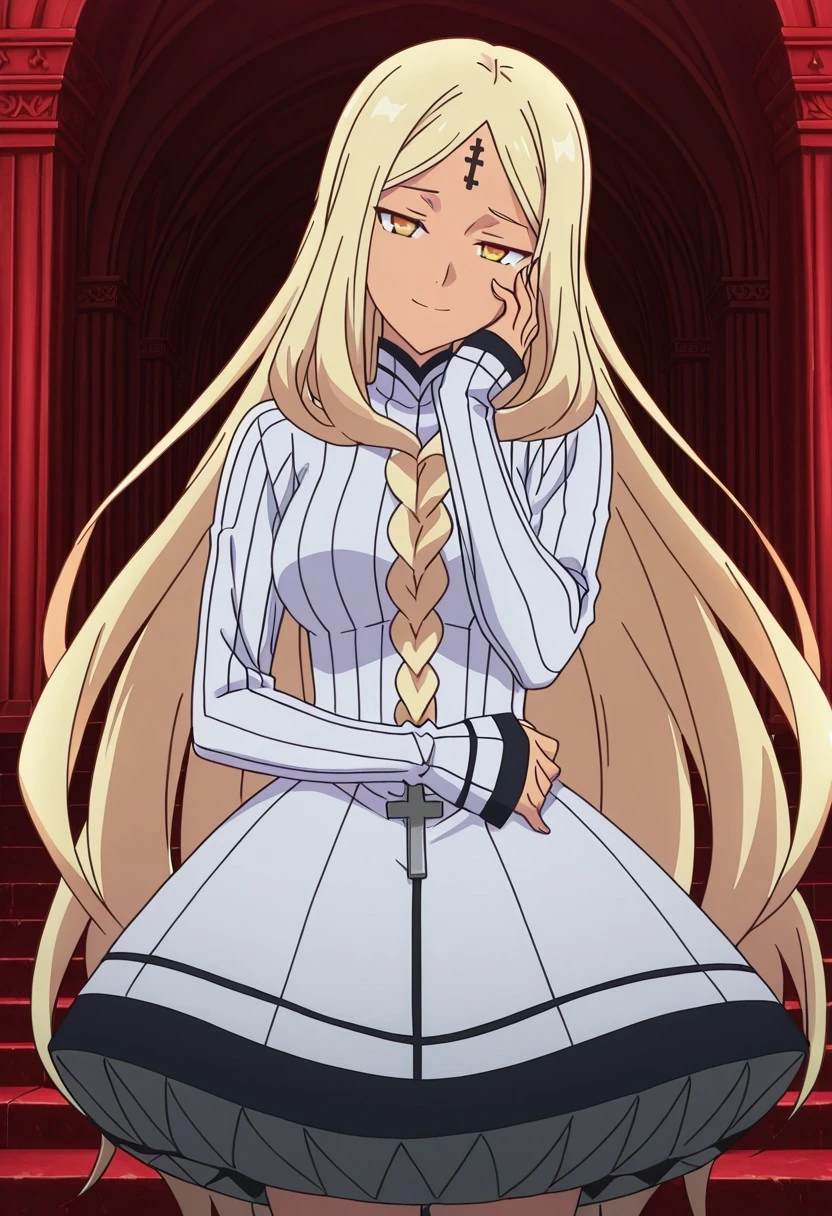 UllminaCasual, 1girl, solo, long hair, blonde hair, parted bangs, braid on front, cross-shaped ornament in braid, very long hair, yellow eyes, forehead cross mark, dark-skinned female, dark skin, large breasts, covered navel, large hips, grey thigh-length dress, long sleeves, sleeves past wrists, grey shoes,