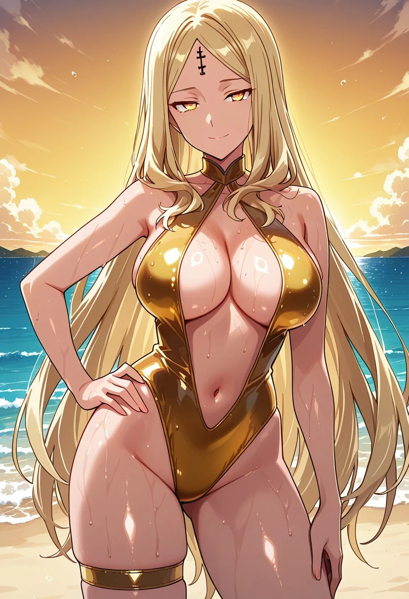 UllminaSwimsuit, 1girl, solo, long hair, blonde hair, parted bangs, very long hair, yellow eyes, forehead cross mark, dark-skinned female, dark skin, large breasts, navel, large hips, thick thighs, golden thigh strap, cleavage, golden one-piece swimsuit, center opening, navel, thick thighs, halterneck, skindentation, bare feet,