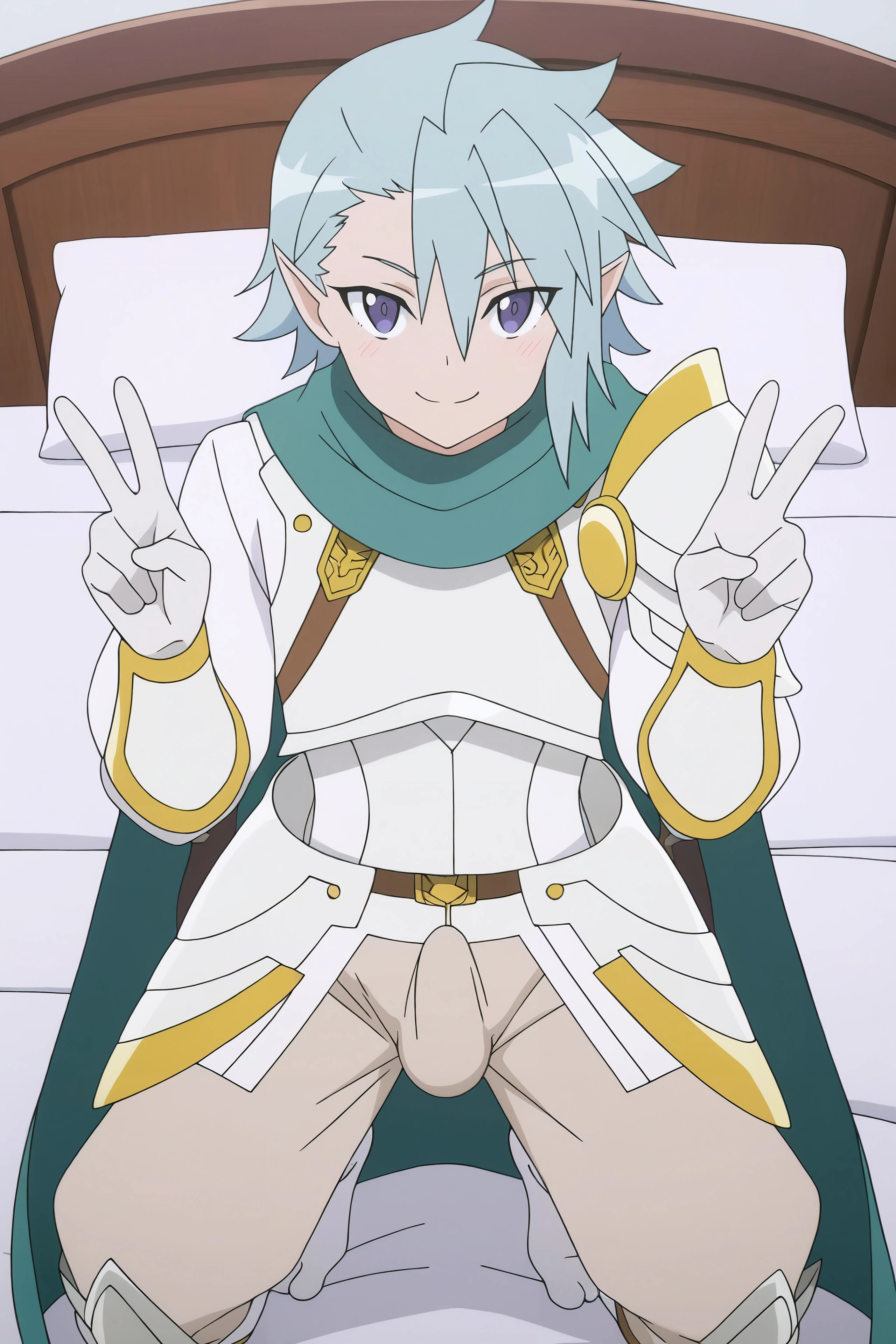 Kia, light blue hair, pointed ears, purple eyes, white armor (with golden trim), teal scarf, teal cloak, white gloves, beige pants, white armor boots