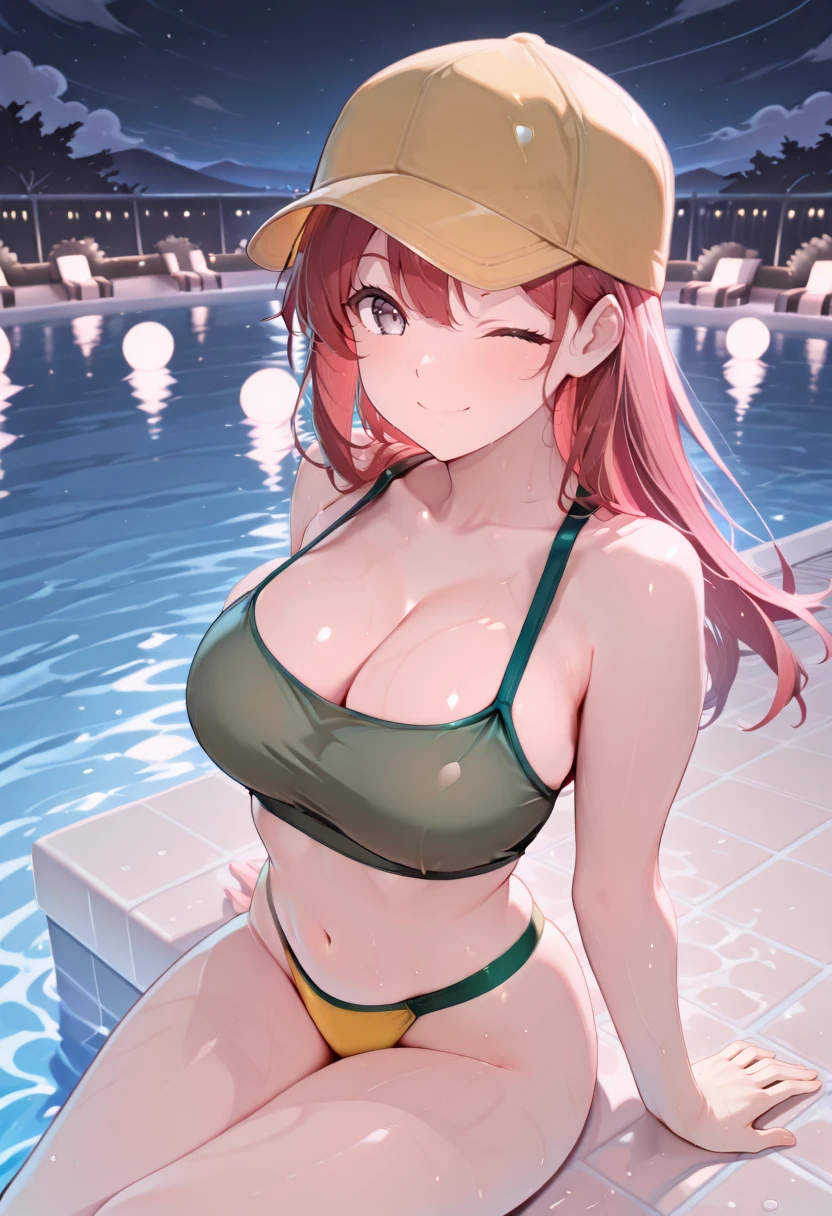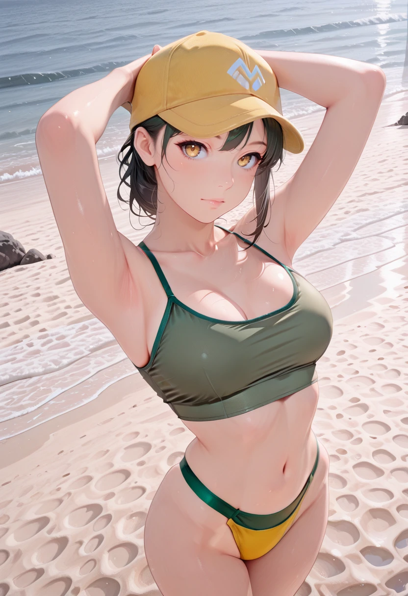 This is my new clothing model. This time I decided to make a simpler and more original outfit. To be honest, but i made some mistakes when assembling the dataset. The colour of the top turned out a bit differently than I wanted. Apparently it is because the colour of the top on the images came out uneven. Also the elastic band from the lower bikini is not always correct. It should be full green. I also tried to get rid of the drawings on cap, but sometimes they can still appear. Although it is not difficult to remove it through inpainting. So in future versions, I'll try to fix it all