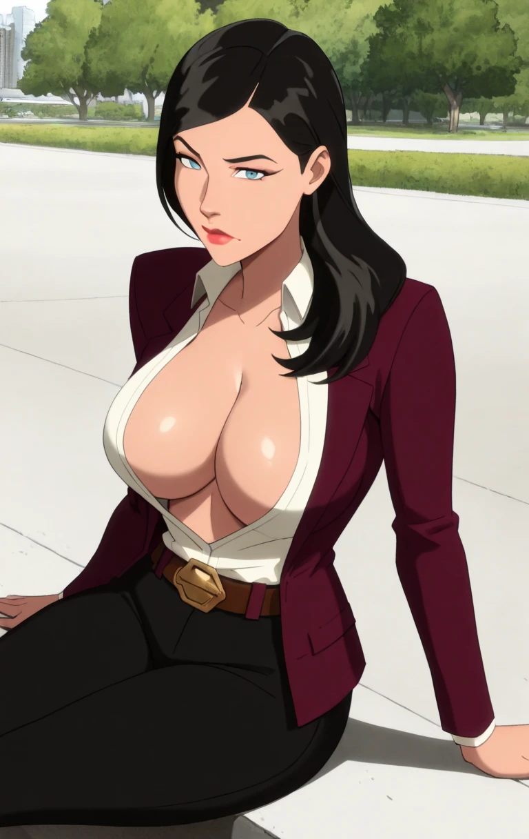 1girl, solo, long hair, looking at viewer, blue eyes, shirt, black hair, long sleeves, open clothes, belt, open shirt, red lips, belt buckle,suit, black pants,l01sl4n3