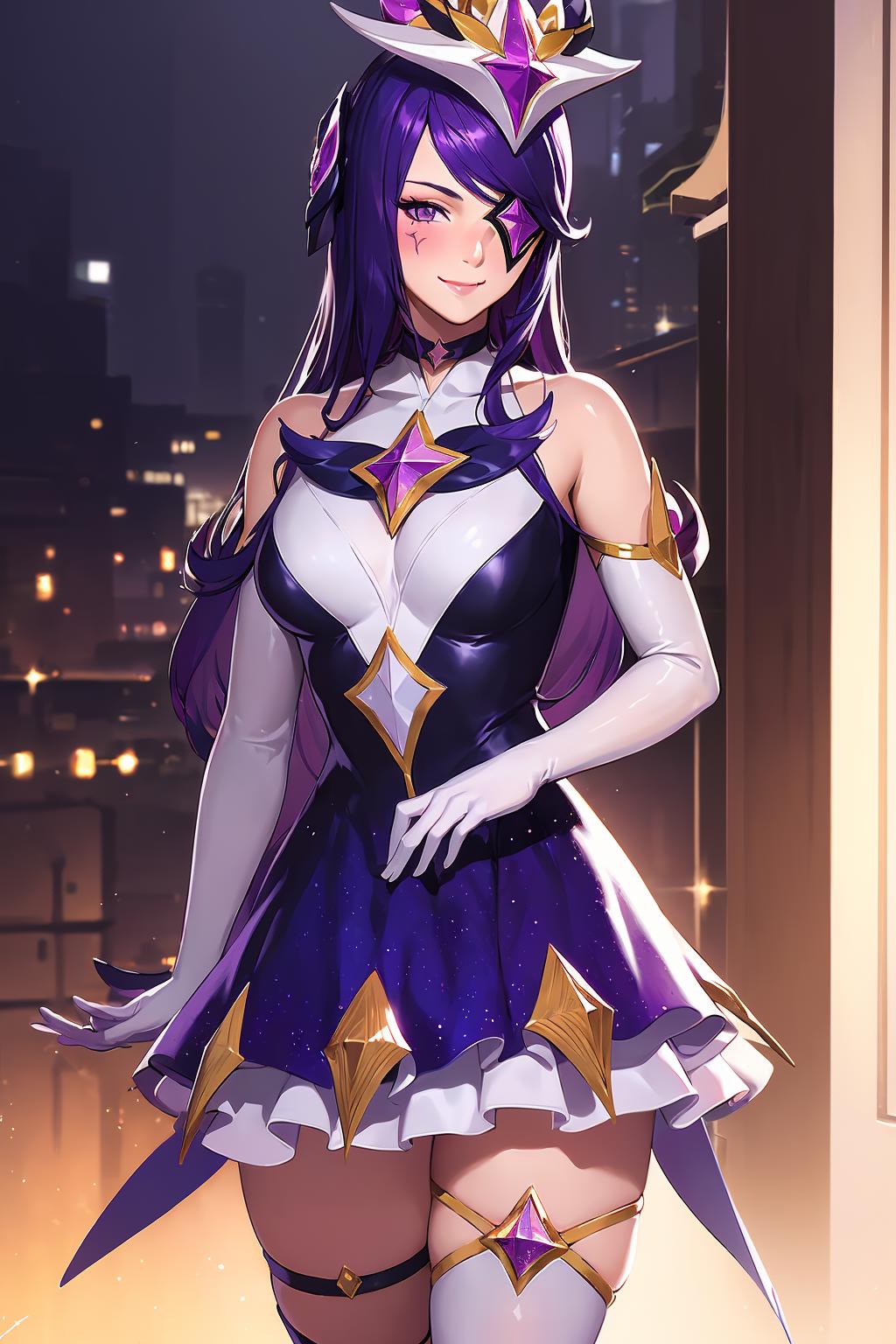 Tags: starguardiansyndra,(white thighhighs, elbow gloves, hair ornament, dress, star \(symbol\), choker, star guardian \(league of legends\), purple hair, long hair, eyepatch, orb)