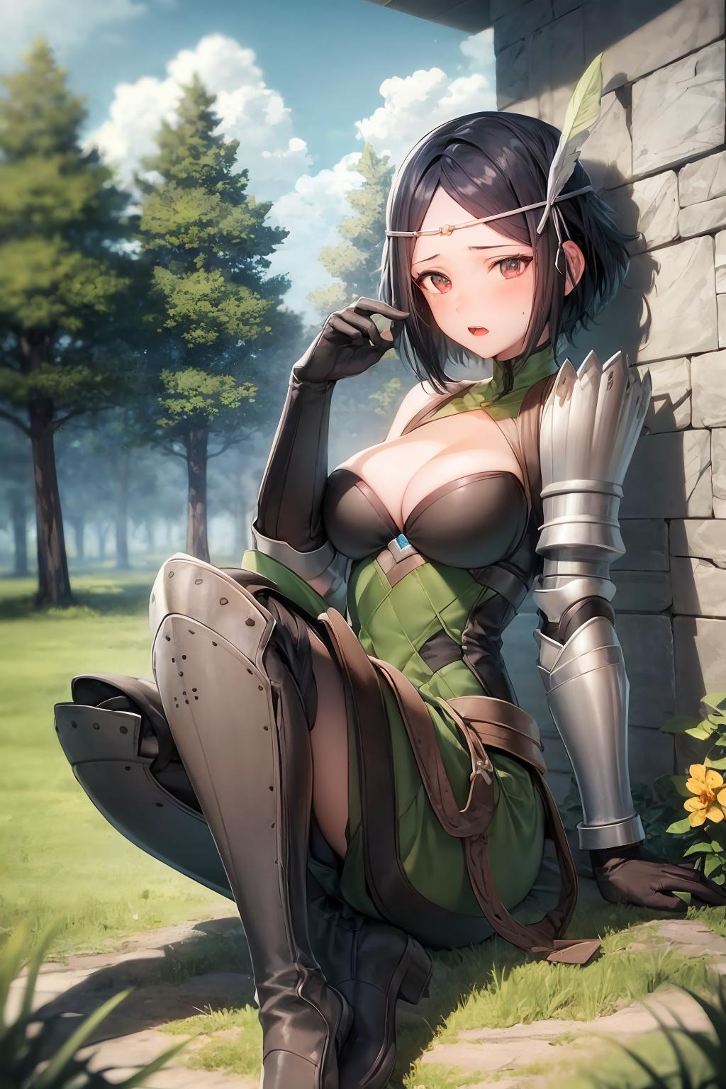 Her default clothes are noirefe, gloves, cleavage, feather hair ornament, circlet, armor, boots