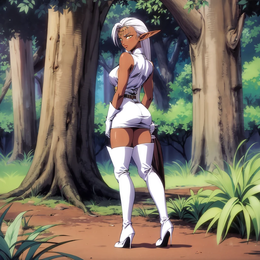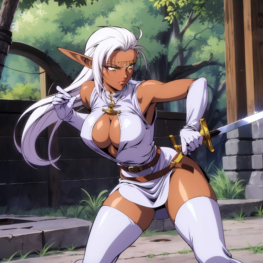 Pirotess,1girl,elf,long hair,white hair,circlet,yellow eyes,dark skin,1990s (style),