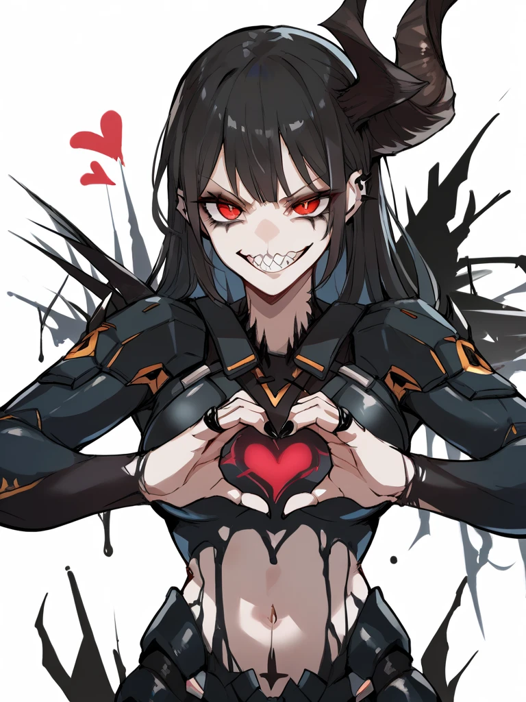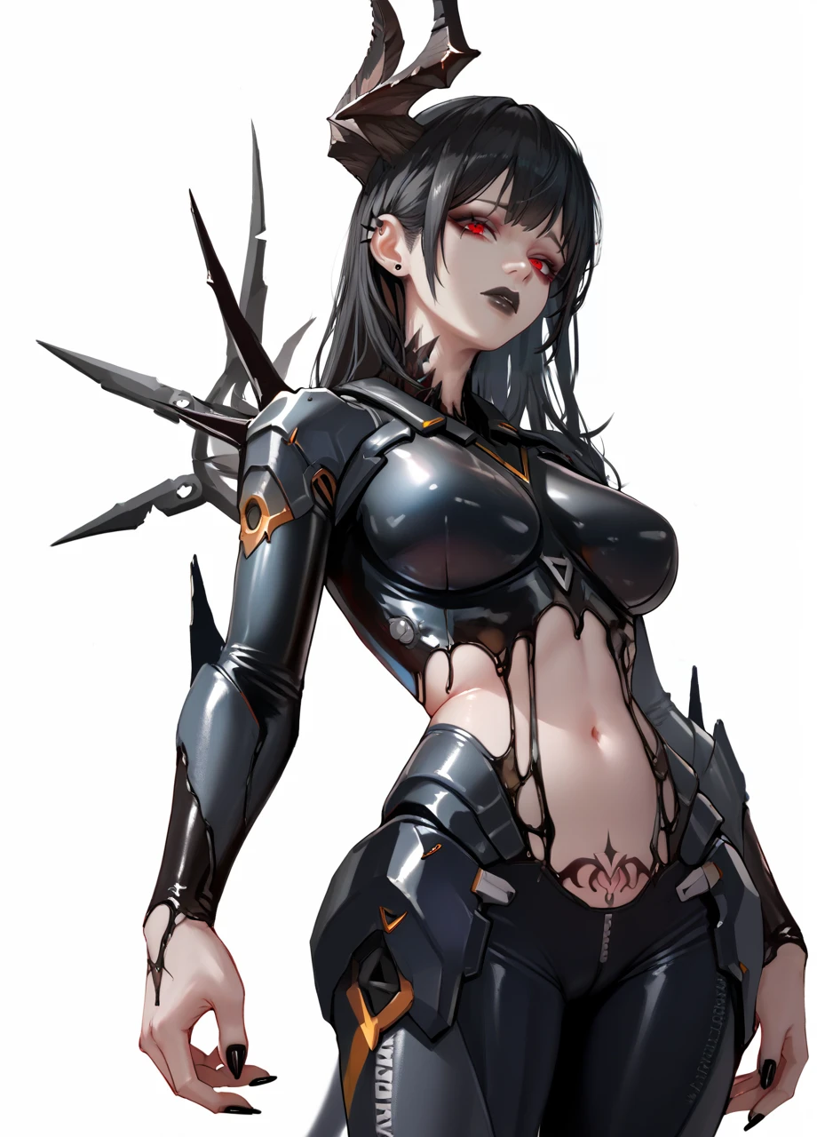 1girl, solo, nikkebehemoth, black hair, long hair, bangs, red eyes, black lips, black nails, horn, bodysuit, pubic tattoo