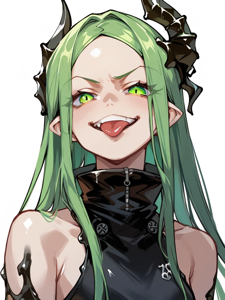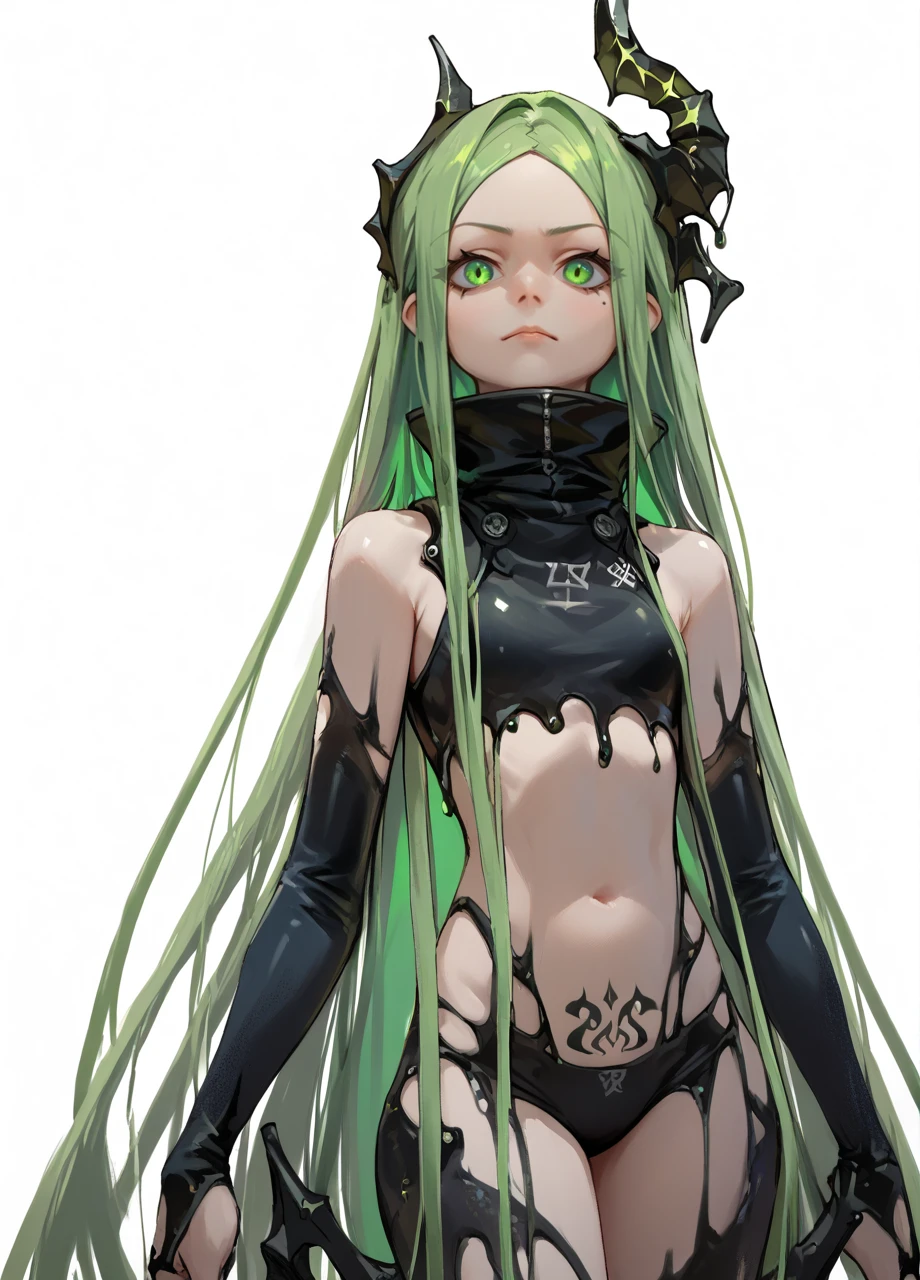 1girl, solo, nikkeleviathan, green hair, green eyes, slit pupils, very long hair, high collar, elbow gloves, navel tattoo