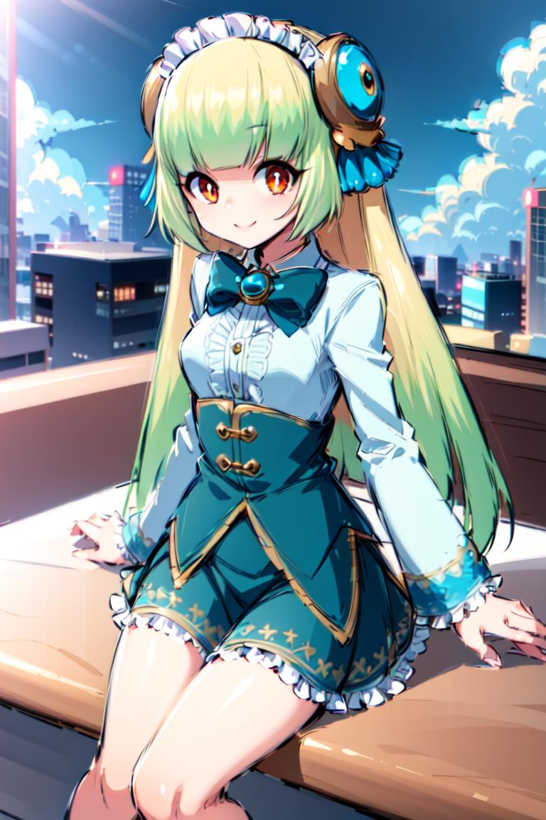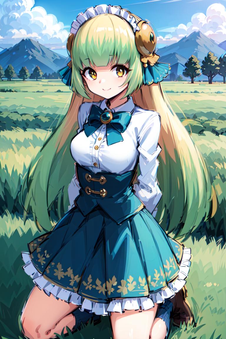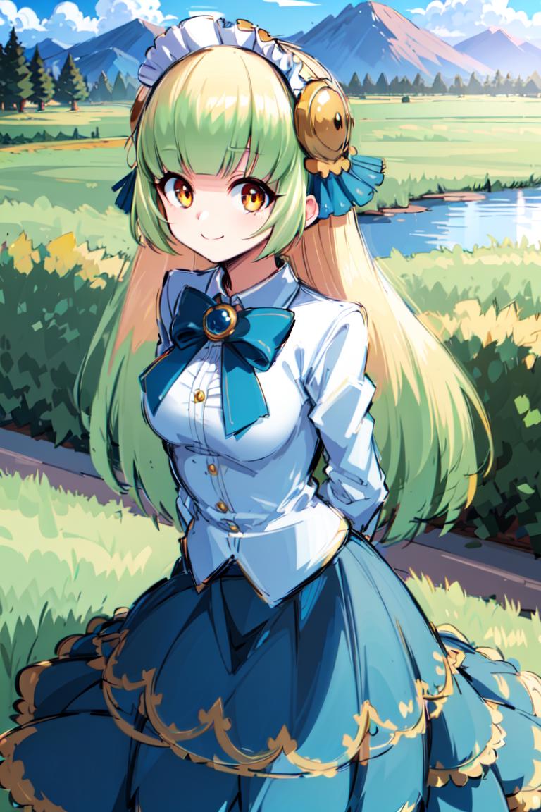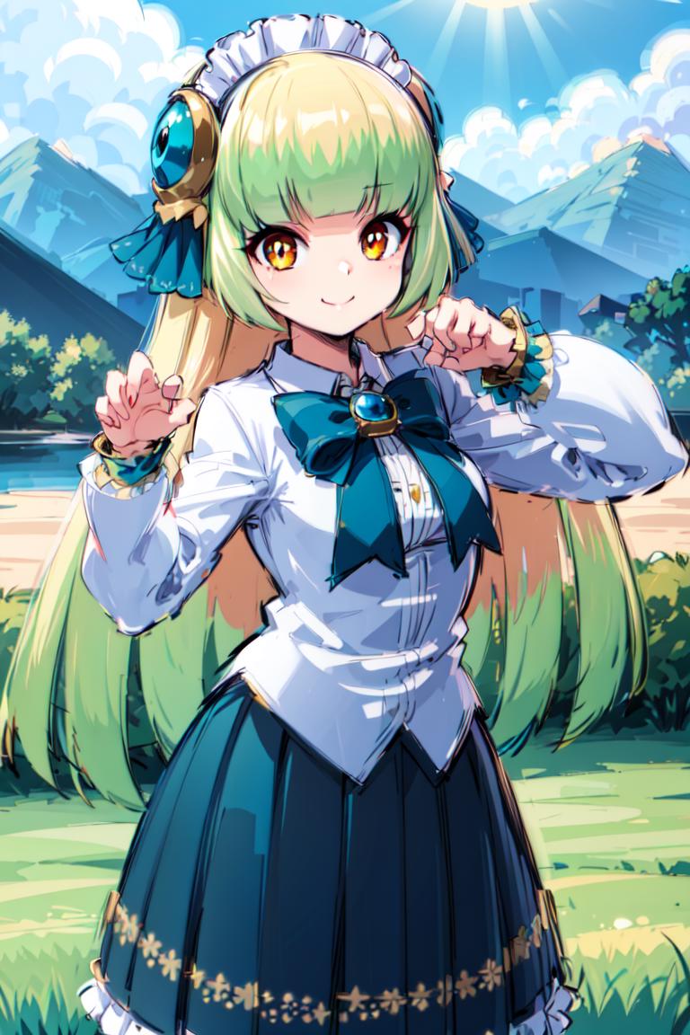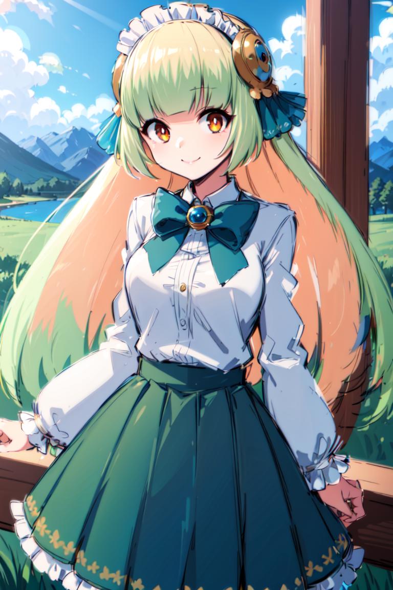 yue zi,1girl,solo,skirt,smile,outdoors,white shirt,bow,long sleeves,green skirt,blunt bangs,bowtie,closed mouth,green bow,pleated skirt,green bowtie,collared shirt,cowboy shot,frilled hairband,