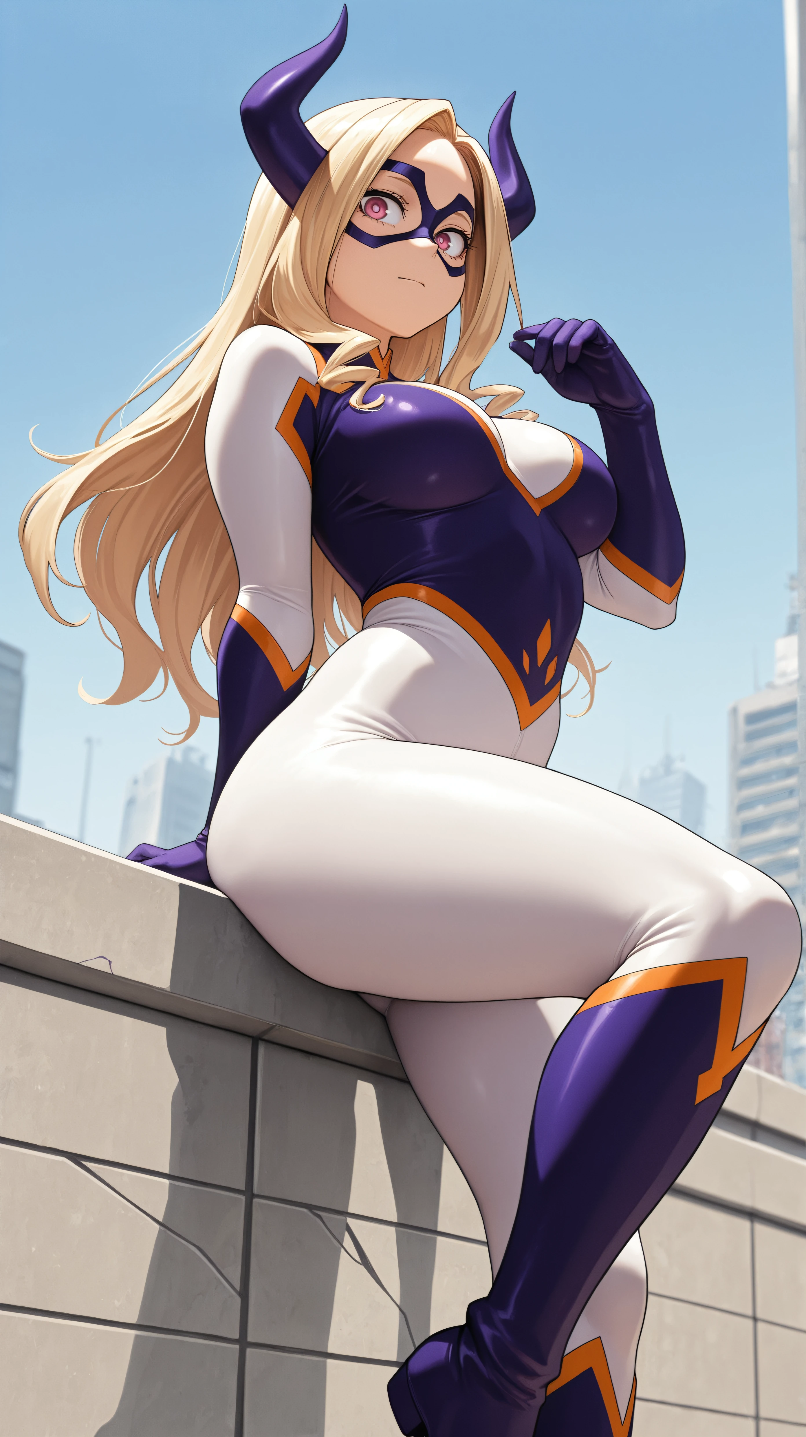 long hair, blonde hair, drill hair, pink eyes, domino mask, purple mask, purple horns, purple bodysuit, white bodysuit, multicolored bodysuit, skintight, purple glovesDescription