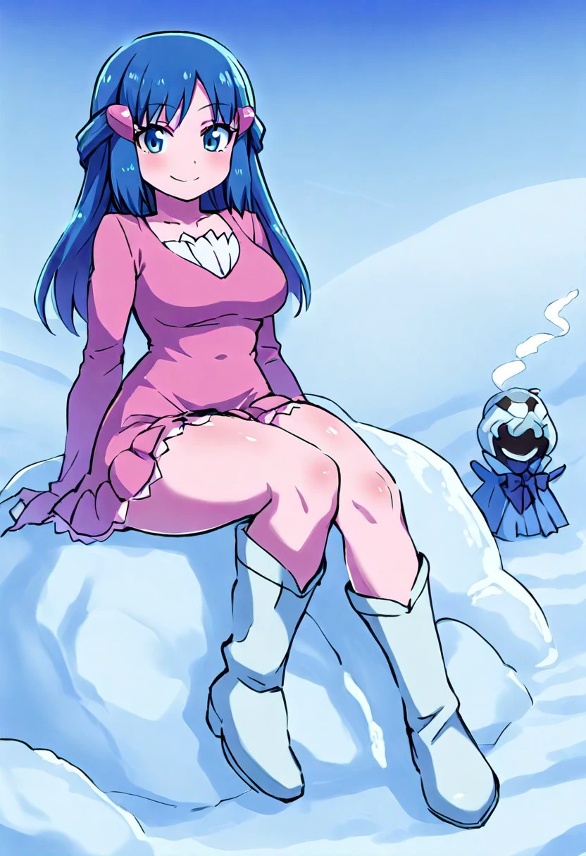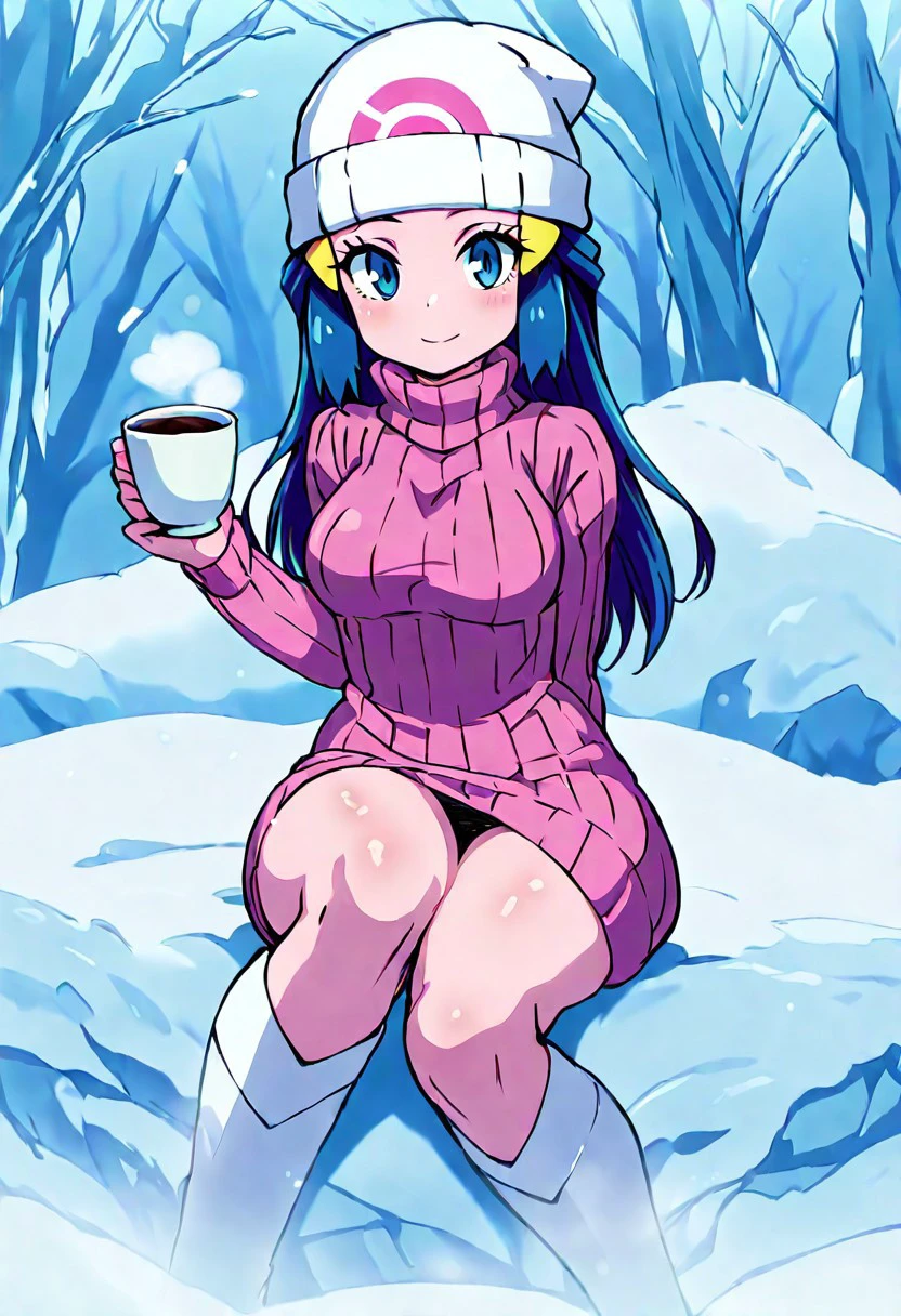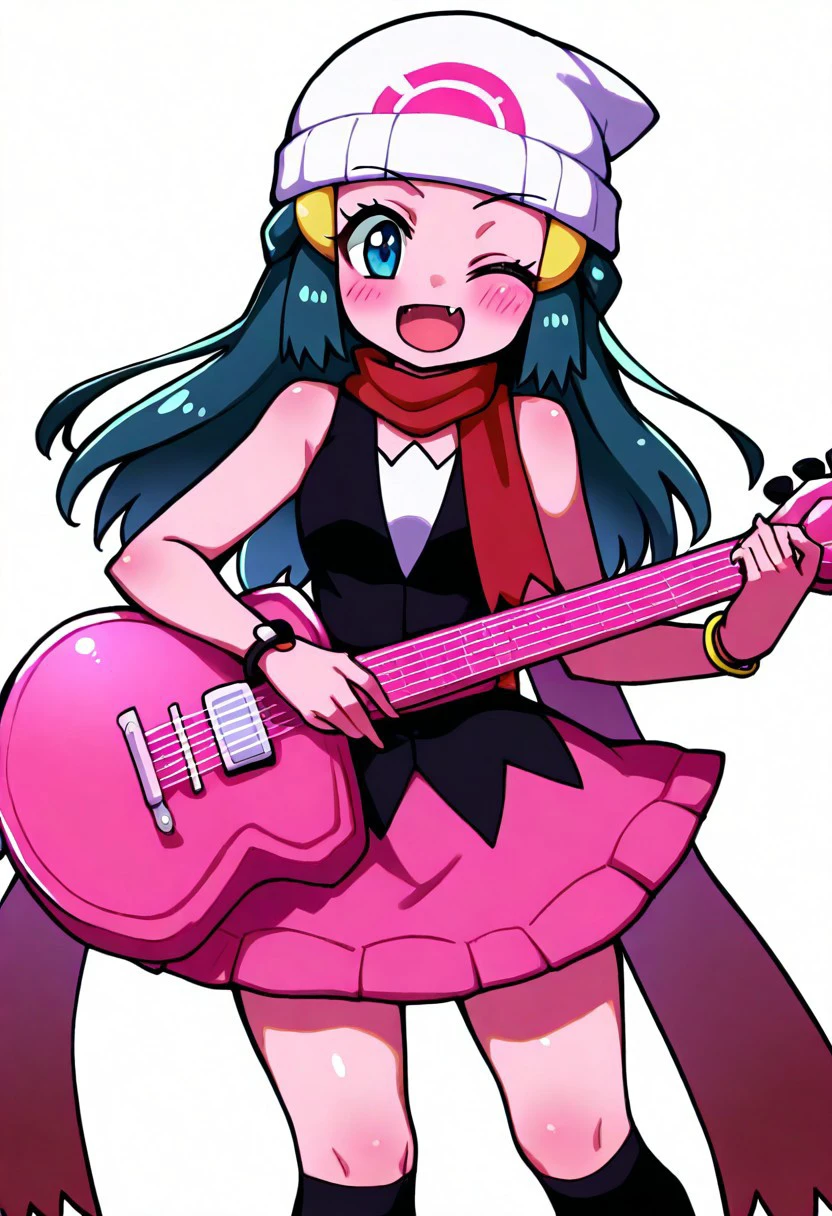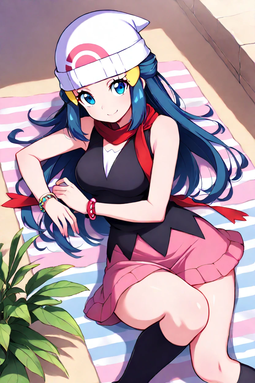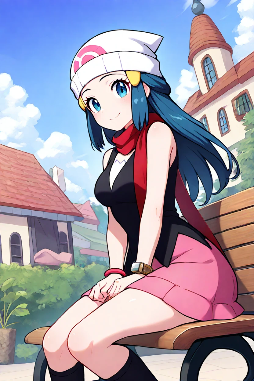 zzDawn, blue hair, blue eyes, sidelocks, long hair, bare shoulders, beanie, black shirt, black socks, bracelet, hat, jewelry, kneehighs, miniskirt, pink skirt, red scarf, scarf, shirt, skirt, sleeveless, sleeveless shirt, white headwear,