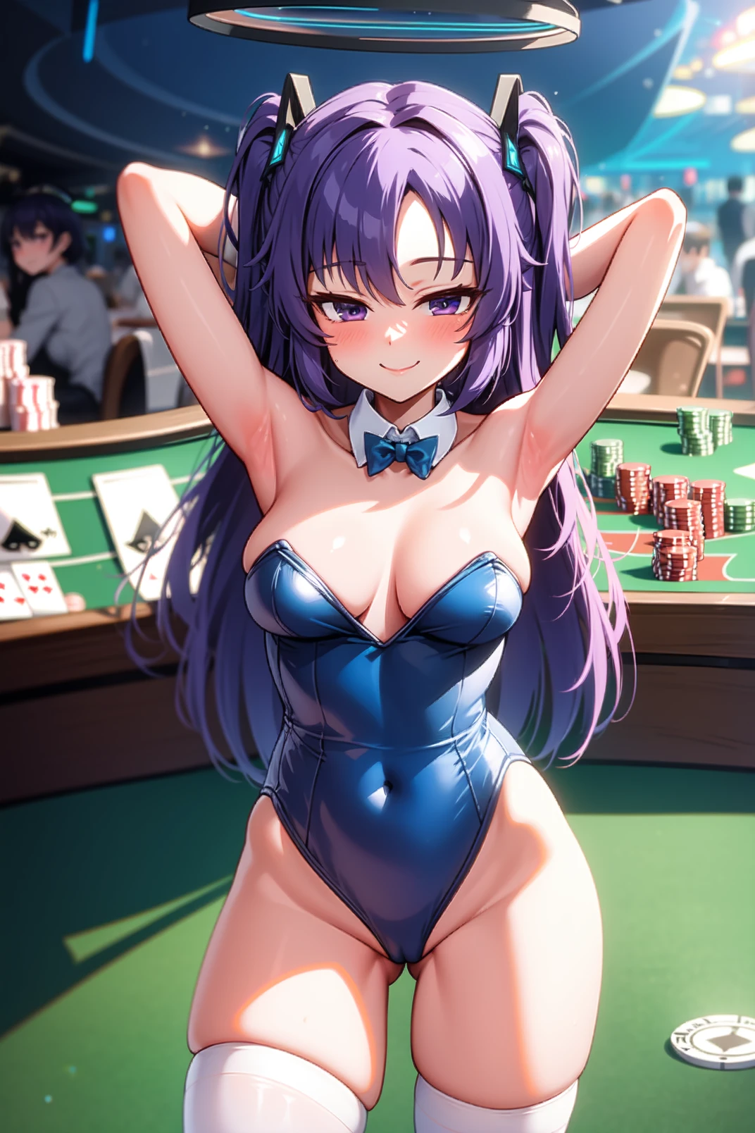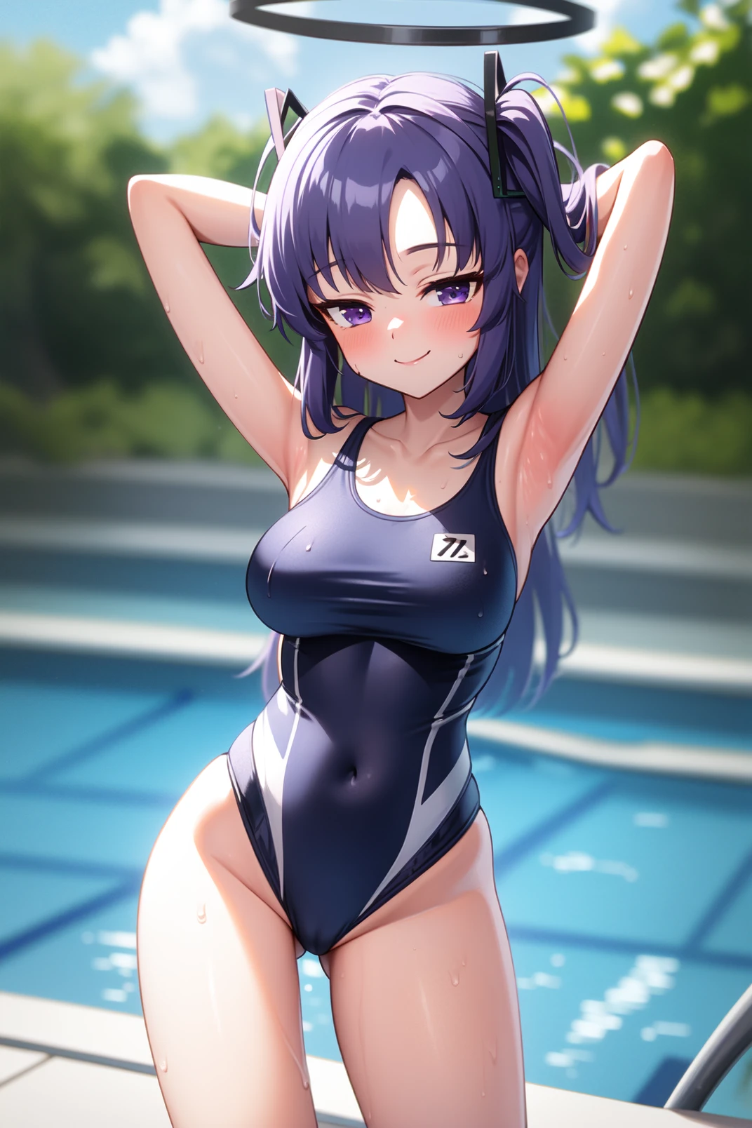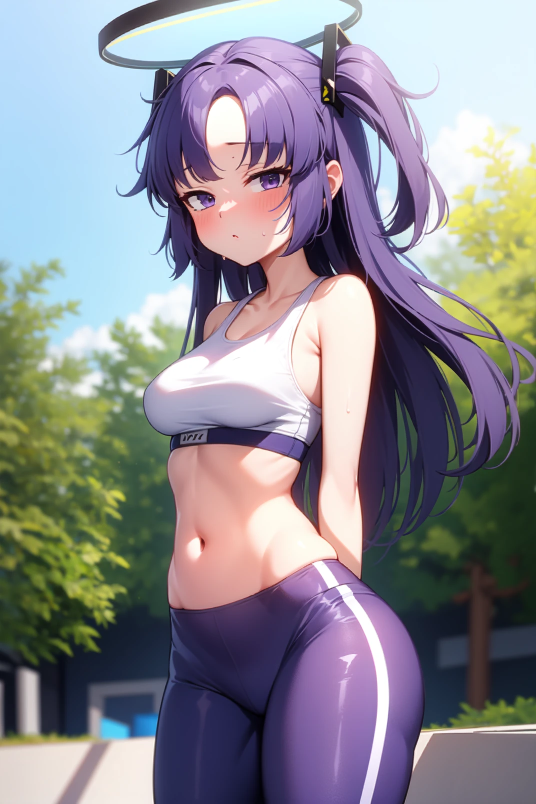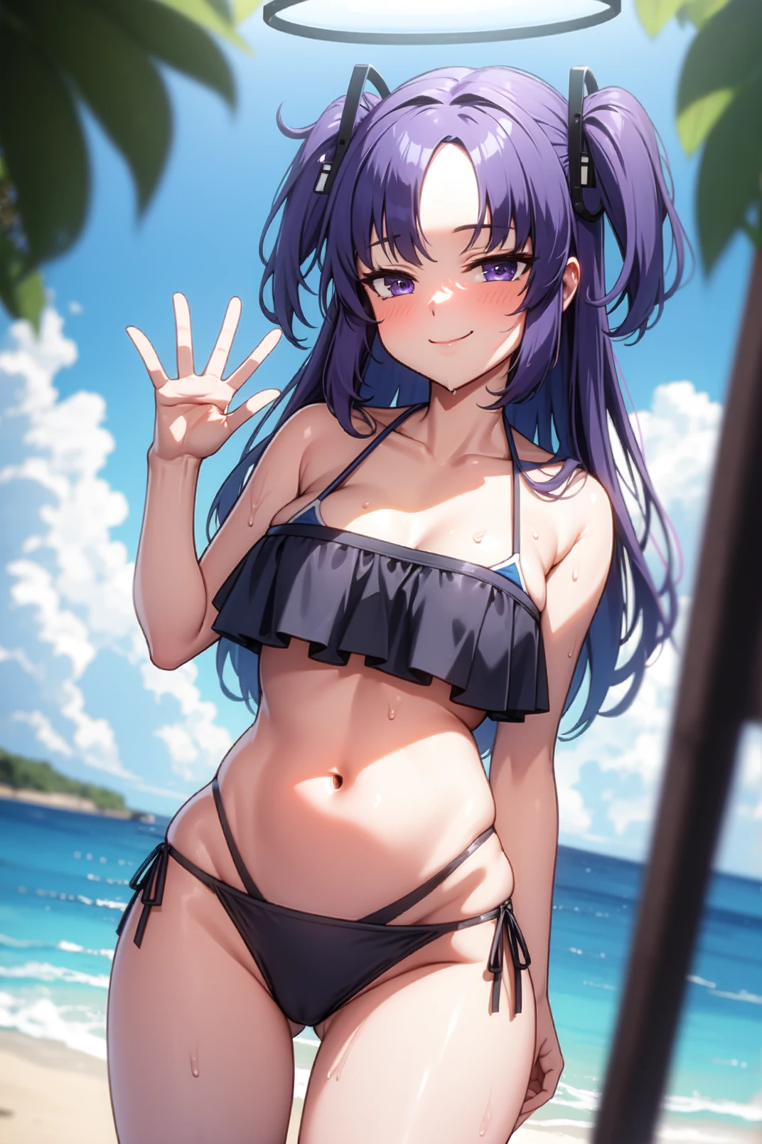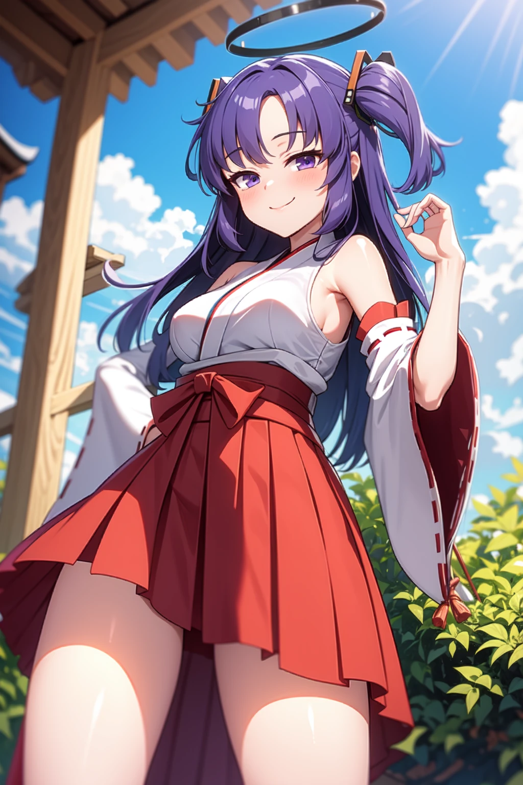 appearance: yuuka, purple eyes, purple hair, long hair, two side up, parted bangs, hair ornament, halo