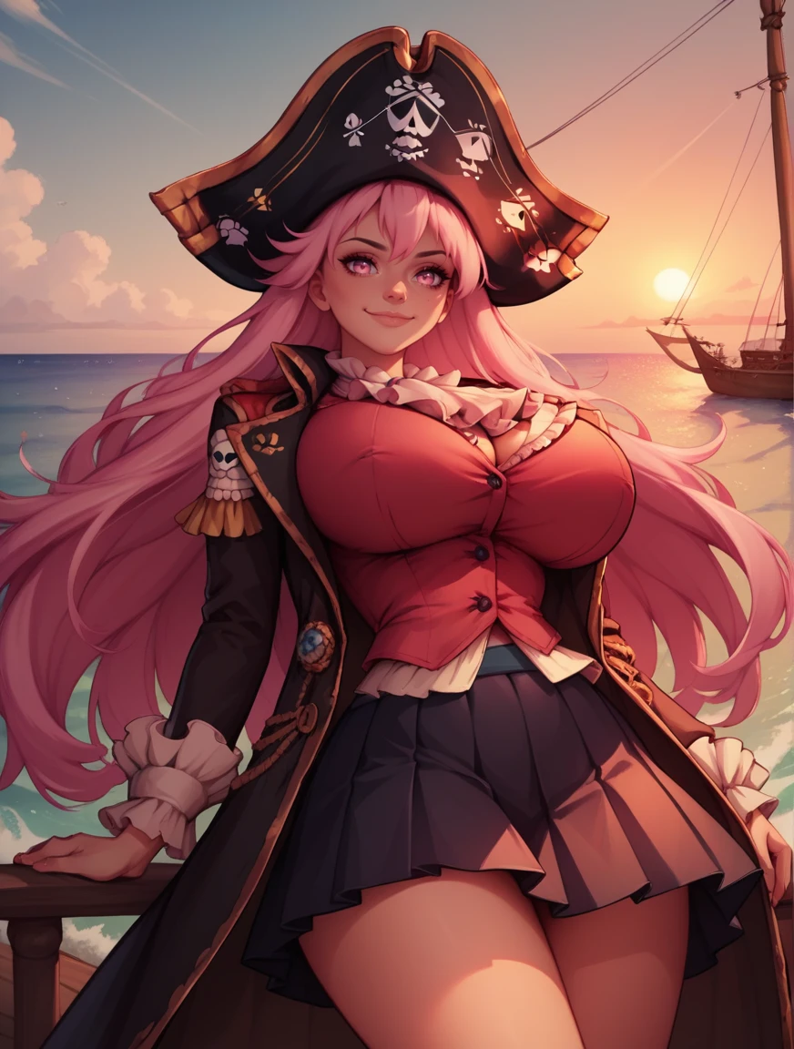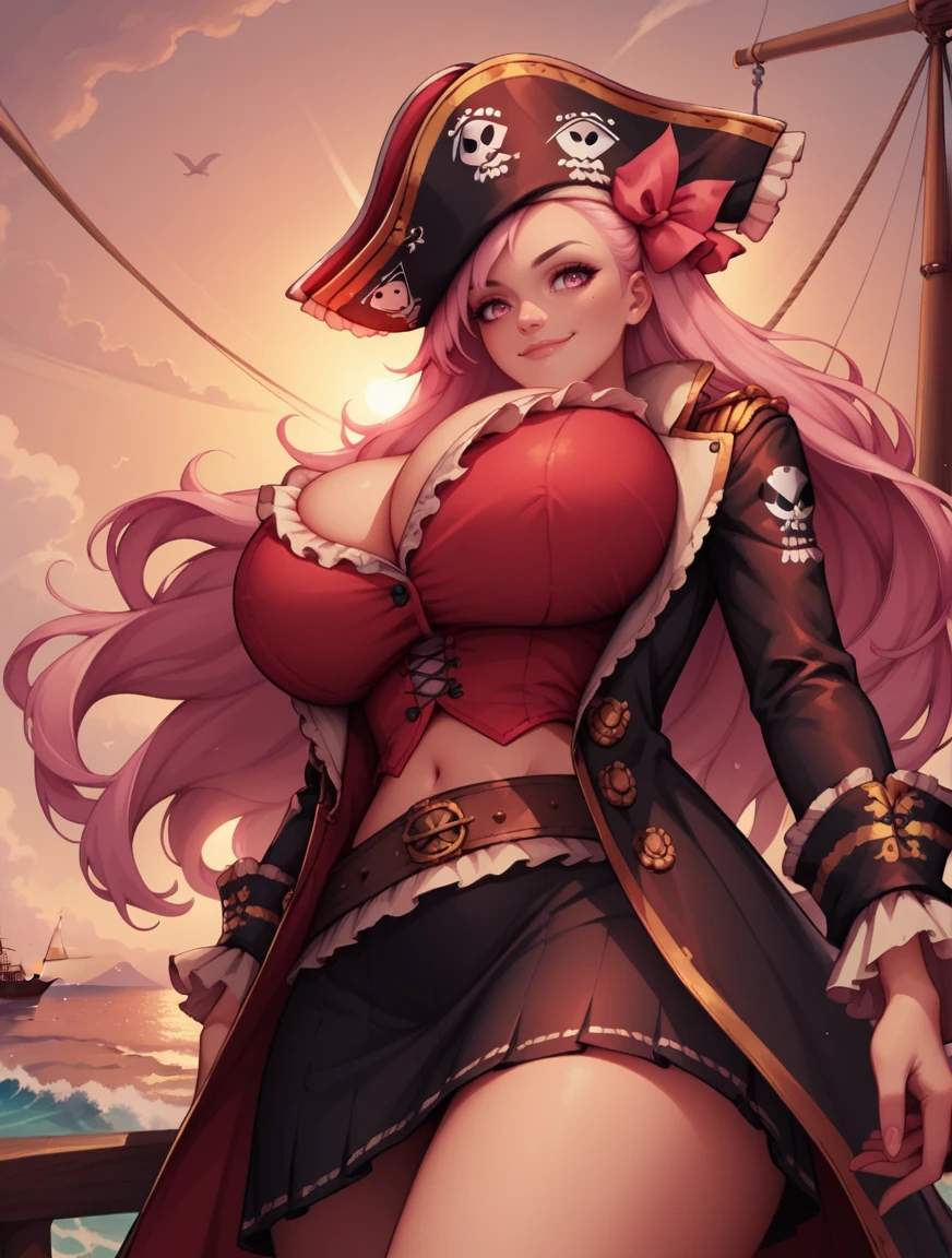 red bustier, frills,open coat, black coat,black_skirt, pleated skirt, midriff, pirate hat, skull and crossed swords, ascot,