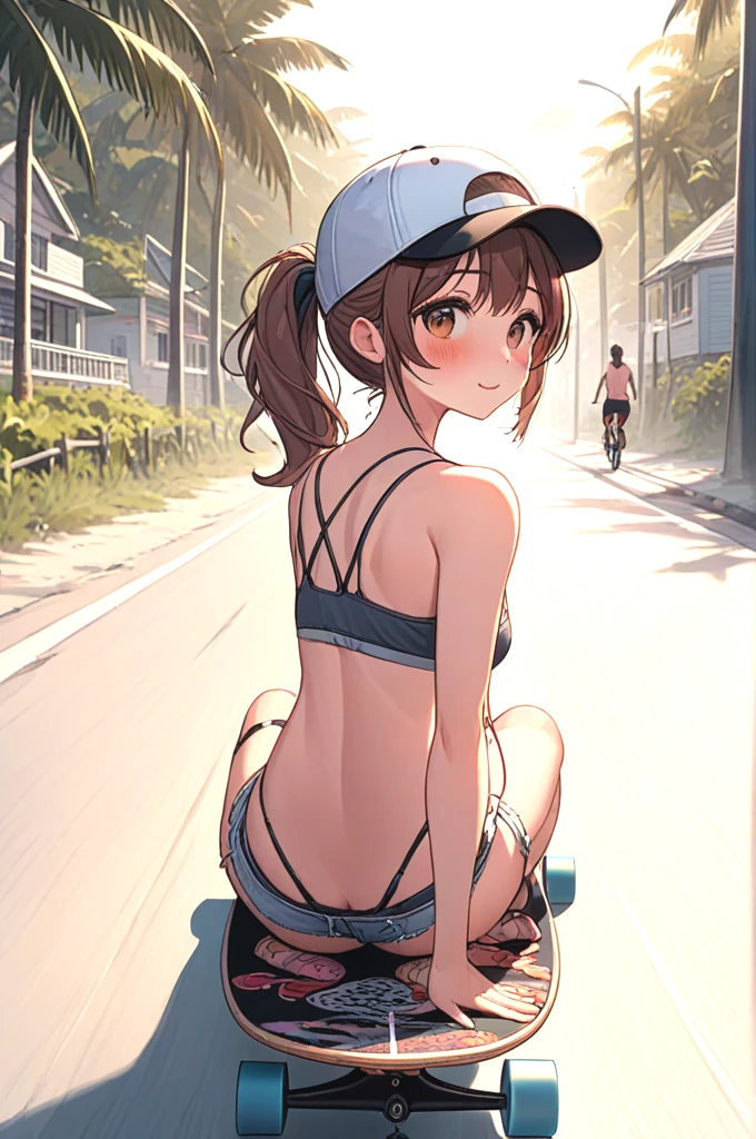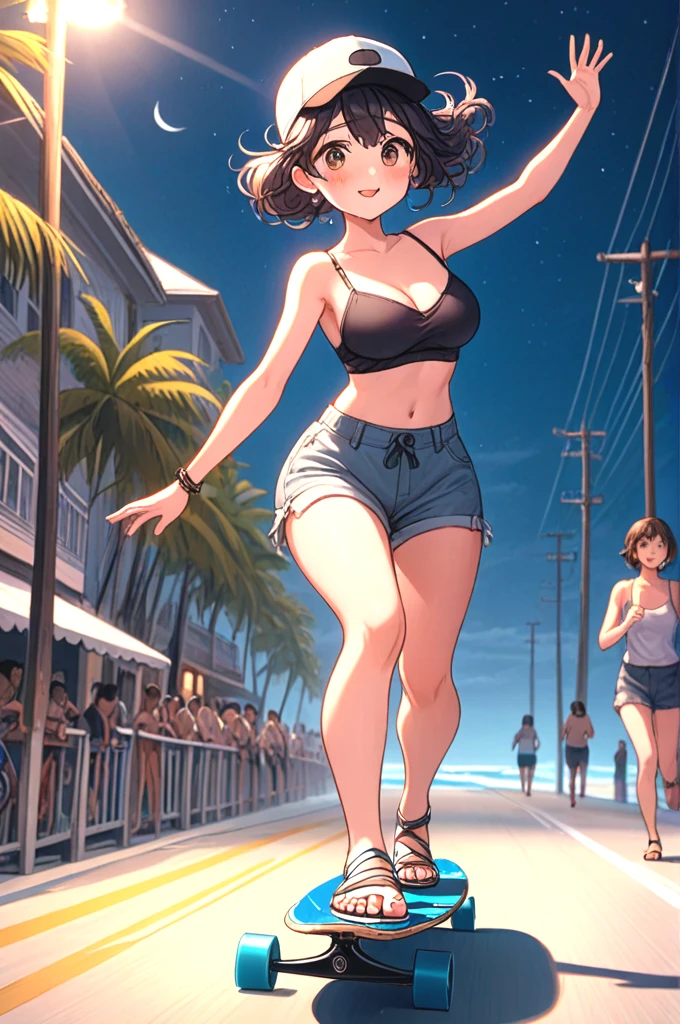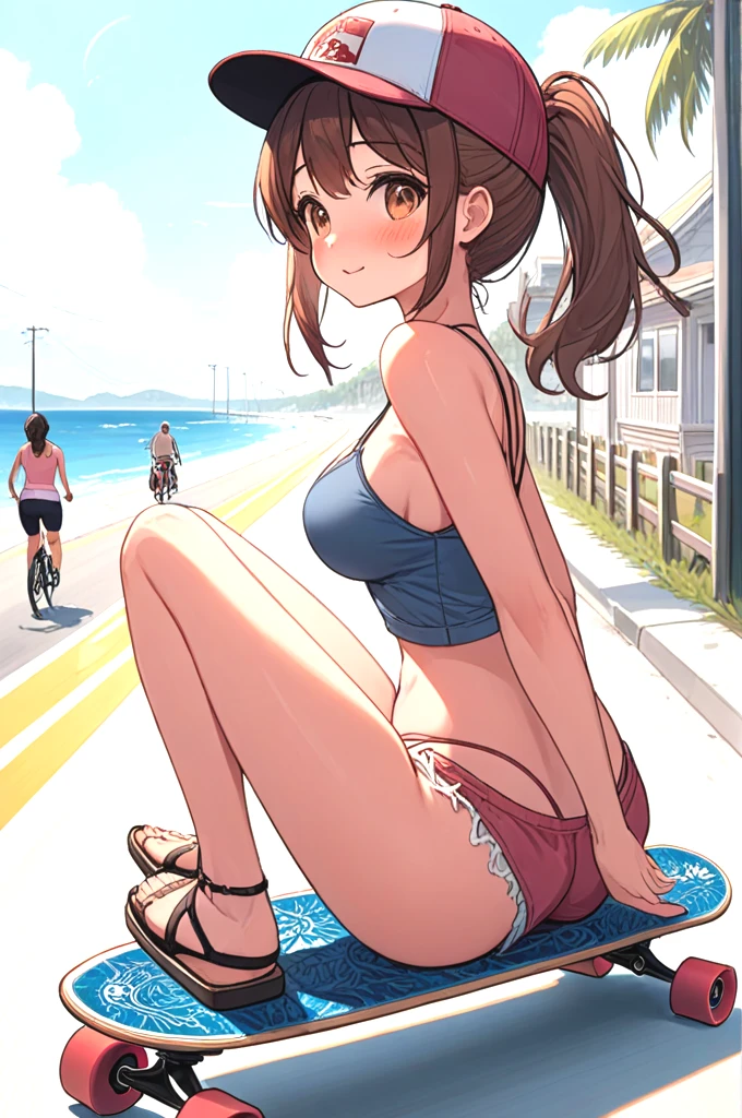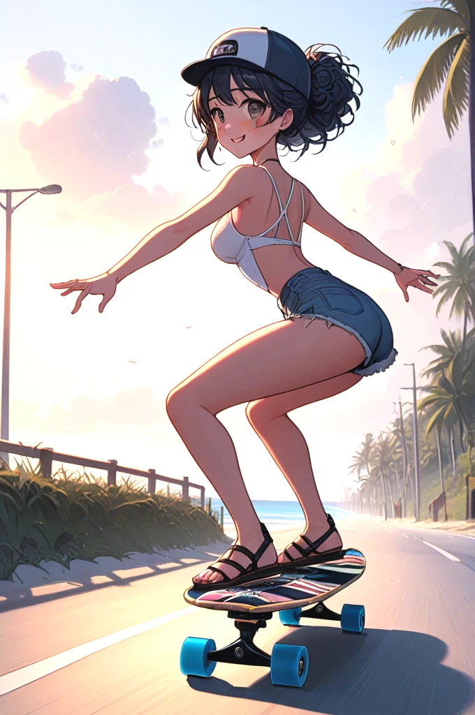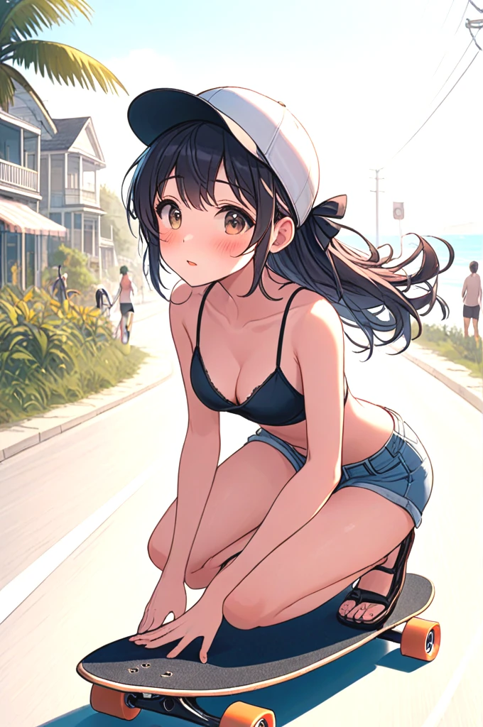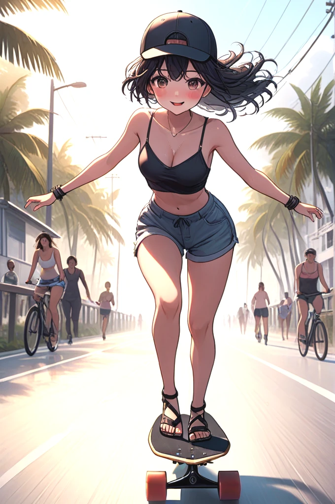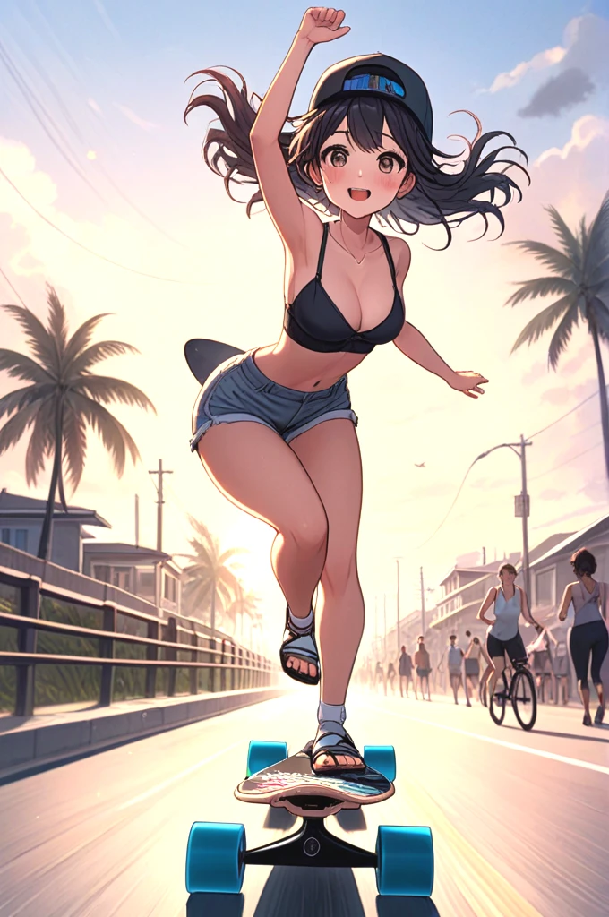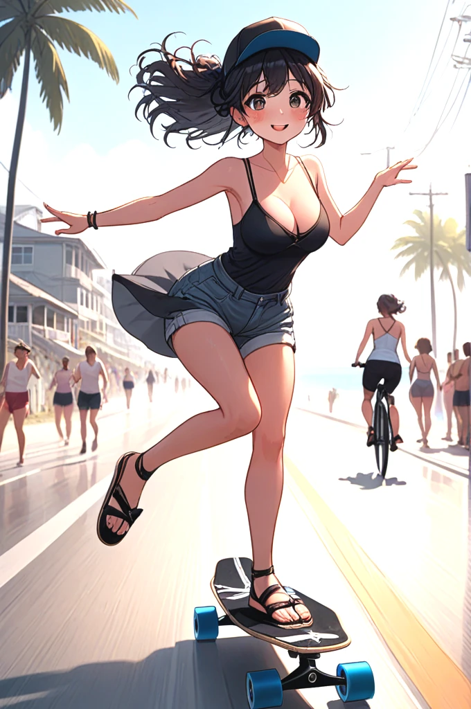 ((profile)), ((longboard)), ((dancing)), ((raise legs)), outstretched arms, backwards hat, strap bra, camisole, cutoffs, sandals, floating hair, sky, ocean, beach, bicycle, jogging, crowd,
