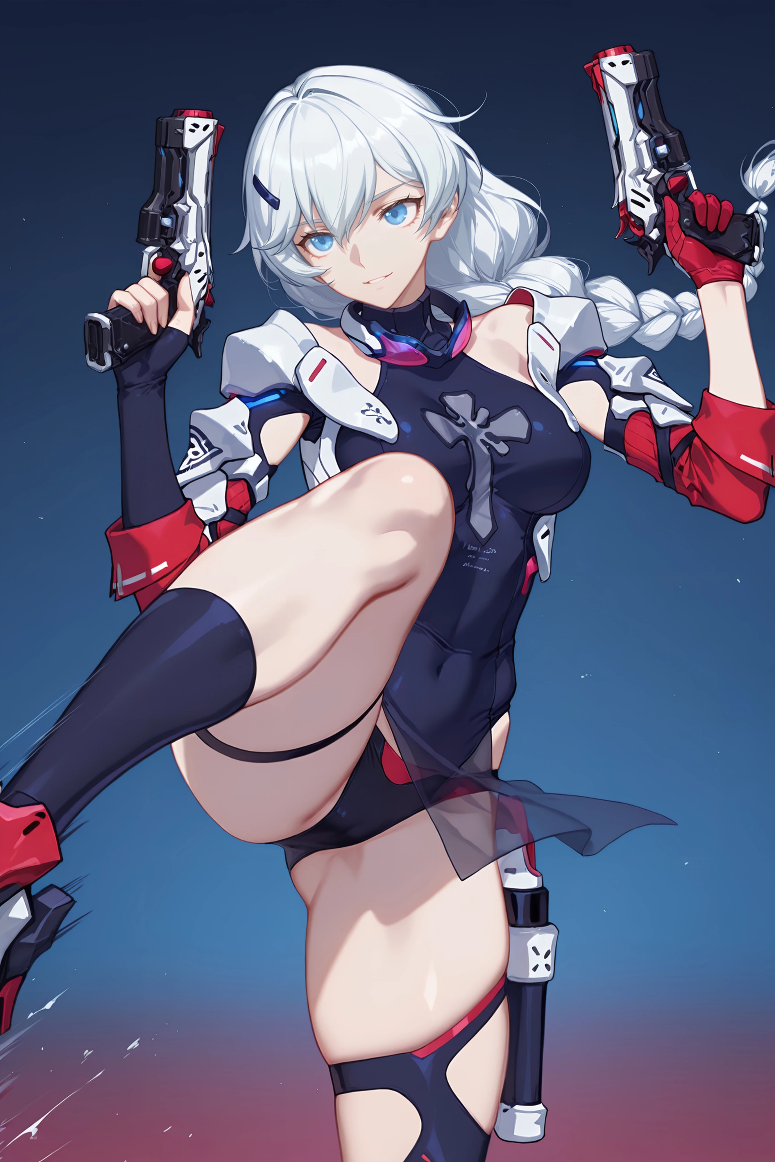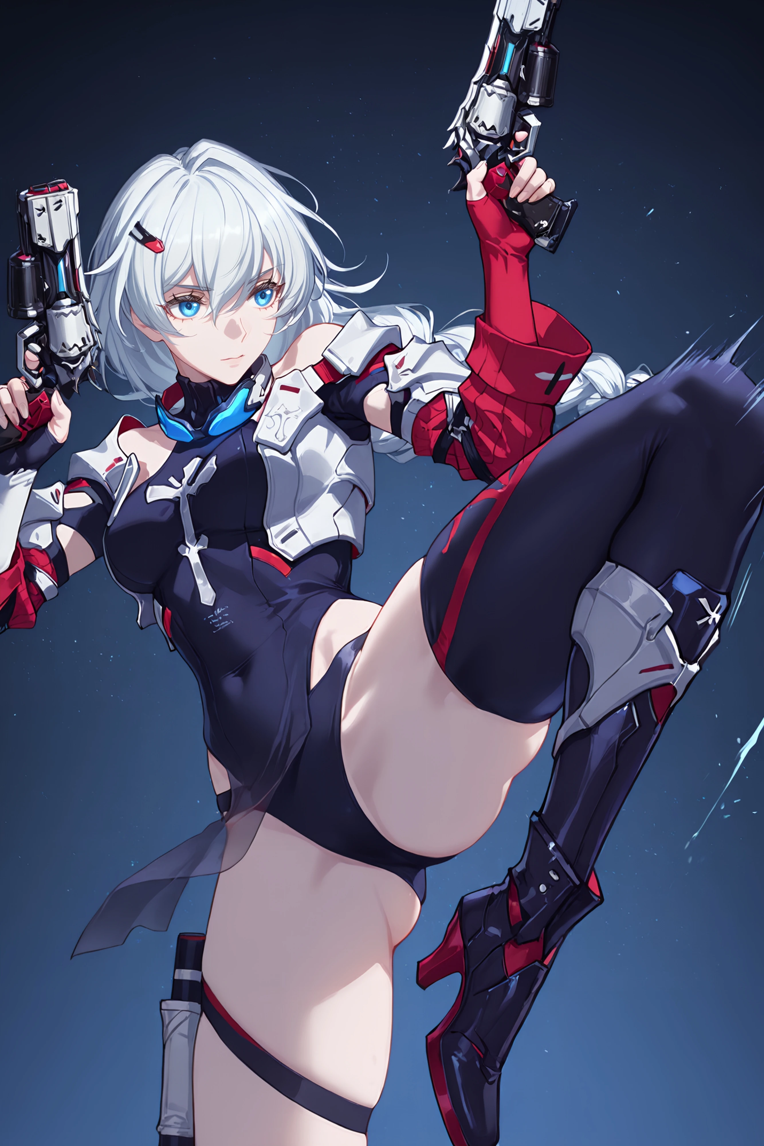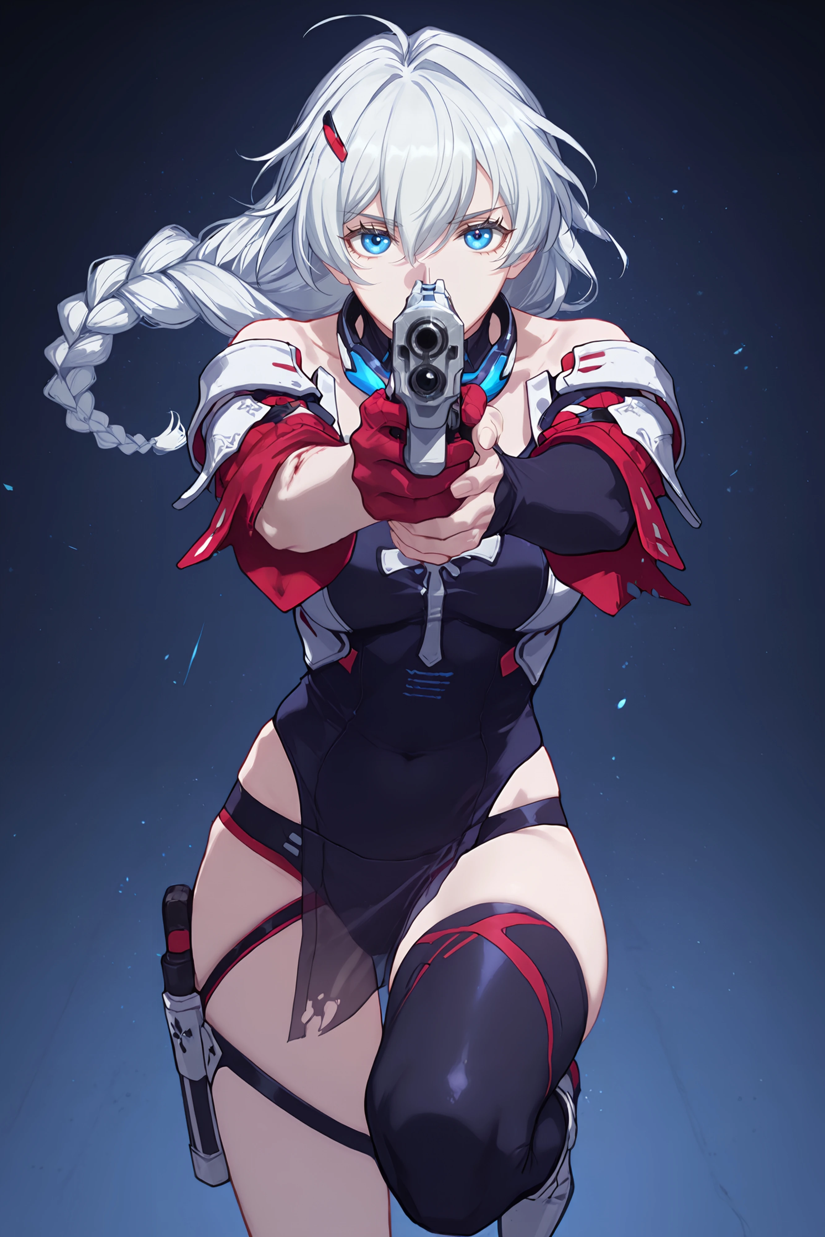 Kallen-ritualimayoh,white hair,long hair,bangs,hair between eyes,blue eyes,single braid,braided ponytail,long braid,hairclip, goggles around neck, shoulder armor, bare shoulders, black leotard, armored leotard, sleeveless turtleneck leotard, cross print, grey cross, white armor, red trim, armored sleeves, black sleeves, red sleeve cuffs, mismatched gloves, black single fingerless glove, single elbow glove,red single glove, see-through, see-through pelvic curtain, short pelvic curtain, black panties, asymmetrical legwear, black thighhighs, single thighhigh, thigh holster, single sock, high heel boots, armored boots,Description