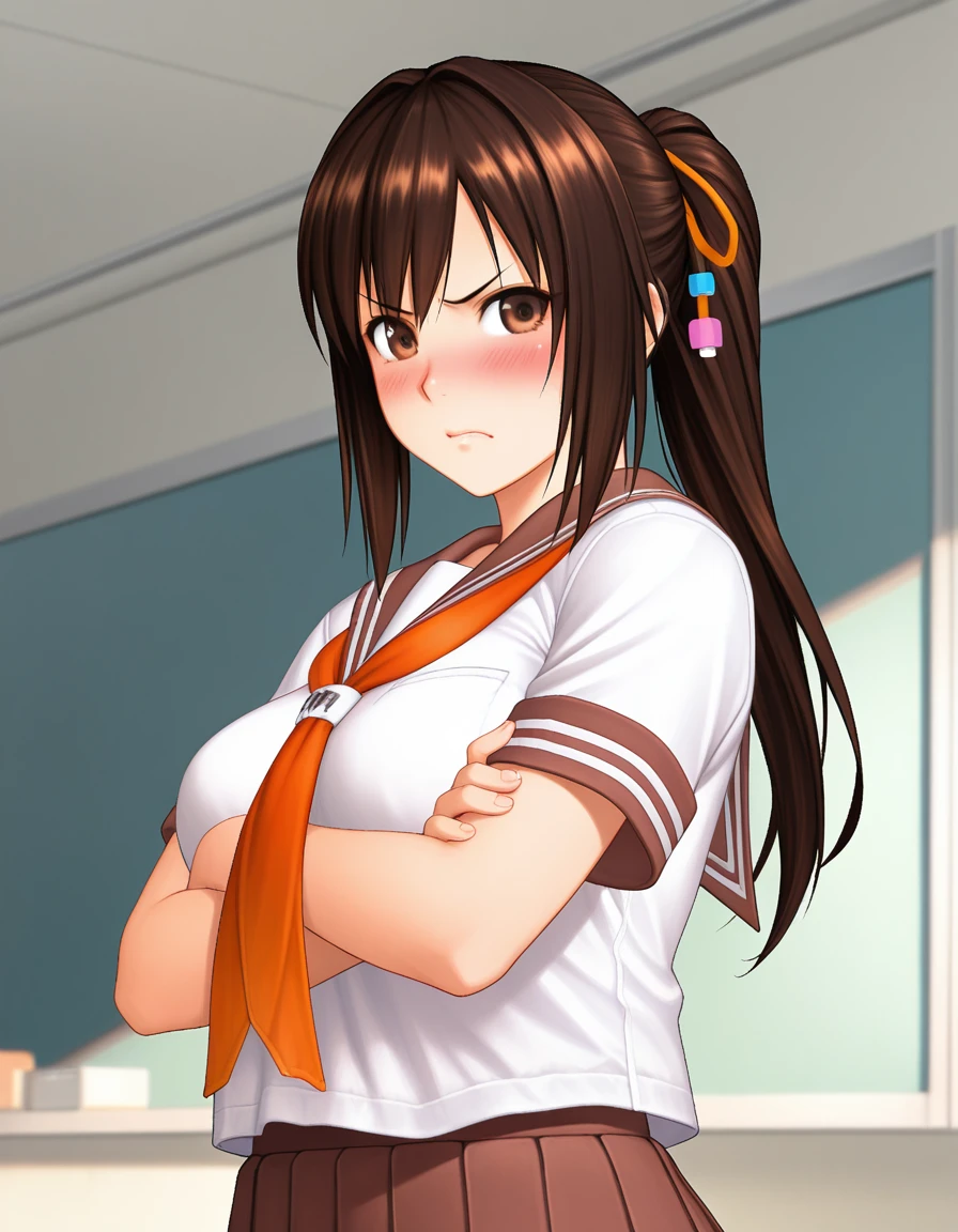 Trigger word: 1girl, rpkaoi, large breasts, brown hair, brown eyes, hair ribbon, hair rings, ponytail,
