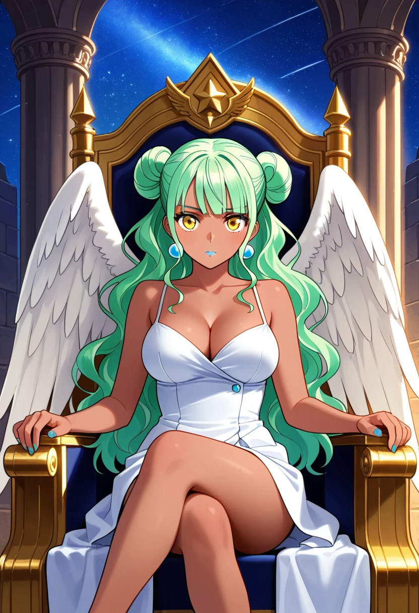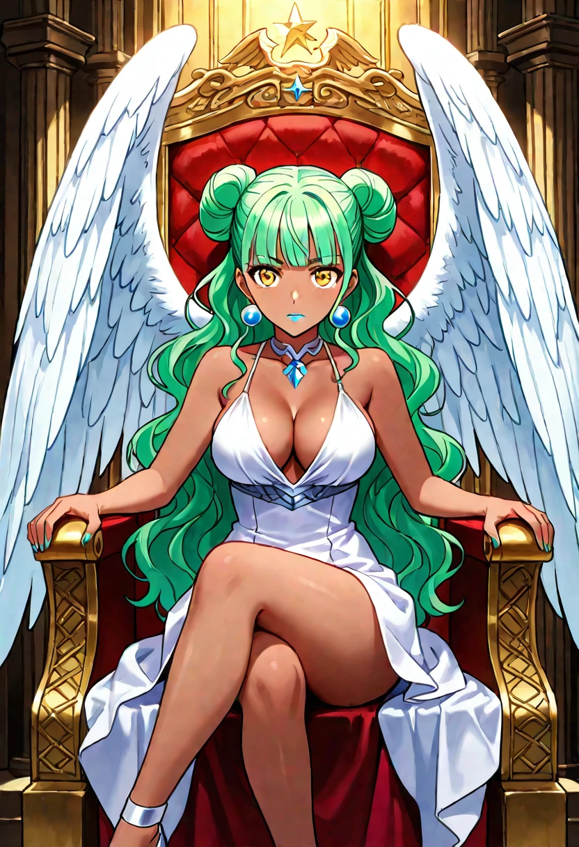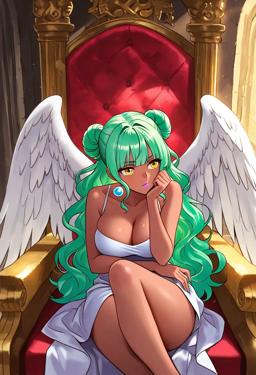 Nemesis, green long hair, hair buns, wavy hair, bangs, sidelocks, yellow eyes, earrings, lipstick, ((dark skin)), ((angel wings)), cleavage, white peplos,