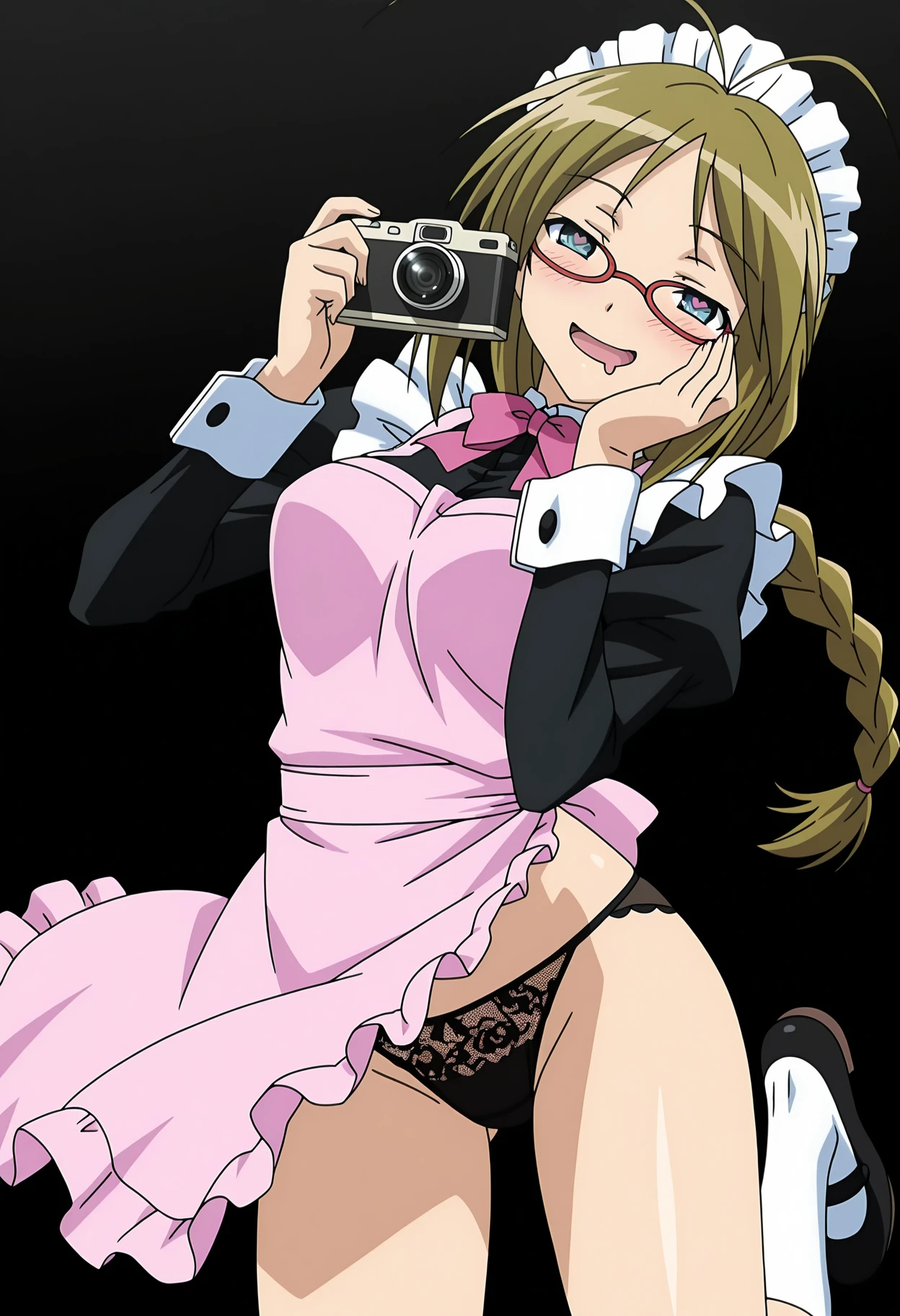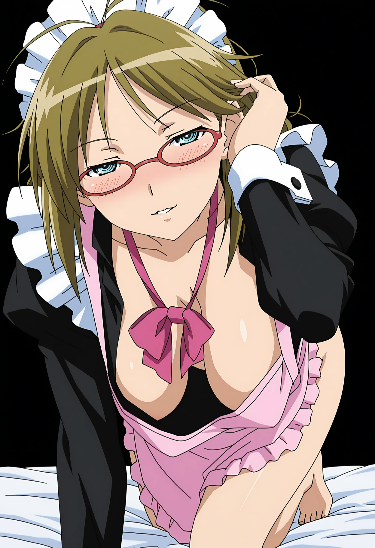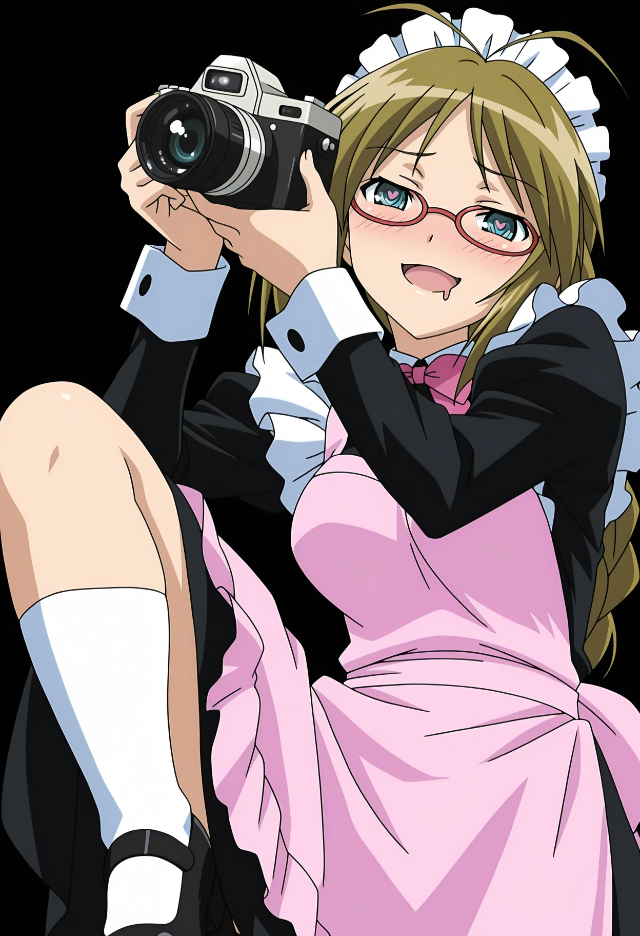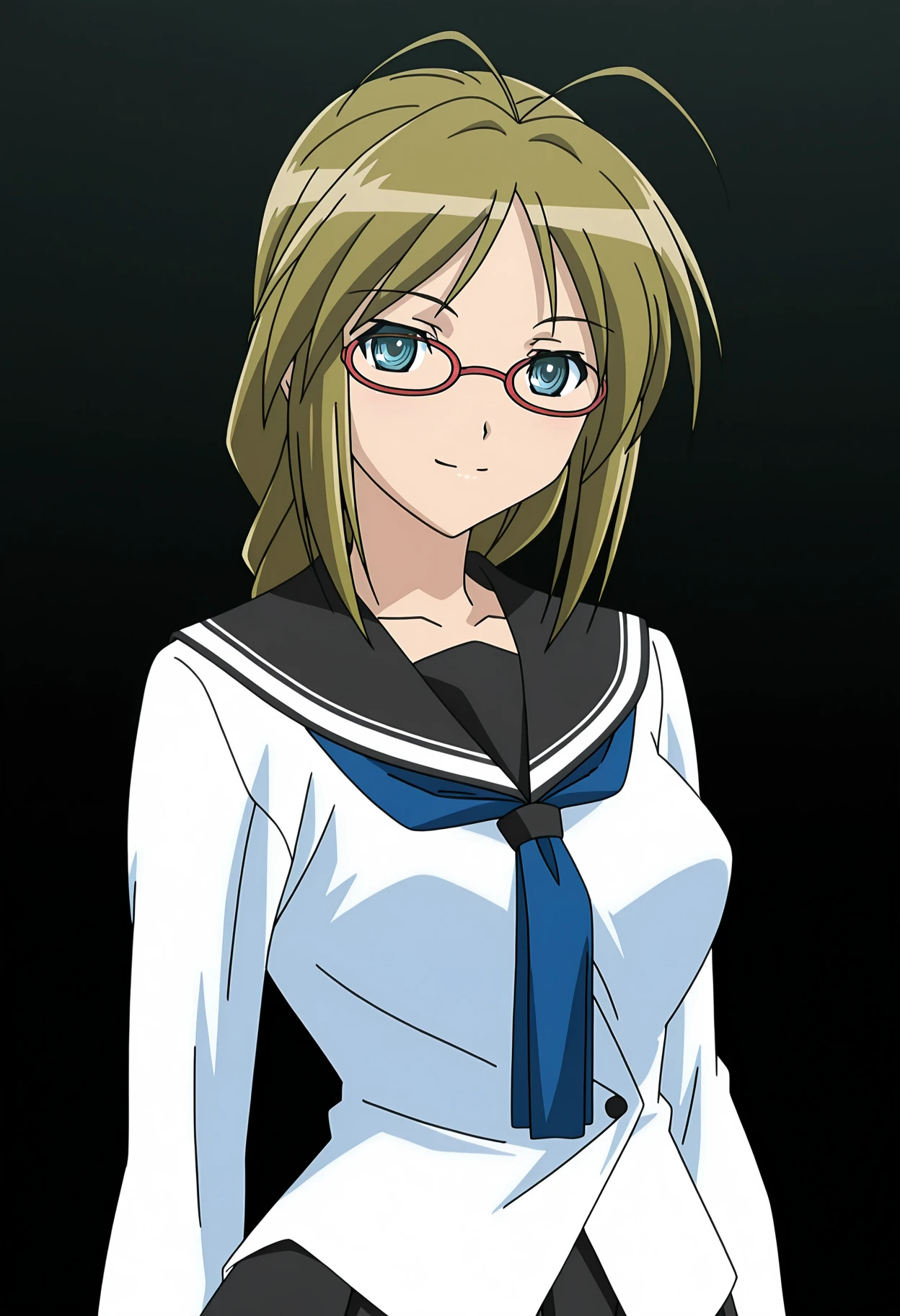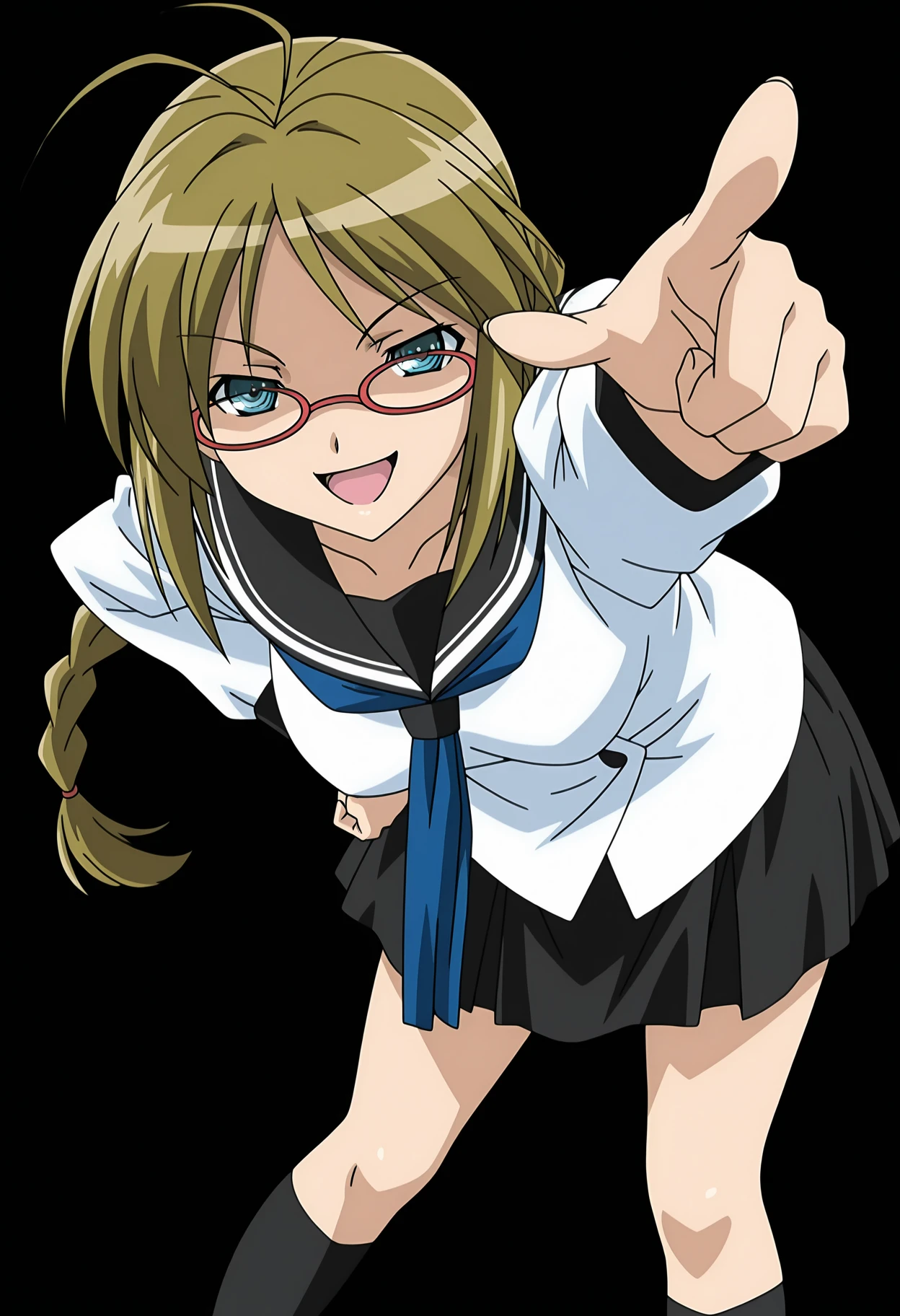 1girl, class rep, long hair, brown hair, braid, antenna hair, blue eyes, glasses, red-framed eyewear, medium breasts