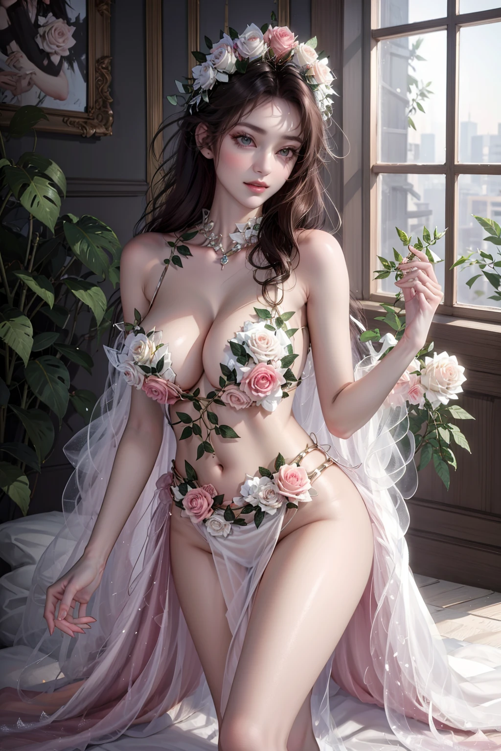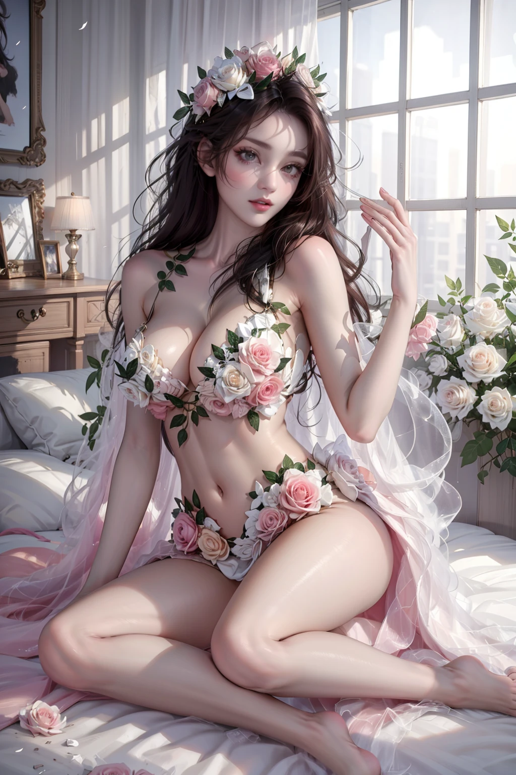 提示词:future005,Bare shoulders,see-through dress,Hair accessories,leaf,Pinkflowers,Whiteroses,barefoot,