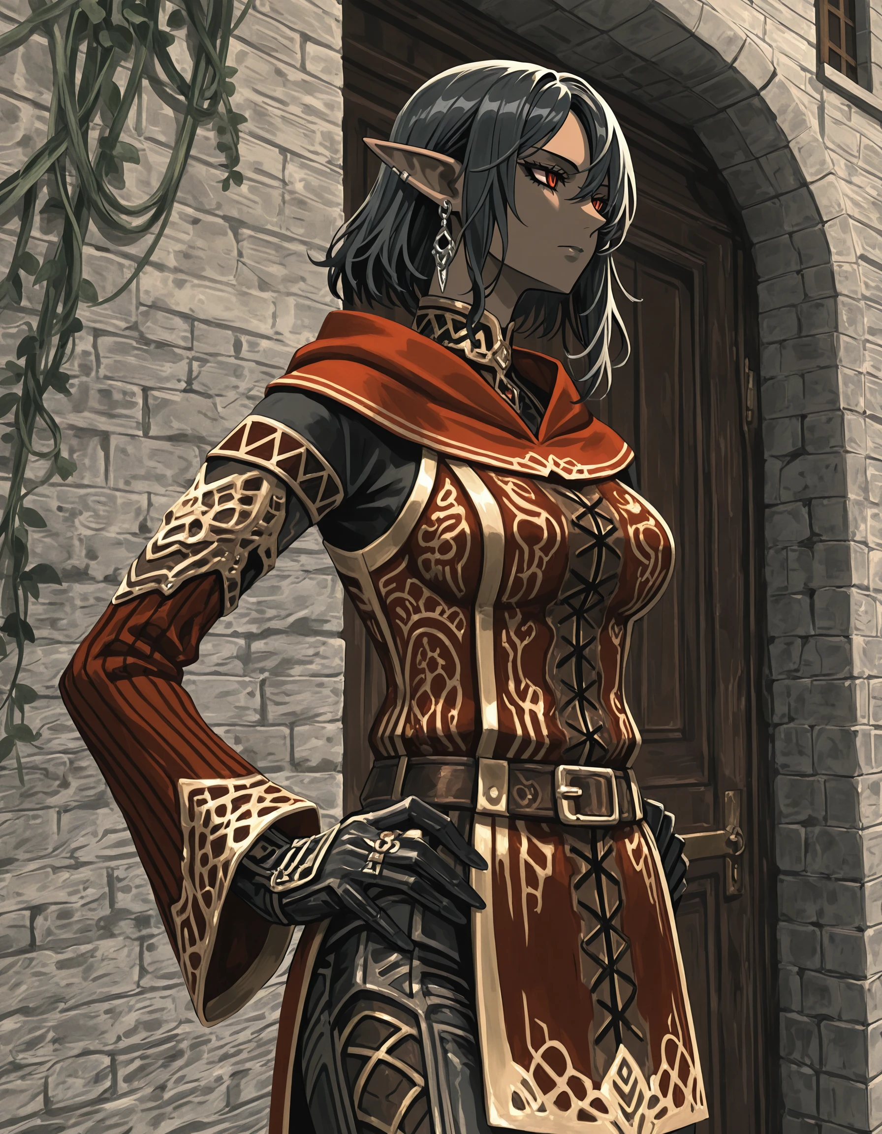 gold trim, patterned clothes, cross-laced clothes, criss-cross strings, layered sleeves, long sleeves, belt, belt pouch, hood, hood down,