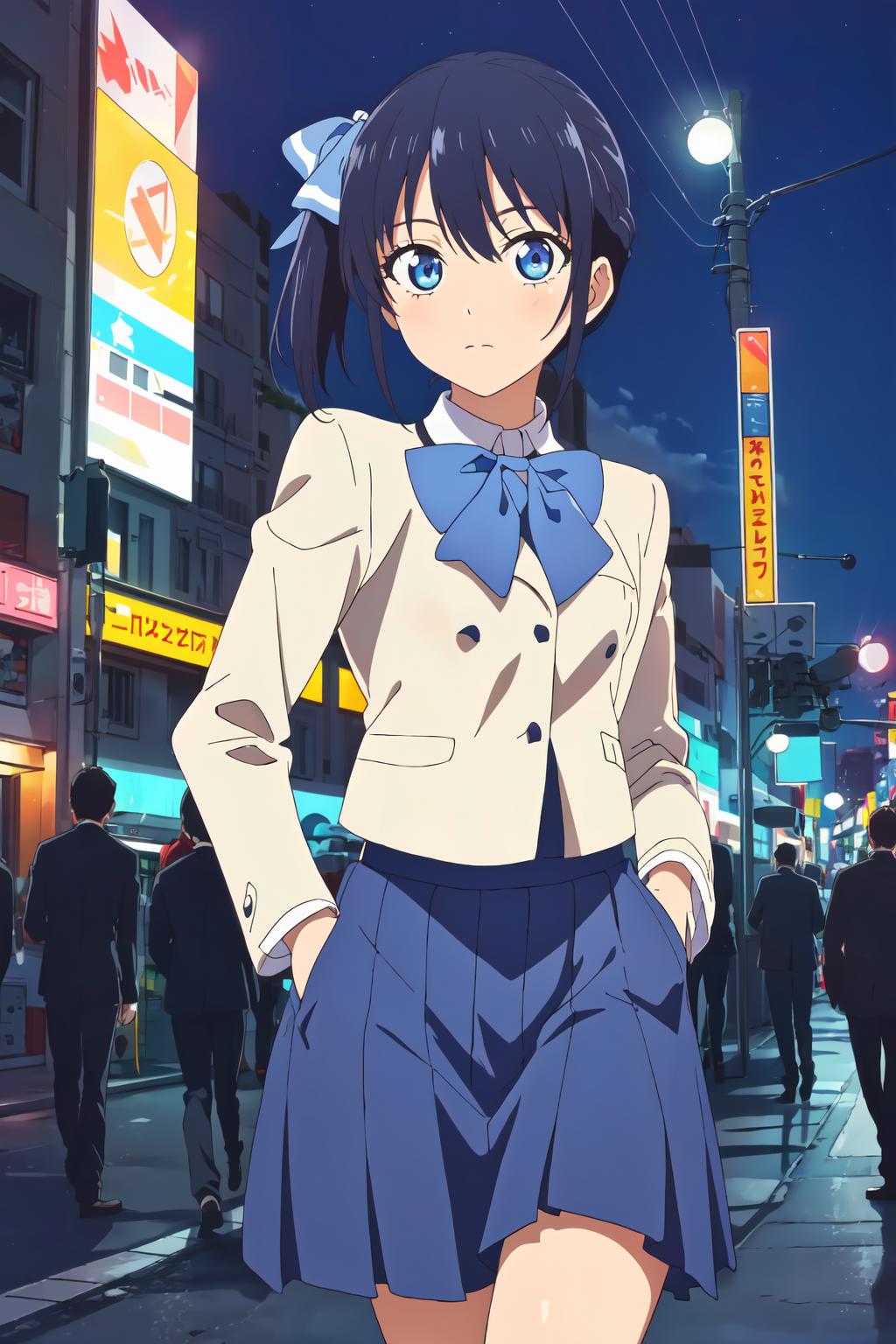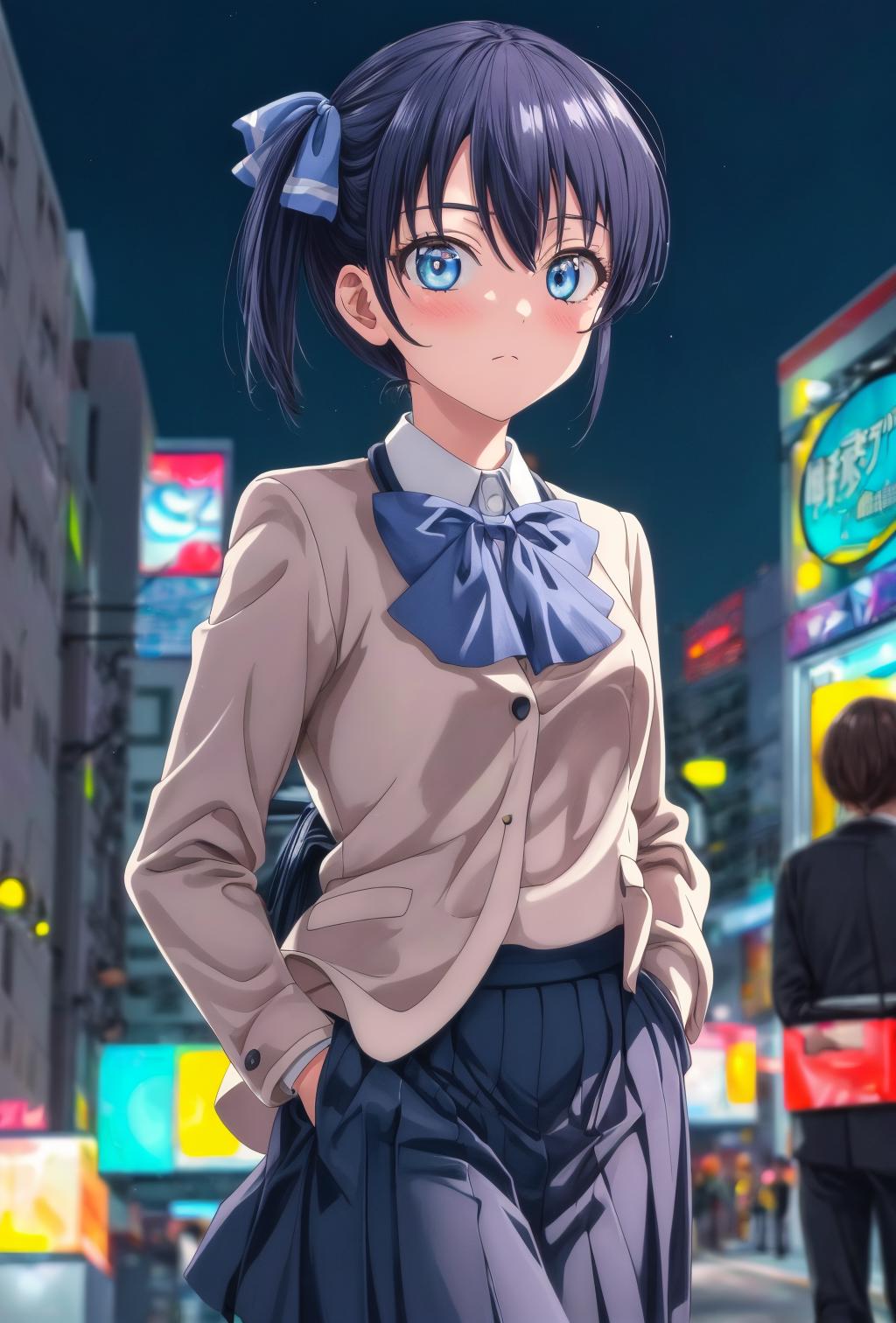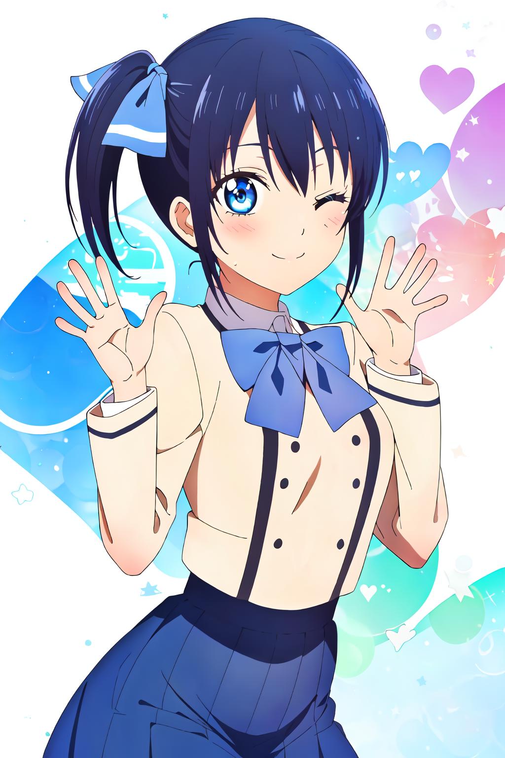 minase, blue bow, blue eyes, side ponytail, school uniform, blue hair, bangs,