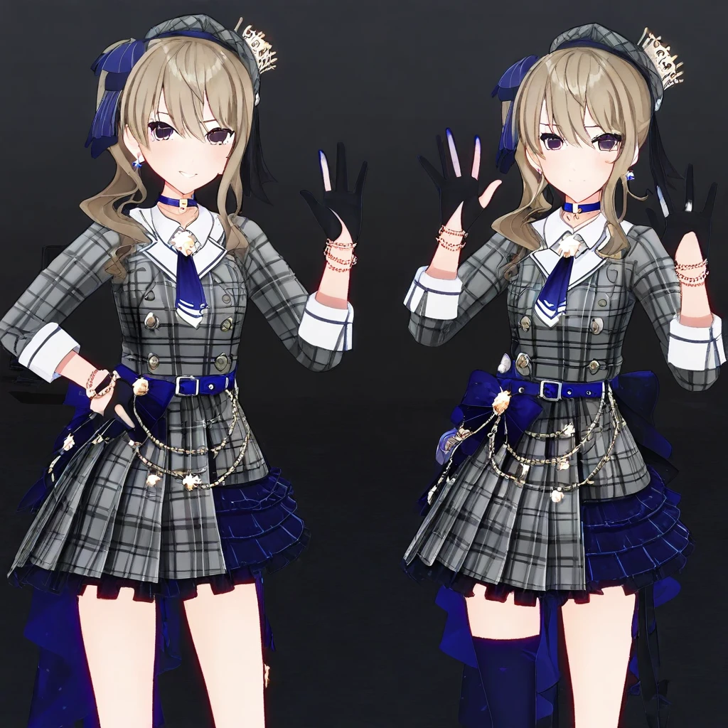 zzhoshimachizz, solo, virtual youtuber, blue hair, crown, blue eyes, side ponytail, grey headwear, hat, beret, choker, partialy fingerless gloves, jewelry, thighhighs, plaid headwear, star earings, plaid jacket, belt, asymmetrical legwear,