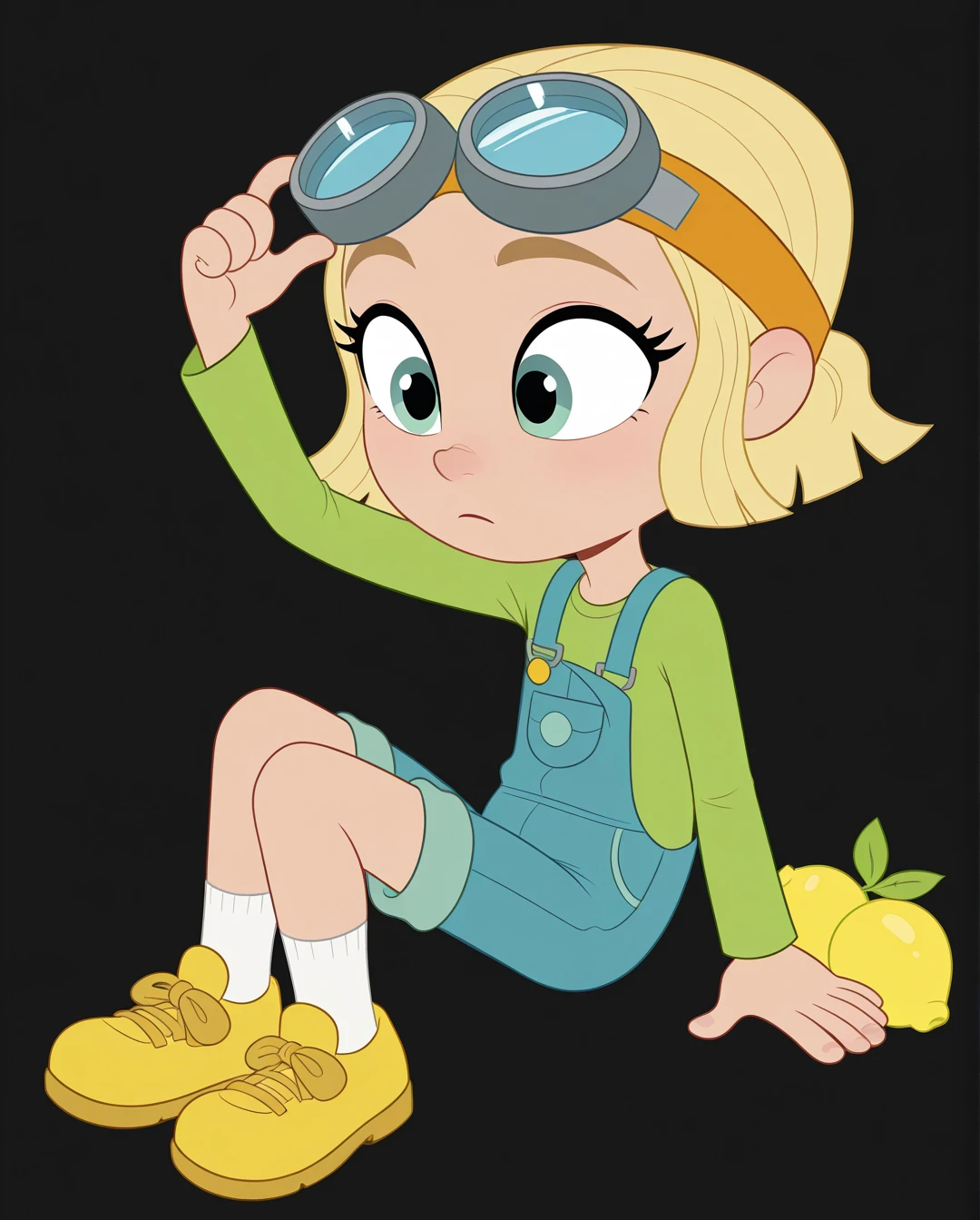 goggles on head, blue overalls, long sleeves, green shirt, white socks, shoes, yellow footwear, eyewear on head,
