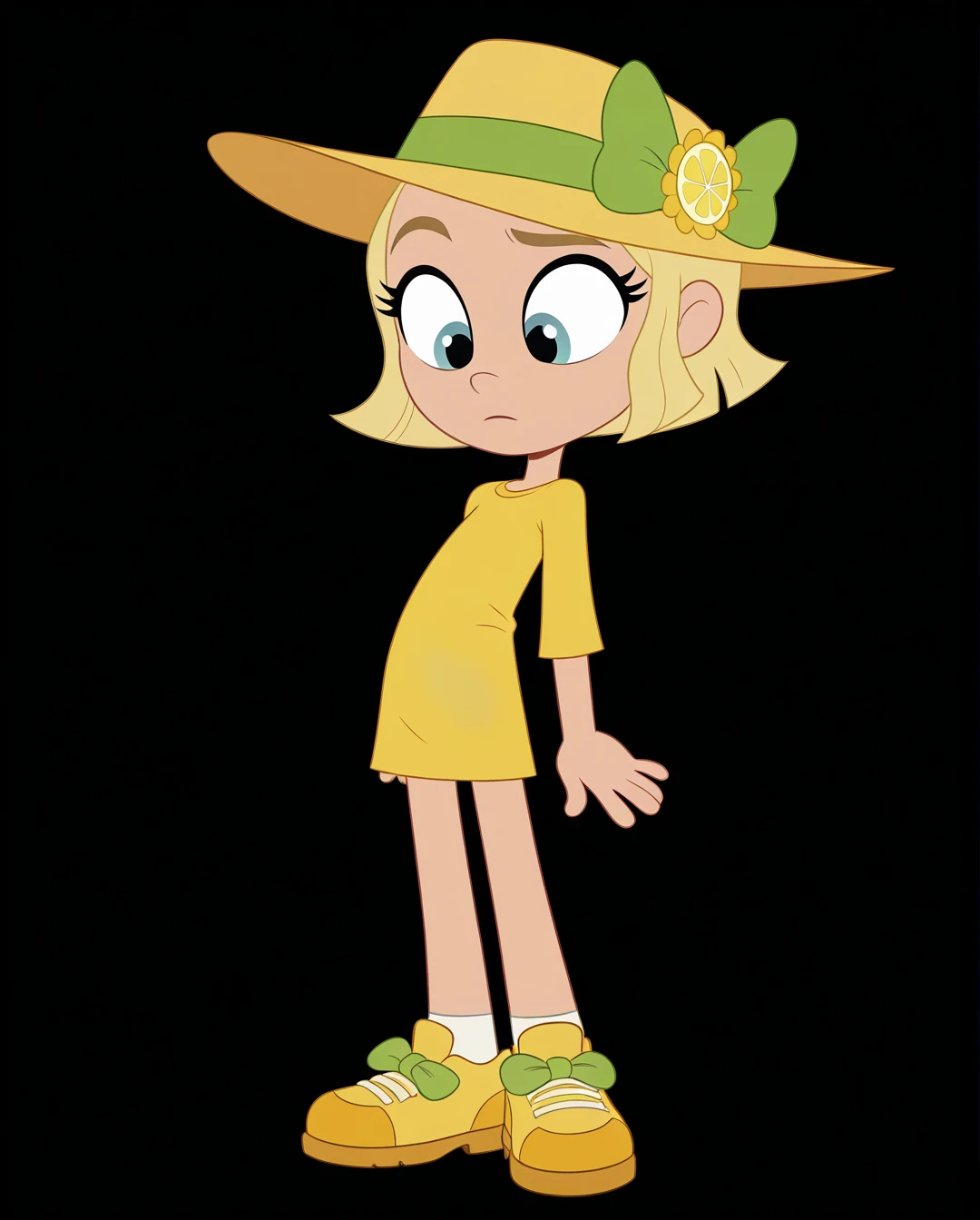 yellow headwear, hat bow, green bow, hat flower, shoes, yellow shirt,