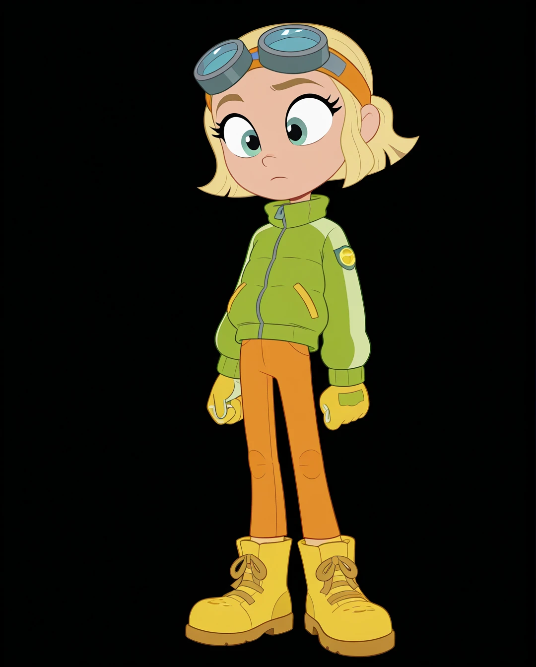 goggles on head, green jacket, pants, boots, yellow footwear, long sleeves, hairband,