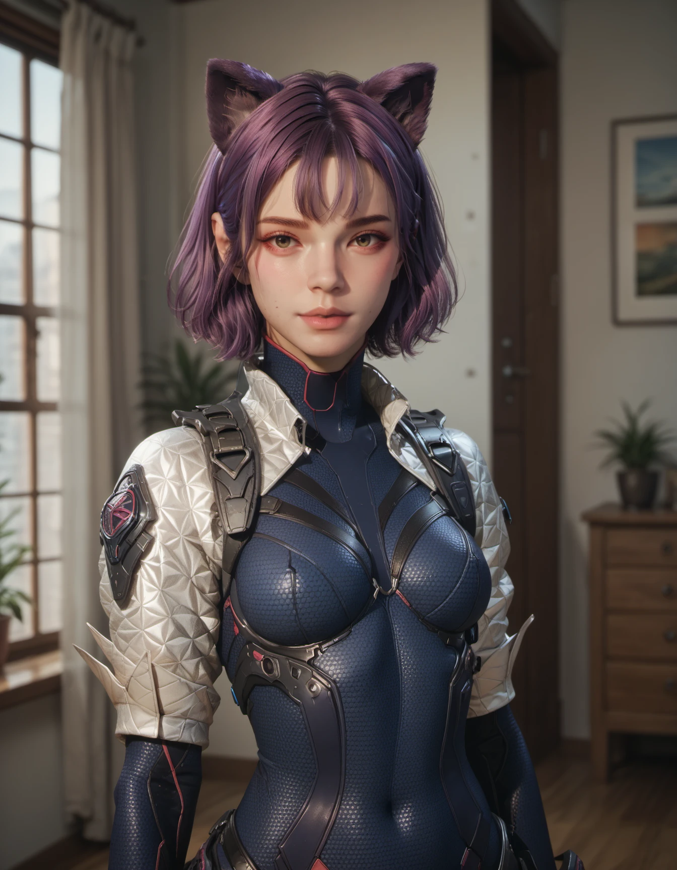 the default style you can get it by using the prompt: (bodysuit, helmet,) without the word helmet it will show the in-game character's face.