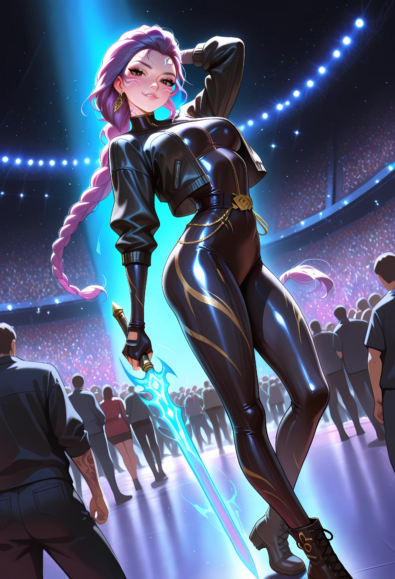 black ????????, black jacket, fingerless gloves, boots, earrings, holding weapon, blue energy sword, Saingeom