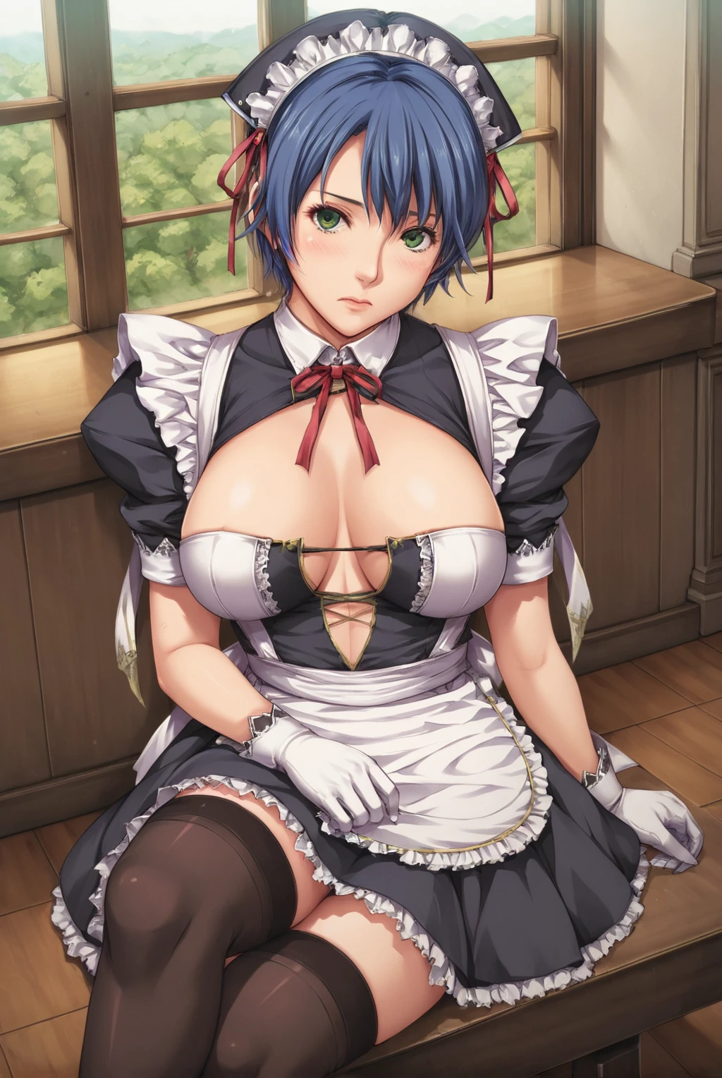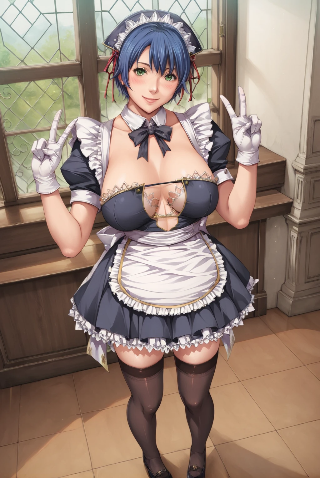 short hair, green eyes, blue hair, large breasts, hair ribbon, dress, frills, black thighhighs, white gloves, miniskirt, puffy short sleeves, maid, clothing cutout, maid headdress, short dress, frilled skirt, lace trim, breasts apart, maid apron, center opening