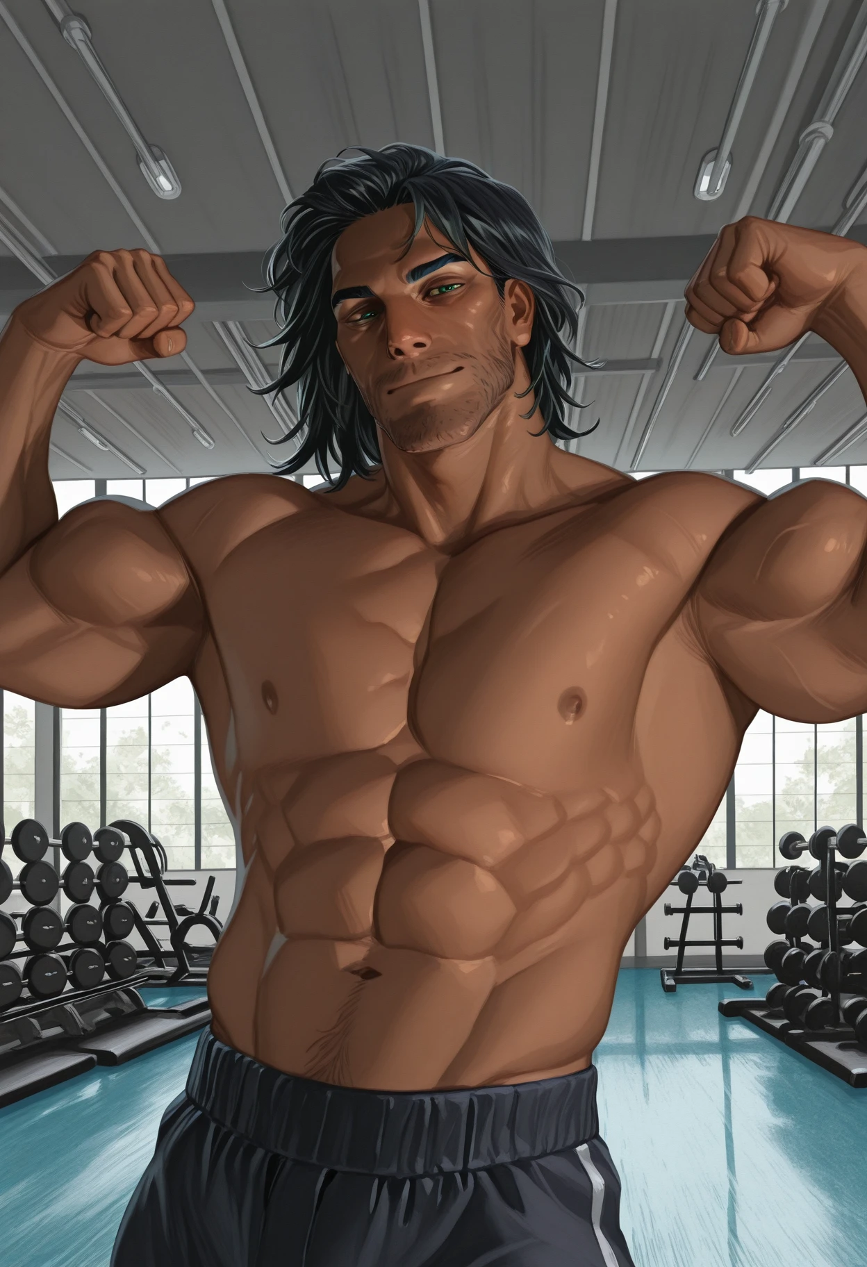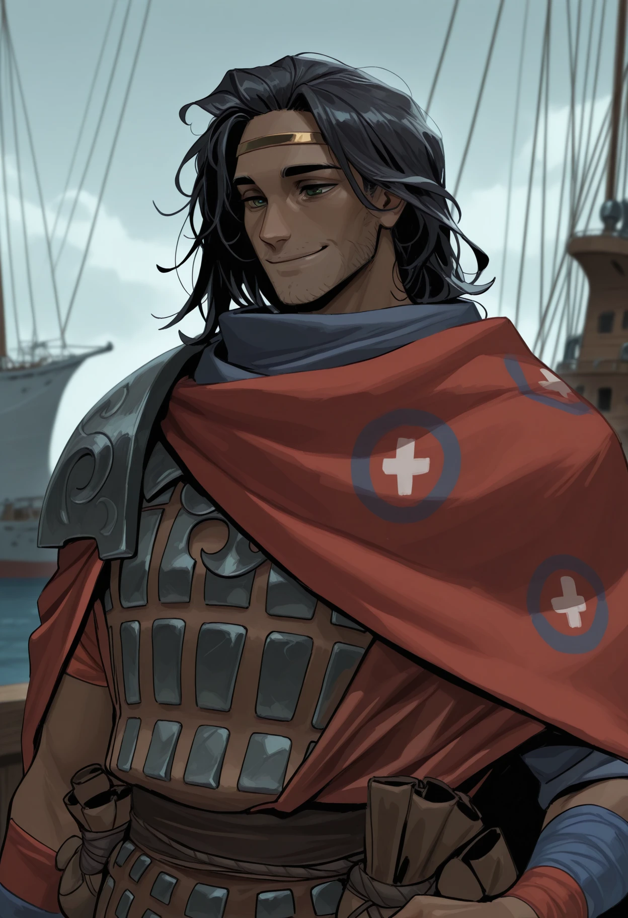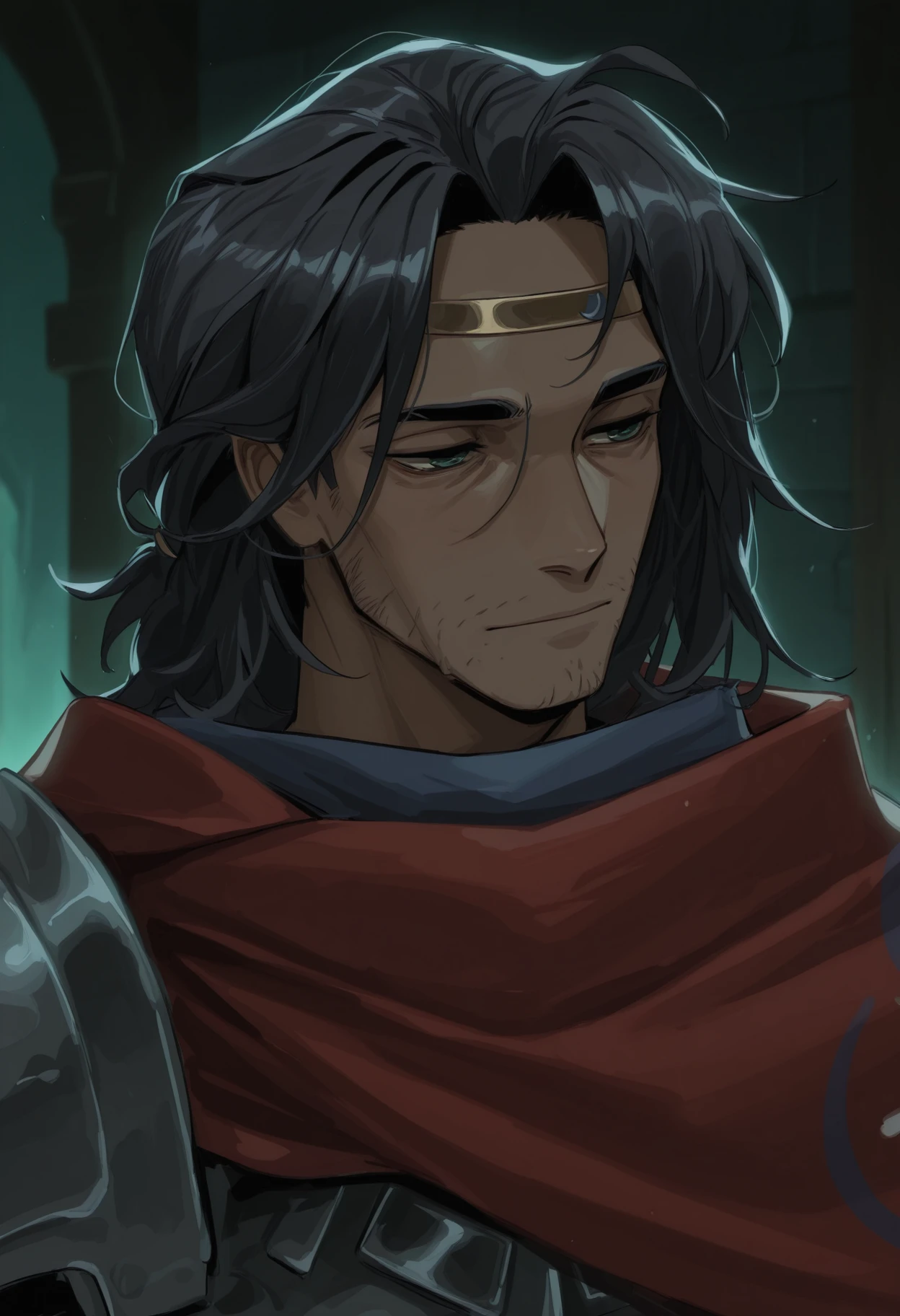 0dyss3us, black hair, green eyes, stubble