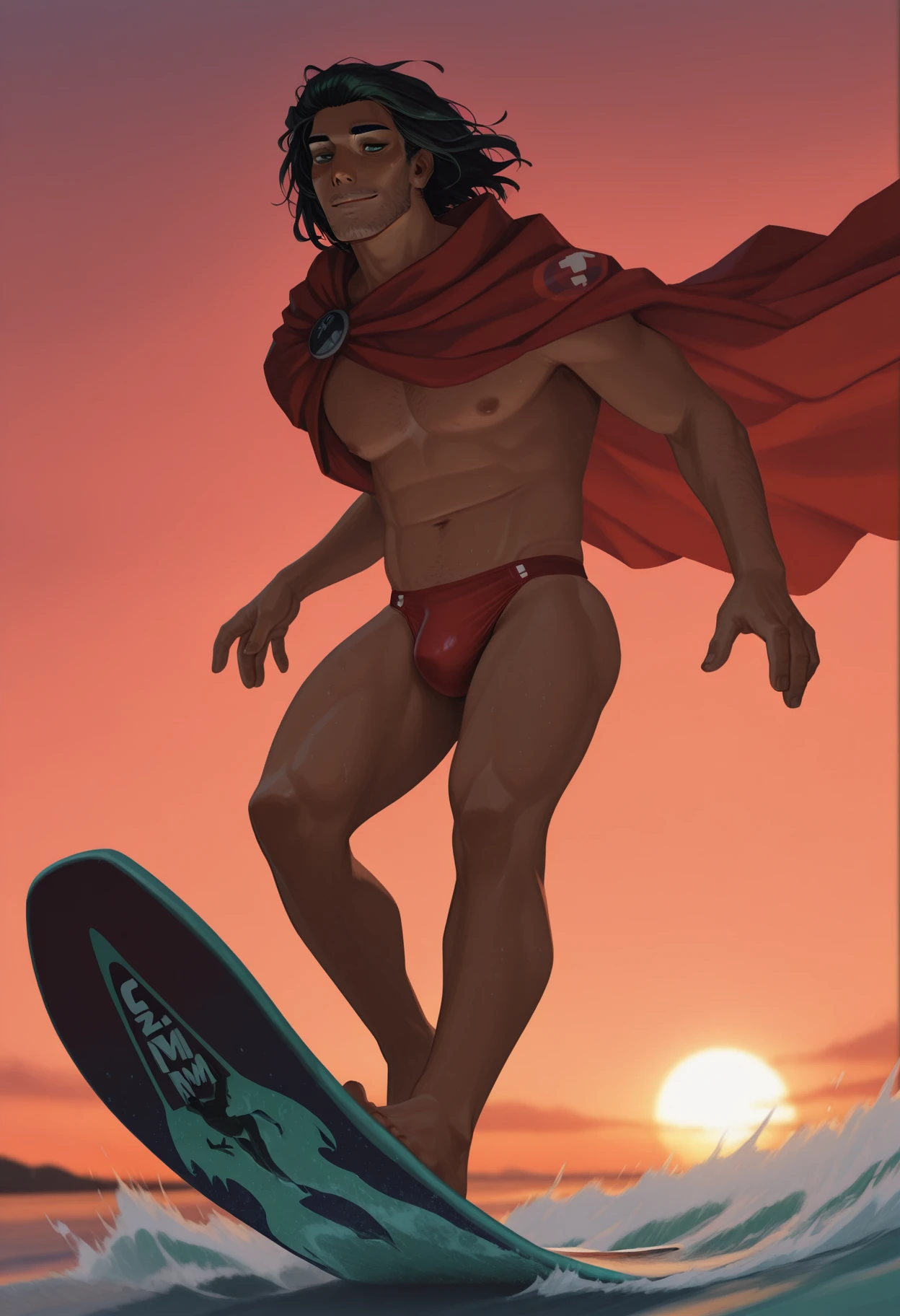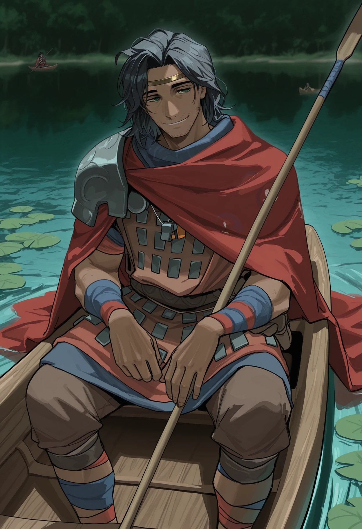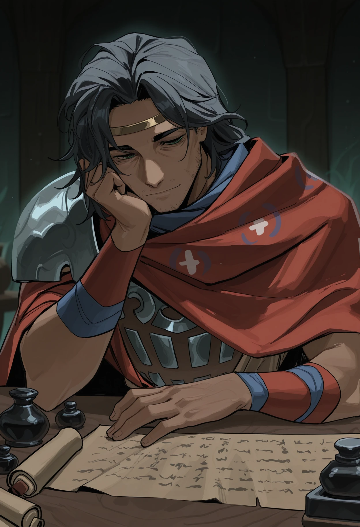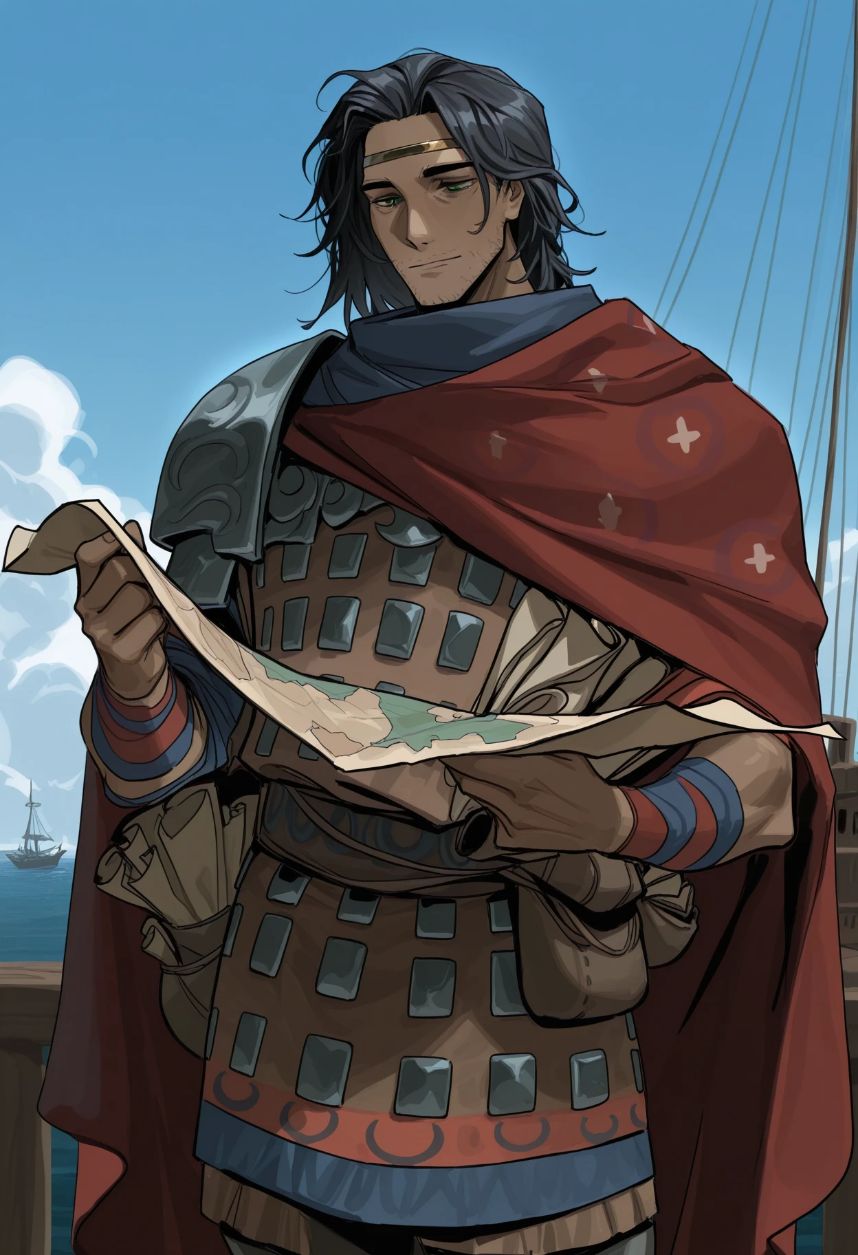 0dyss3us, black hair, green eyes, stubble