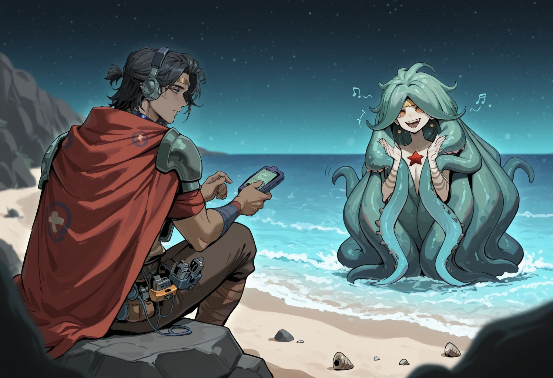 red cape, armor, pouches