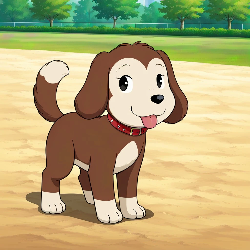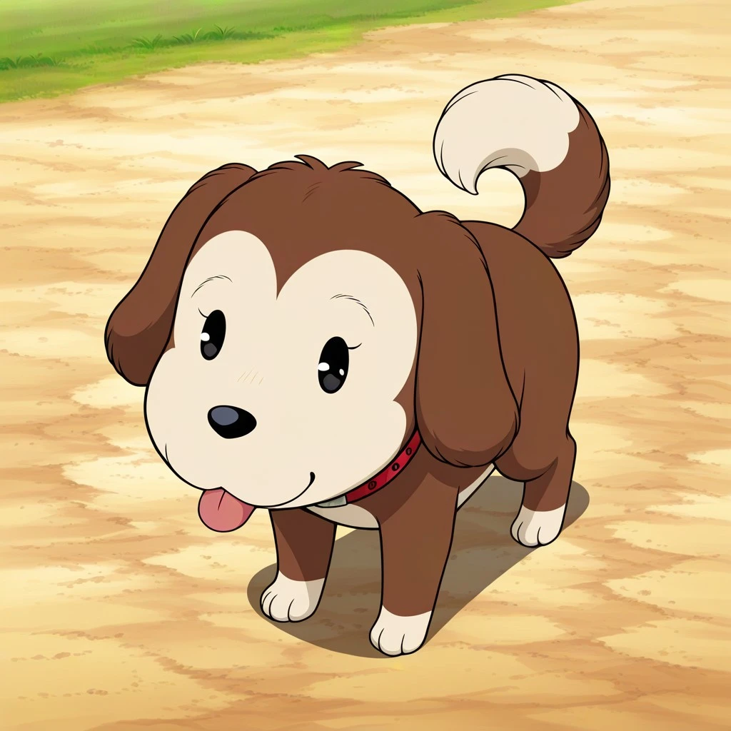 dog, brown and tan fur, black dot eyes, black nose, dog ears, dog tail, red collar,