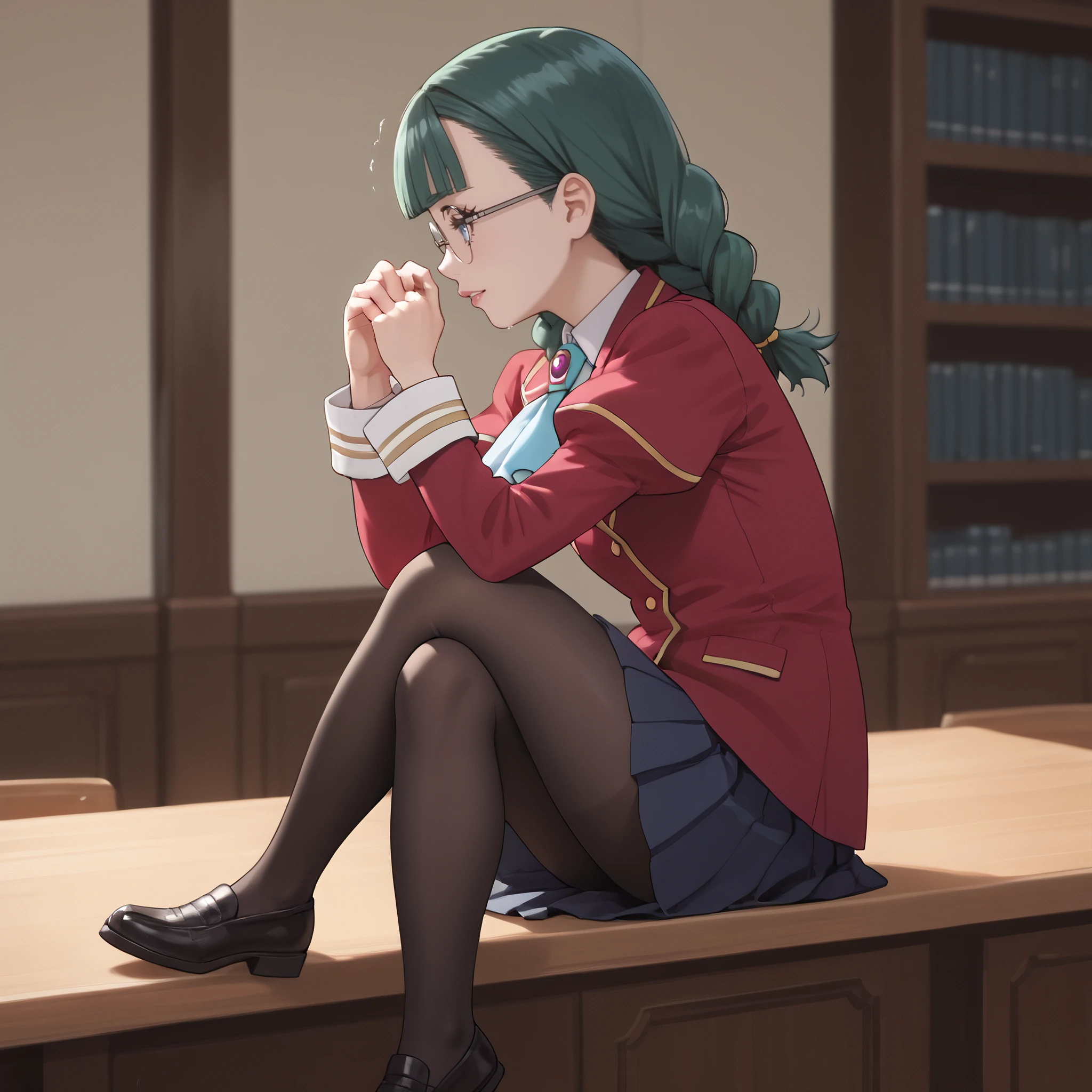 long sleeves, brooch, ascot, jacket, collared shirt, red jacket, shirt, school uniform, white skirt, white shirt, puffy sleeves, pleated skirt, black pantyhose,