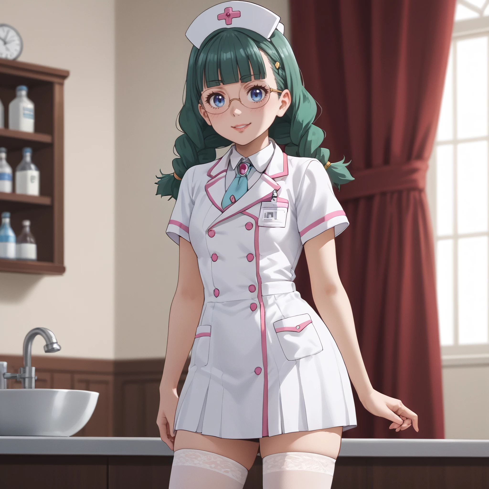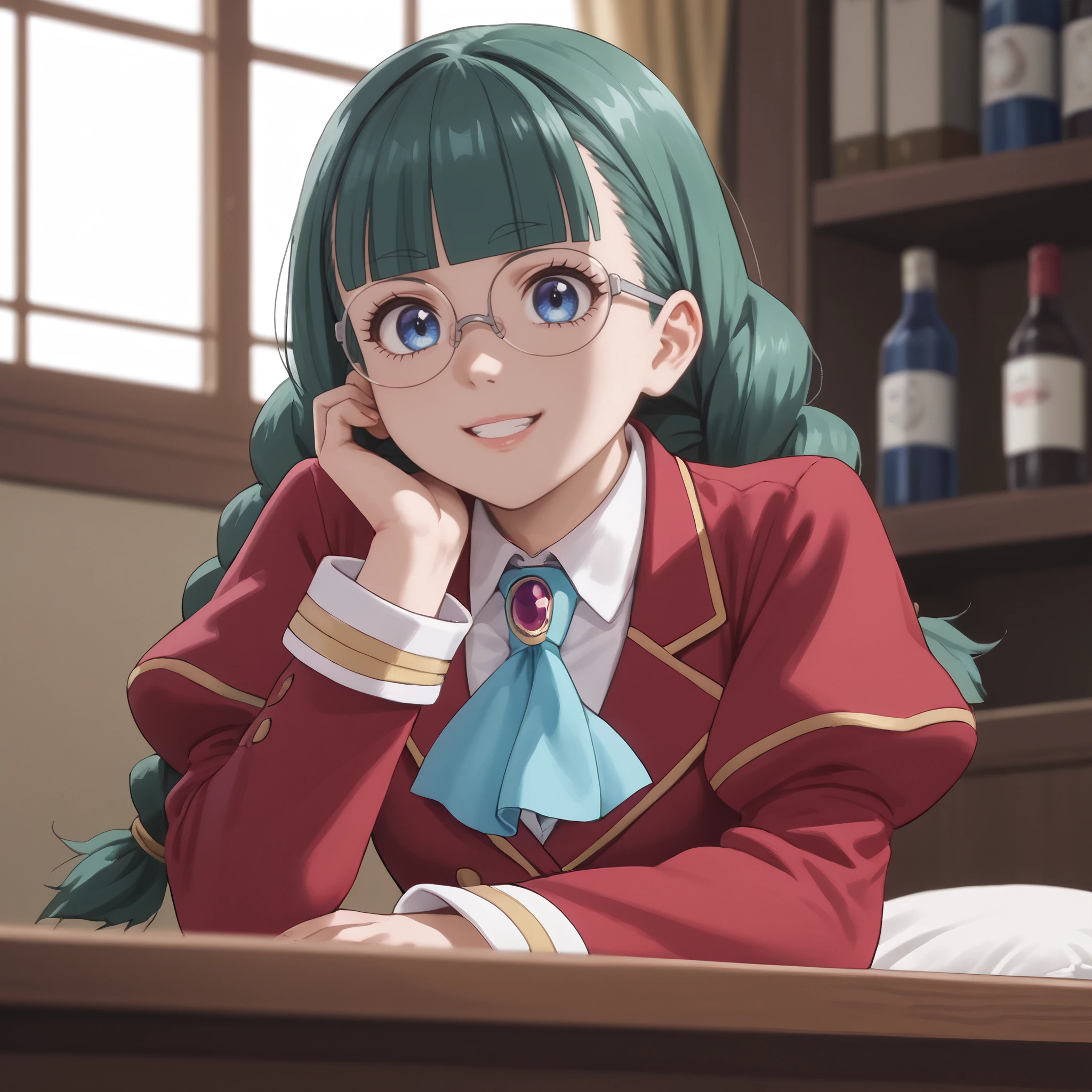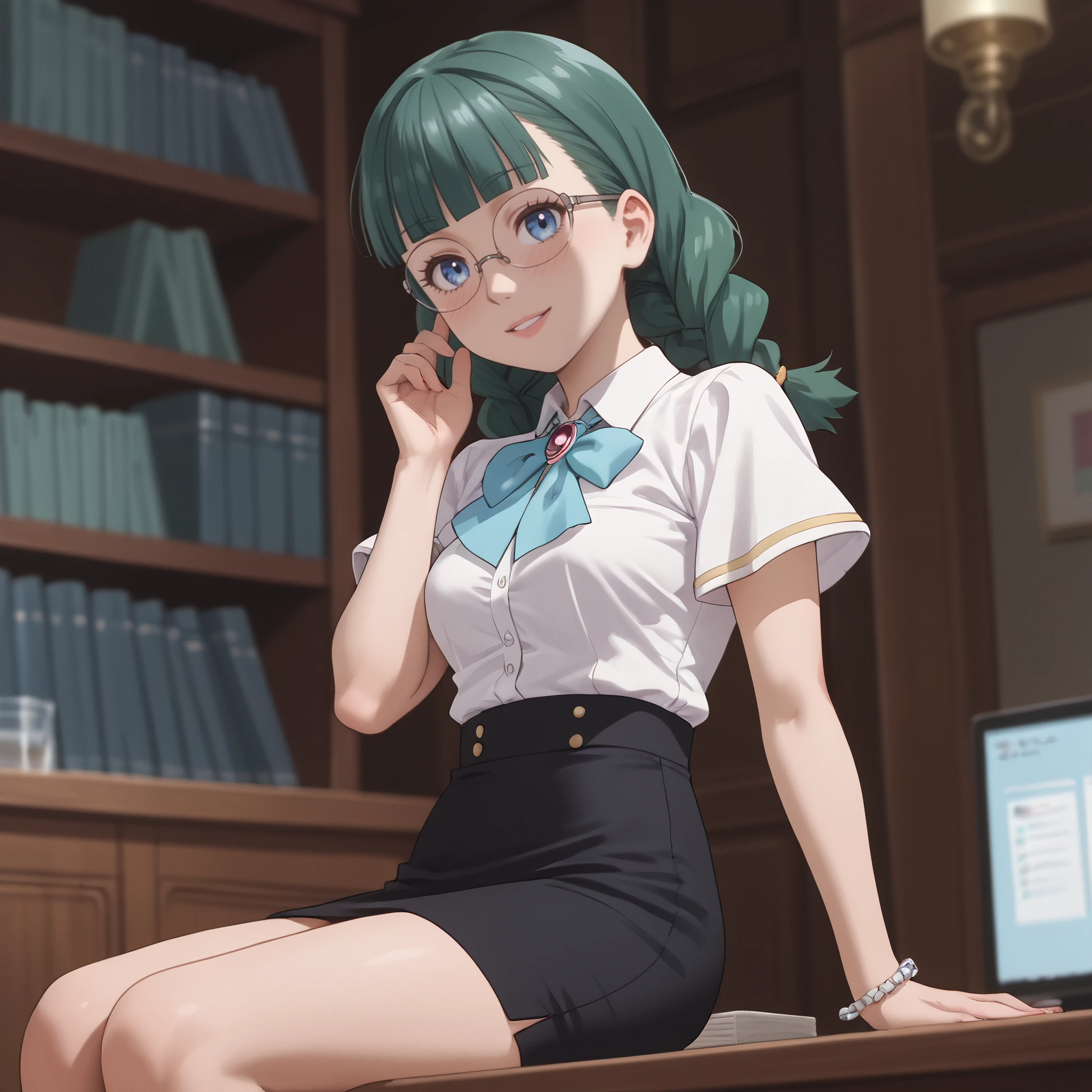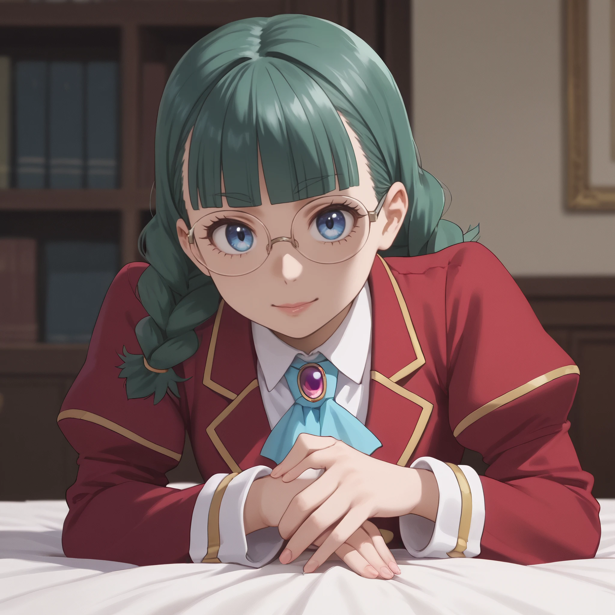 ARTFrancette, green hair, long hair, glasses, braid, bangs, bow, blue eyes, twin braids, blunt bangs, twintails, opaque glasses, coke-bottle glasses, single braid, ribbon,
