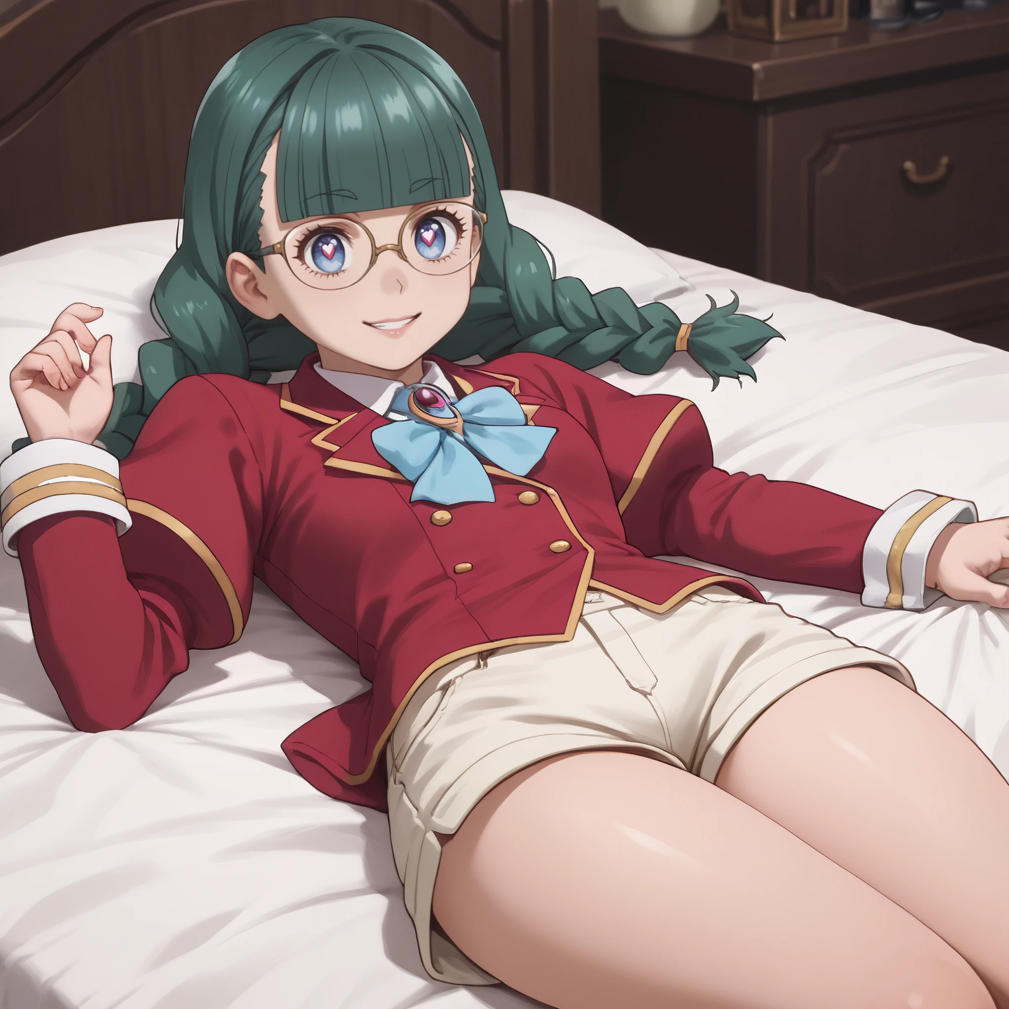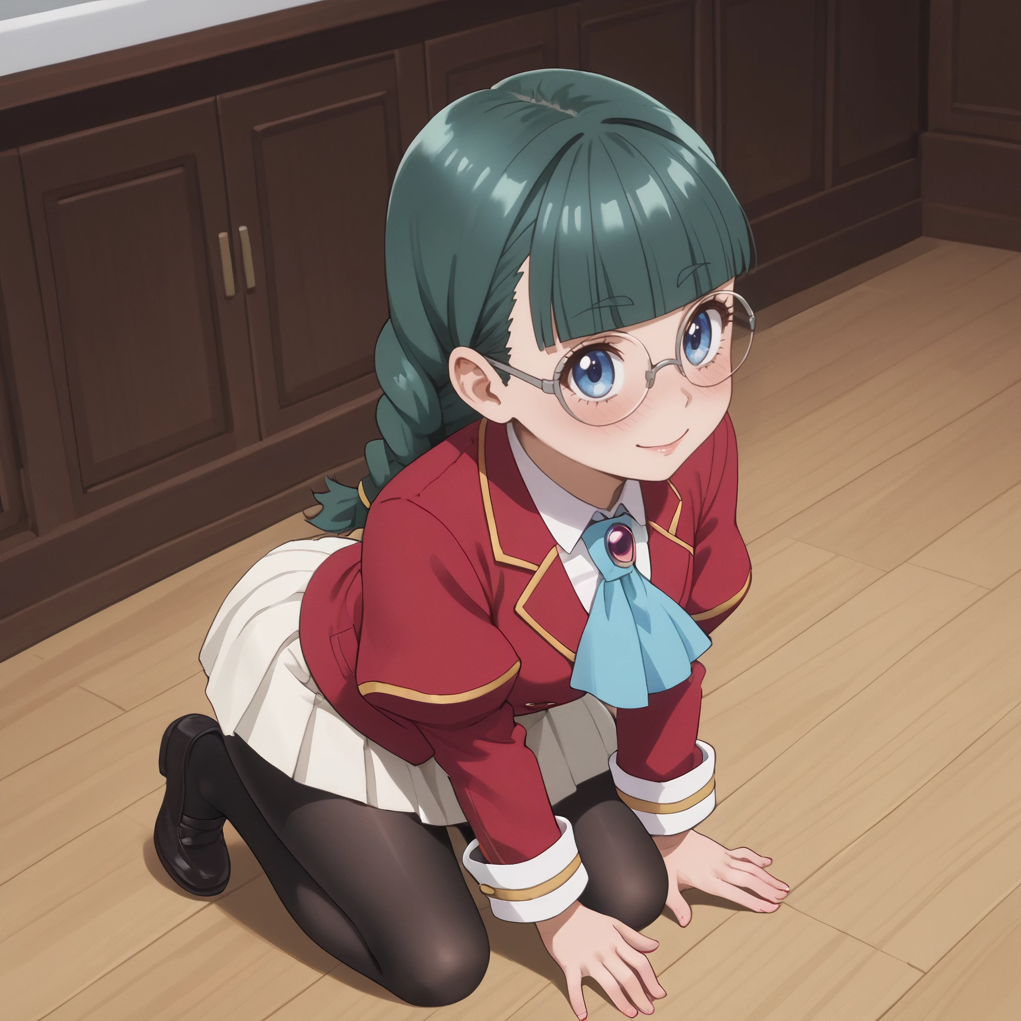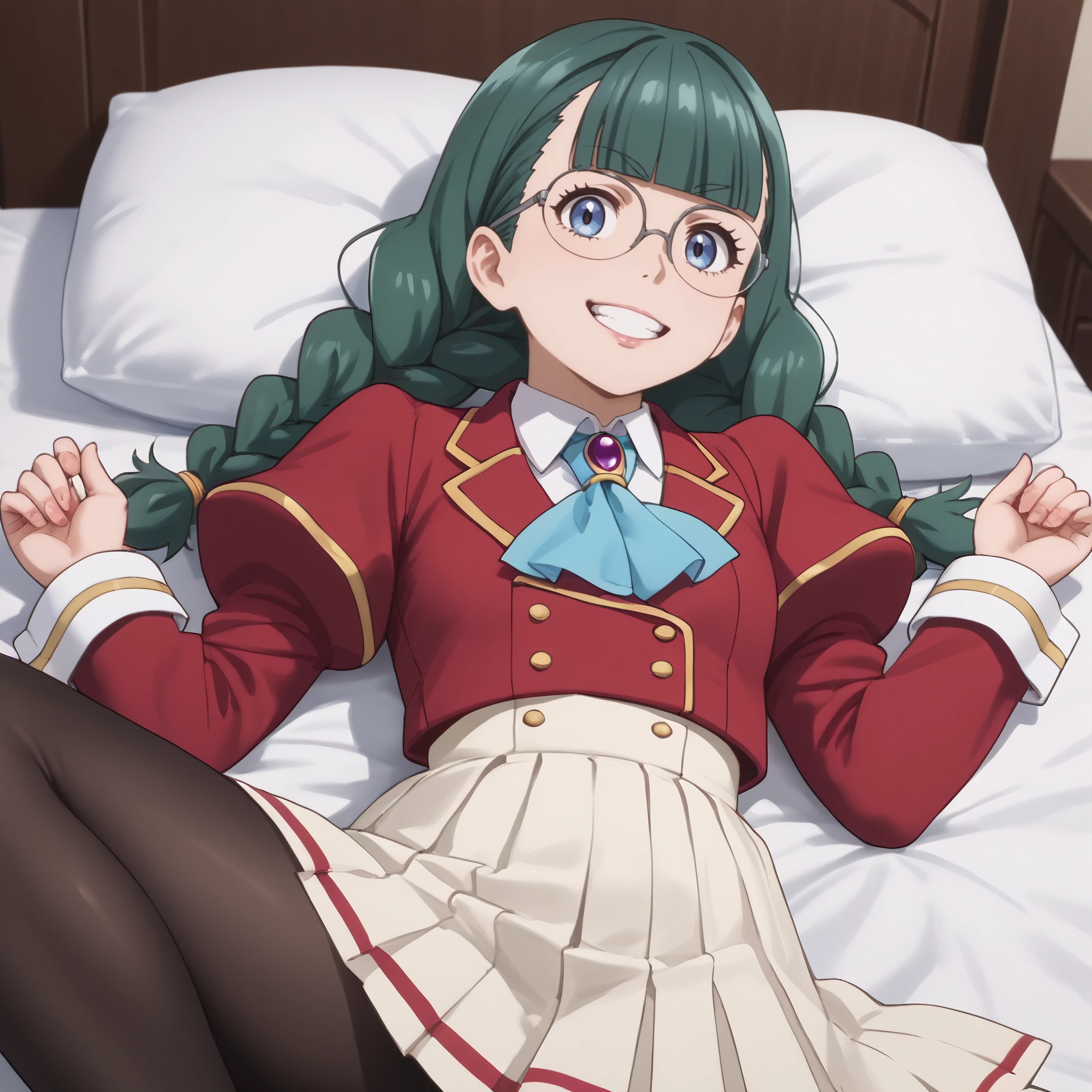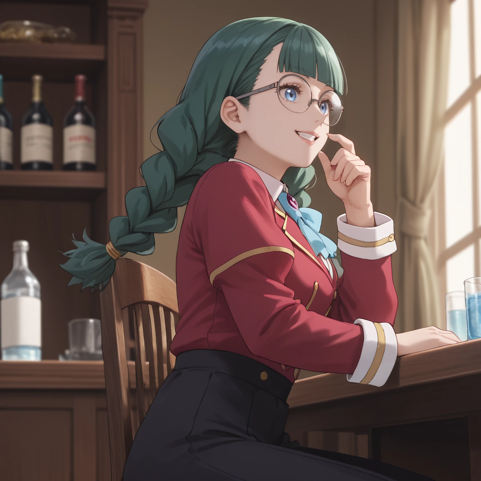 ARTFrancette, green hair, long hair, glasses, braid, bangs, bow, blue eyes, twin braids, blunt bangs, twintails, opaque glasses, coke-bottle glasses, single braid, ribbon,