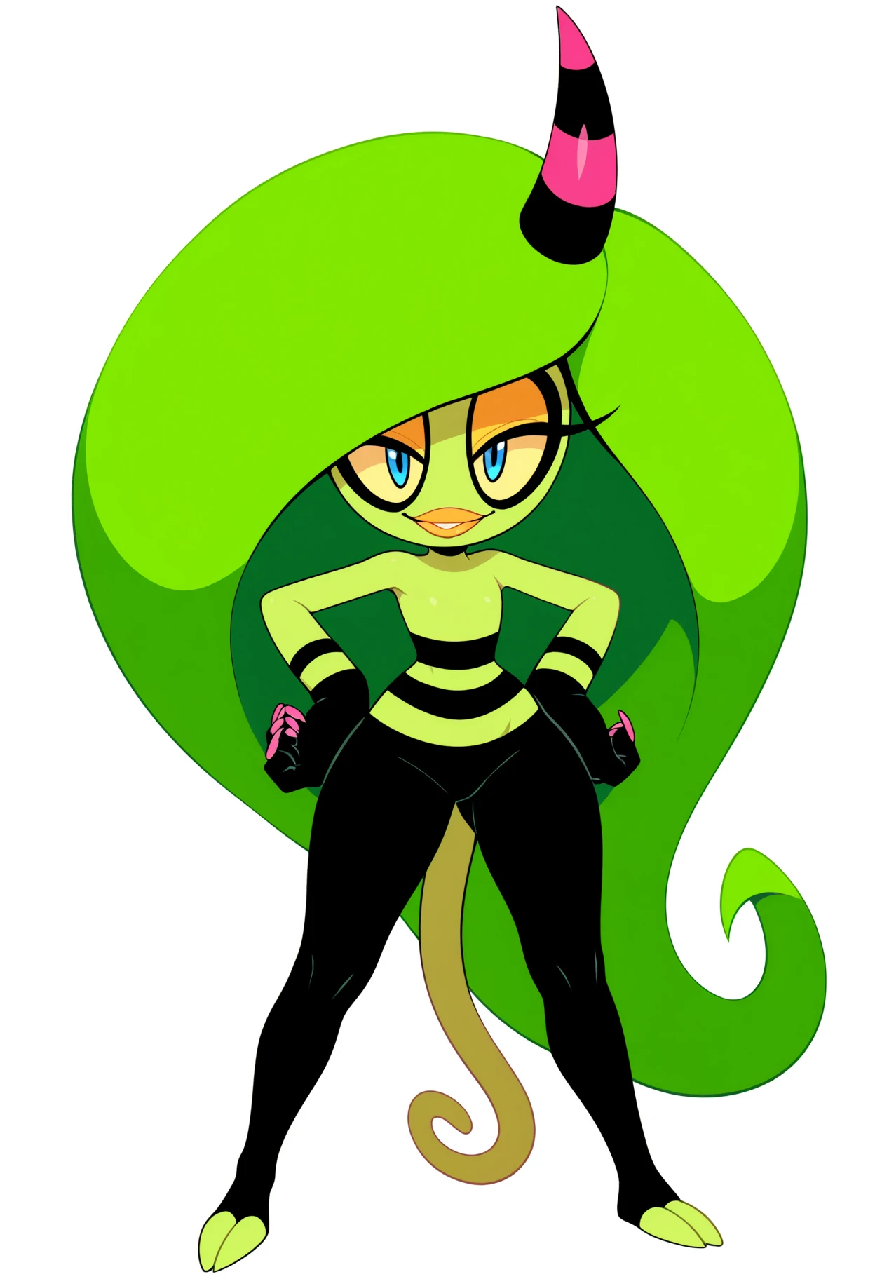 Basic prompts : 1girl, zeena, big hair, single horn, blue eyes, green hair, yellow sclera, long hair, eyeshadow, furry, gloves, lizard tail, green skin, pink fingernails
