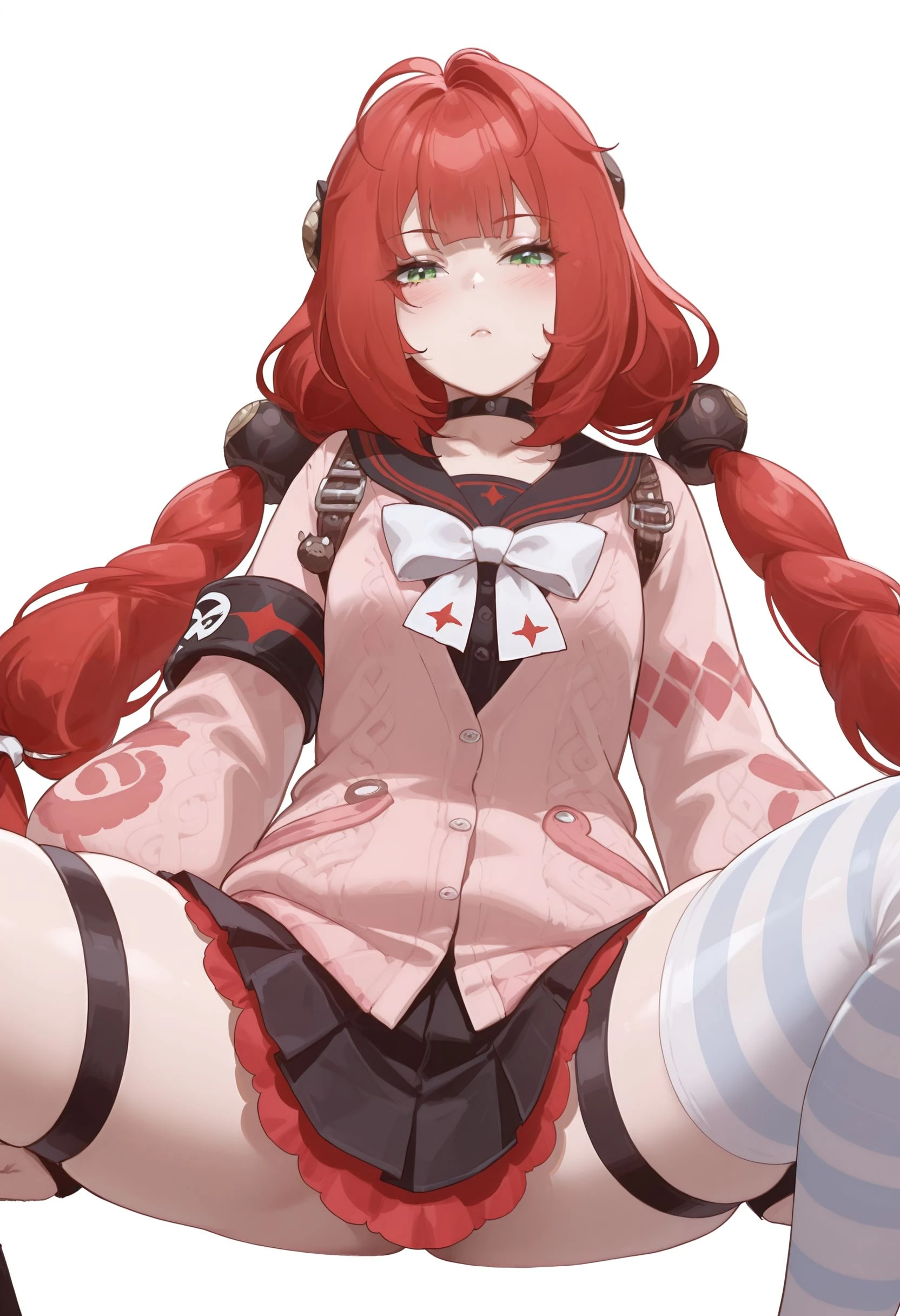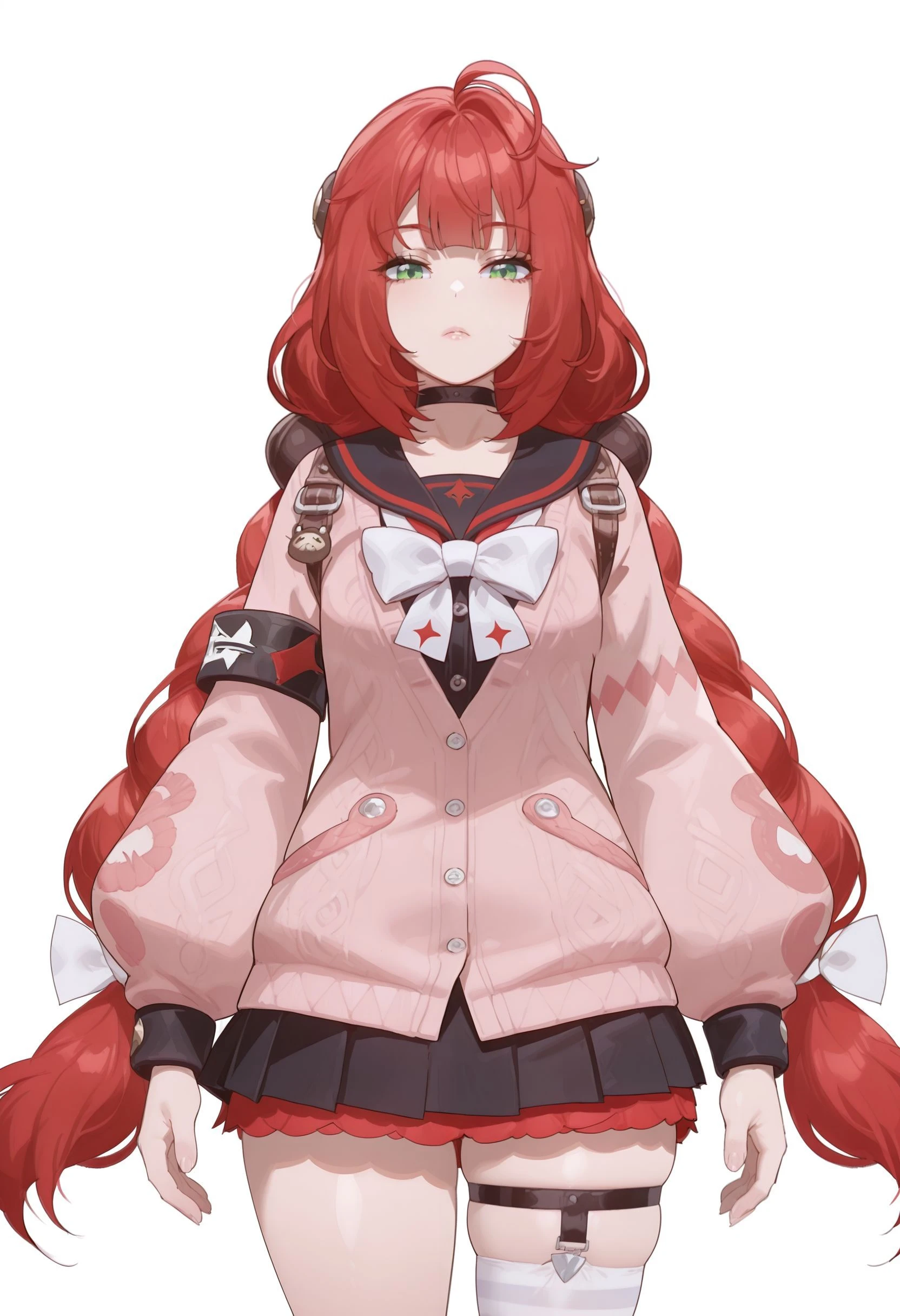 zenless_zone_zero_ukinami_yuzuha, zzzknmyzh, ahoge, hair bow, green eyes, long hair, low twintails, red hair, sidelocks, twintails, very long hair, small breasts, black choker, black sailor collar, black skirt, bow, bowtie, cardigan, choker, long sleeves, miniskirt, pink cardigan, pleated skirt, puffy long sleeves, puffy sleeves, sailor collar, single thighhigh, skirt, striped clothes, striped thighhighs, thigh strap, thighhighs, thighs, white bow, white bowtie, white thighhighs, <lora:zenless_zone_zero_ukinami_yuzuha_illustrious:0.8>Prompt without Clothes