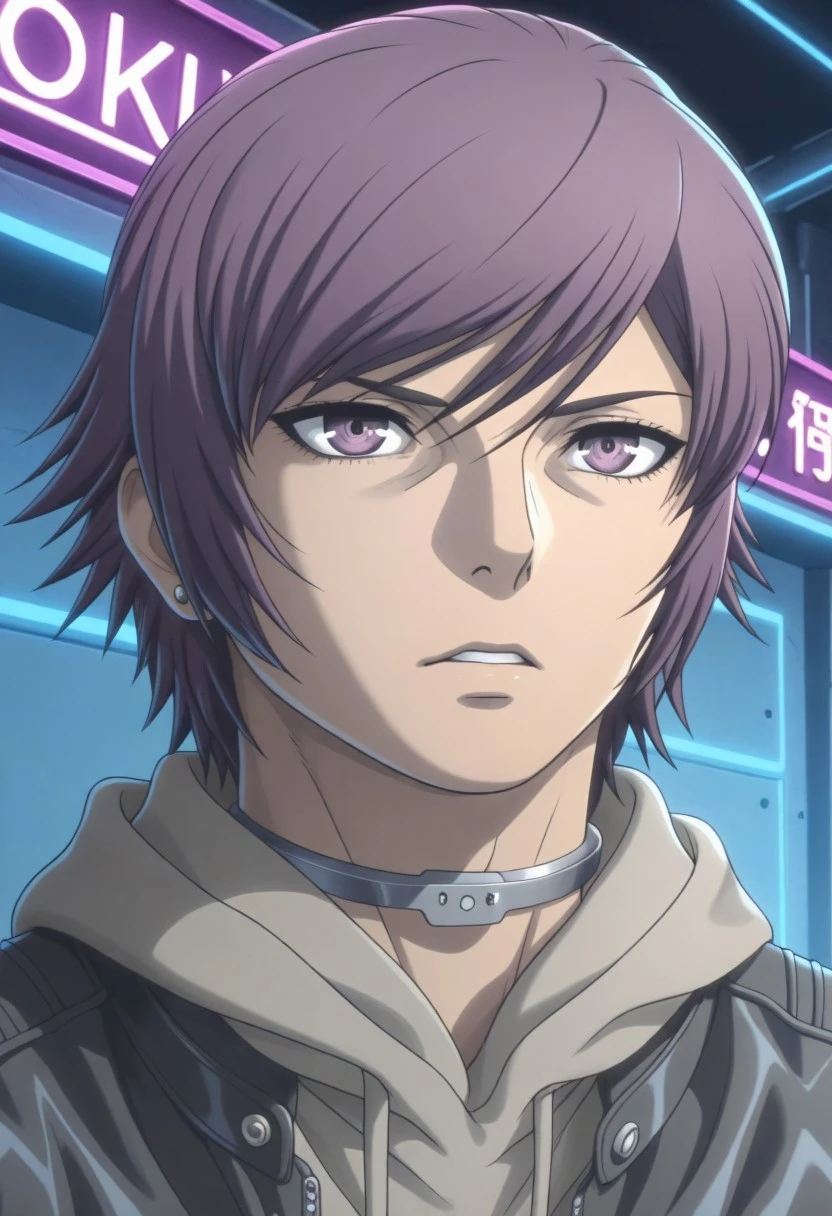 Courier, purple-gray hair, purple-gray eyes, ear piercings, black open leather jacket, gray long sleeves hoodie shirt, right mechanical hand, black pants, metal leg bag holster, black boots