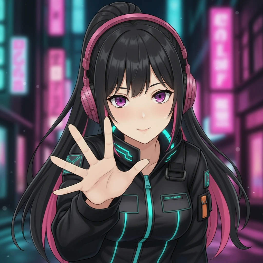 1girl, solo, long black hair, high ponytail, vivid pink streak in hair, pink eyes, looking at viewer