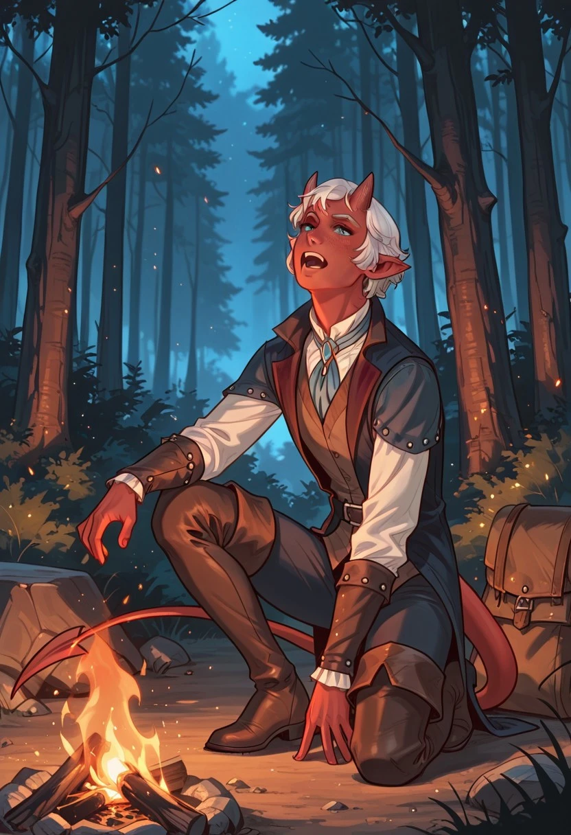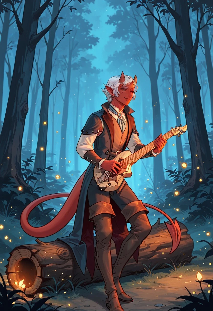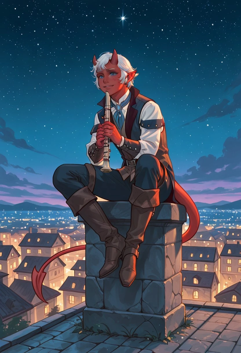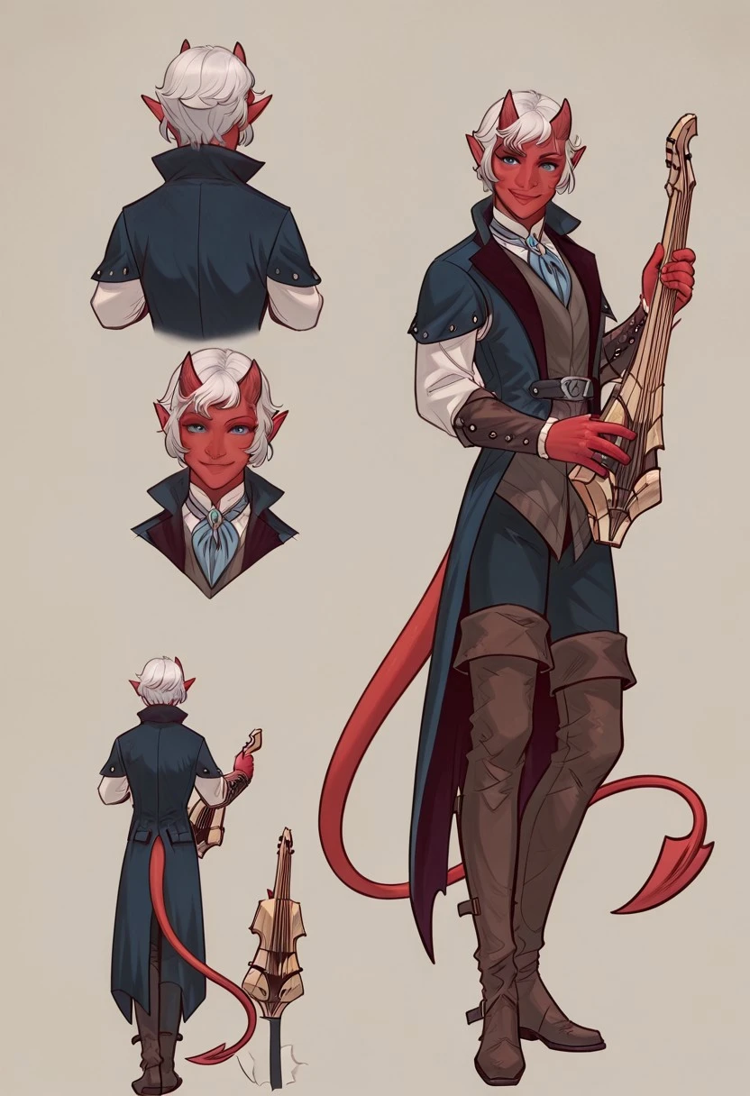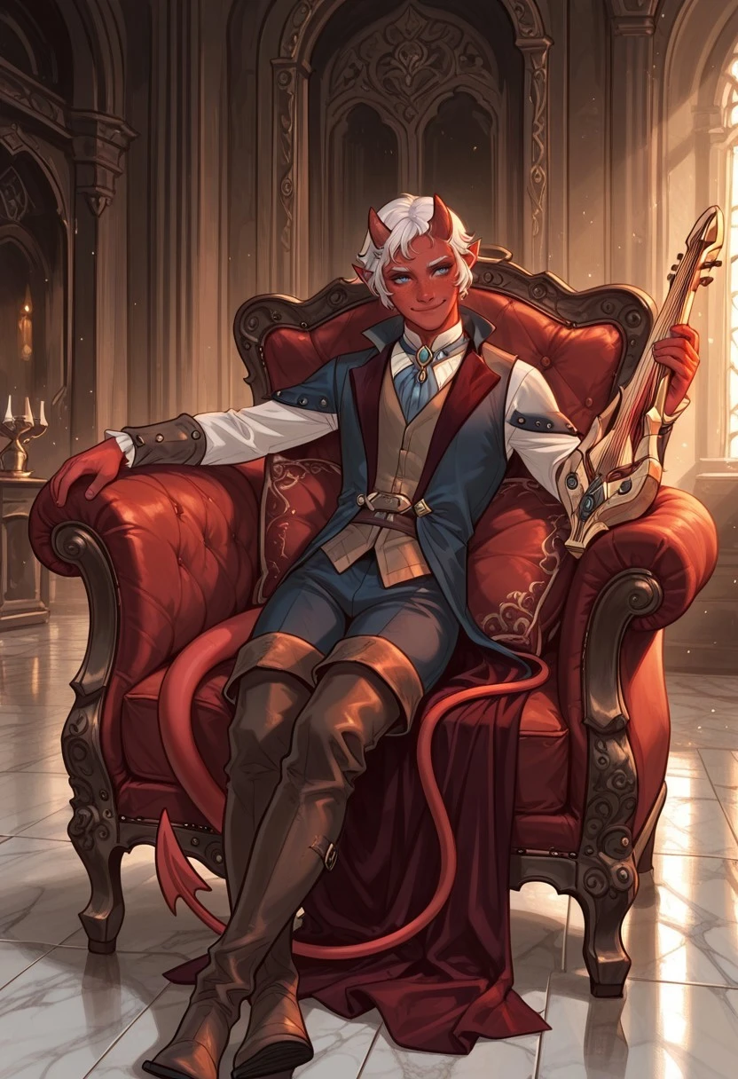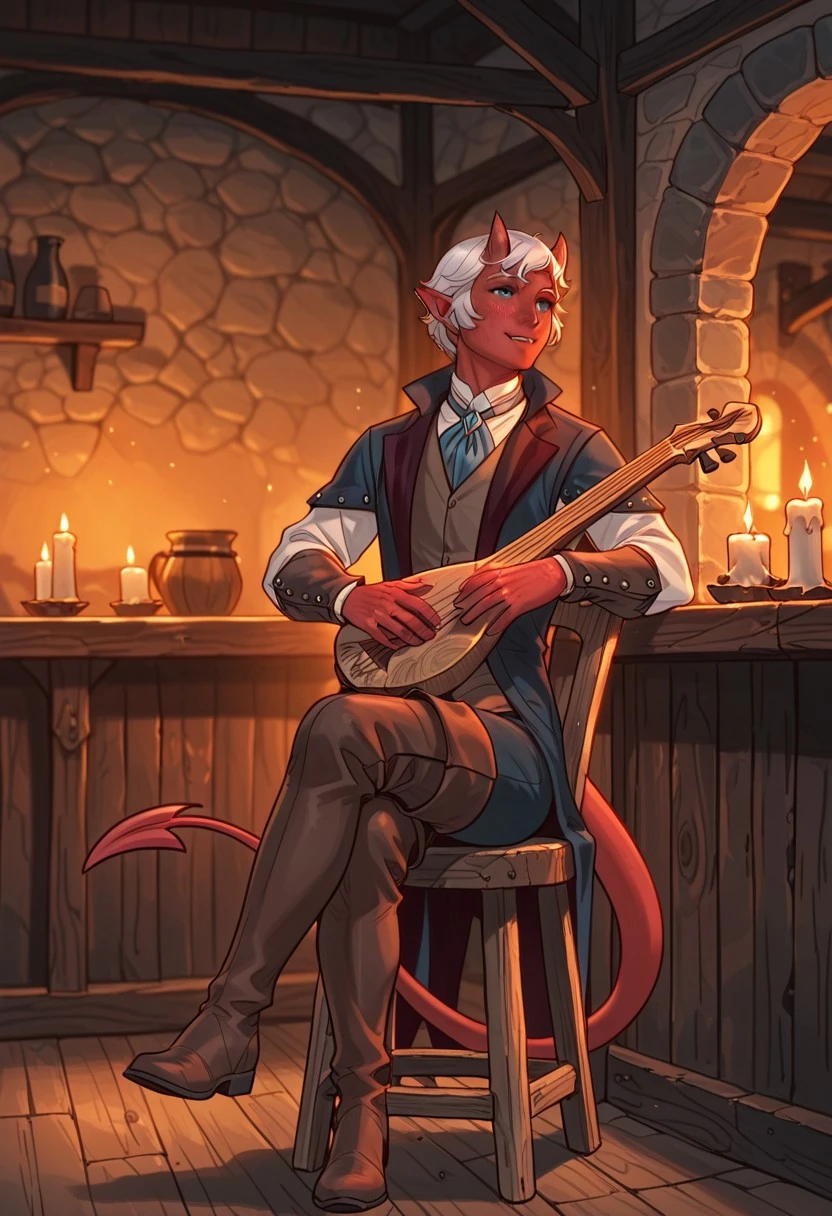 1boy, male focus, tiefling, demon boy, bard, fantasy character, red skin, colored skin, freckles, blue eyes, white hair, short hair, parted lips, oni-like demon horns, pointy ears, demon tail, jewelry, shirt, vest, long sleeves, pants, thighhigh boots, thigh boots, brown footwear