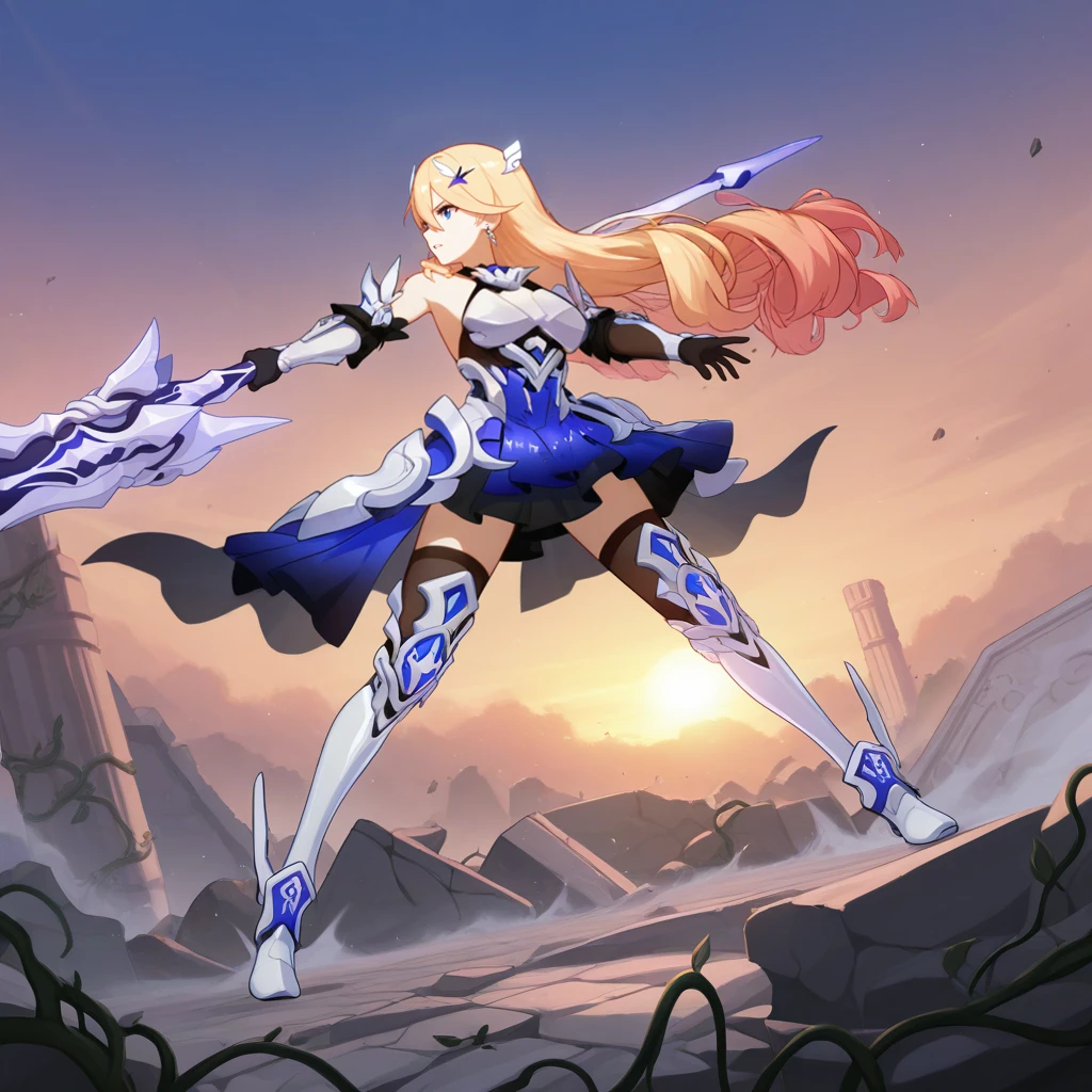Durandal, Fol002, Du_Bke, blonde hair, blue eyes, long hair, drill hair, high-waist skirt, alt blue skirt, gradient skirt, armored skirt, alt hair ornament, clothing cutout, breastplate, halter top, bare shoulders, single earring, detached sleeves, armored sleeves, alternate black sleeves, alt black gloves, gloves, gauntlets, white gauntlets, thighhighs, alt black thighhighs, armored boots, white footwear, alternate thigh boots,Emerald of Alfheim: