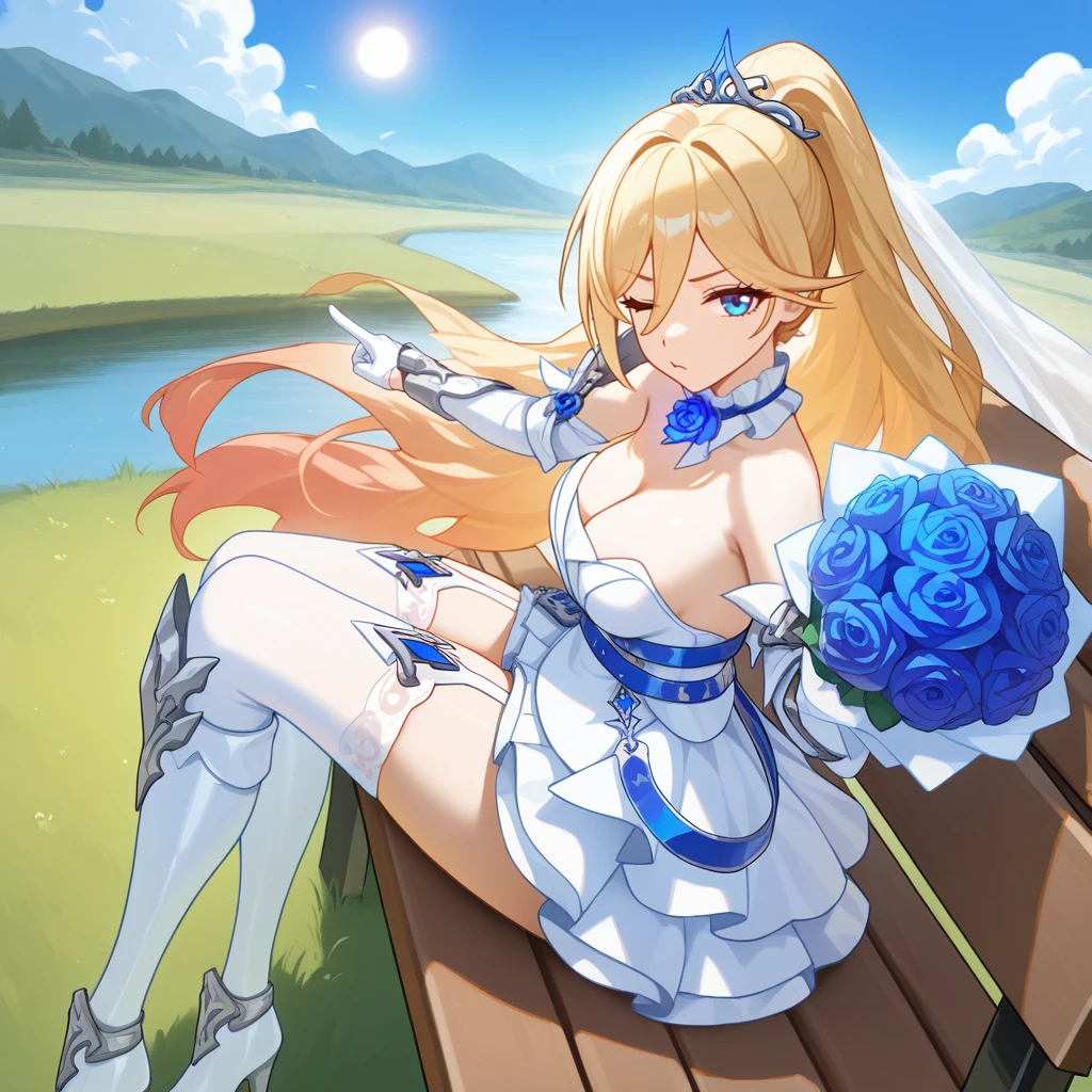 Durandal, Fol003, Du_Wed, blonde hair, blue eyes, long hair, high ponytail, wedding dress, bridal veil, white dress, crossed belts, alt blue belts, blue rose, layered skirt, alt white skirt, tiara, alt pleated skirt, garter straps, alternate white thighhighs, alt detached sleeves, white sleeves, long sleeves, half gloves, alternative gauntlets, alt white gauntlets, bare shoulders, alt detached collar, frilled collar, cleavage,Heavenward Dragon:
