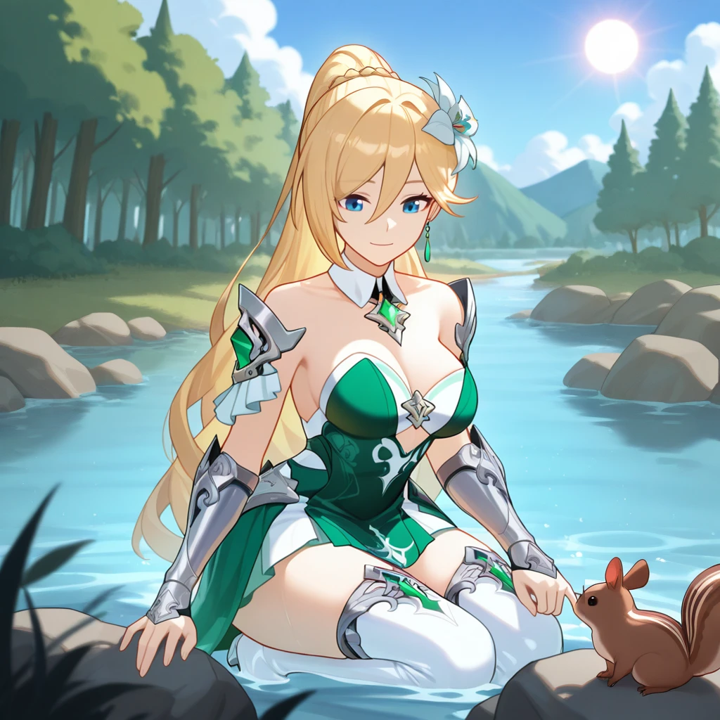 Bke_Elf, ponytail, pointy ears, braid, earrings, jewelry, strapless dress, cleavage, white dress, green dress, two-tone skirt, white skirt, green skirt, white thighhighs, detached sleeves, detached collar, hair ornament, white flower, hair flower, short sleeves, white sleeves, silver armor, silver gauntlets,Manga/Story Outfit: