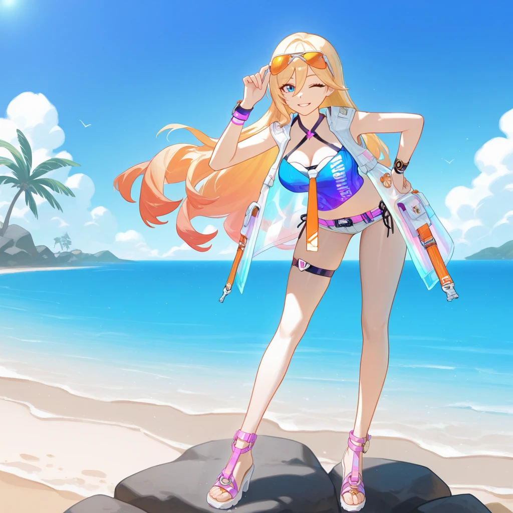 Durandal, Fol001, Du_Pur, blonde hair, blue eyes, long hair, side-tie shirt, blue shirt, cleavage, criss-cross halter, sleeveless jacket, white jacket, open jacket, see-through jacket, midriff, orange necktie, tie, micro shorts, white shorts, pink belt, o-ring thigh strap, orange-tinted eyewear, eyewear on head, sunglasses, wristband, wristwatch,Starlit Evening: