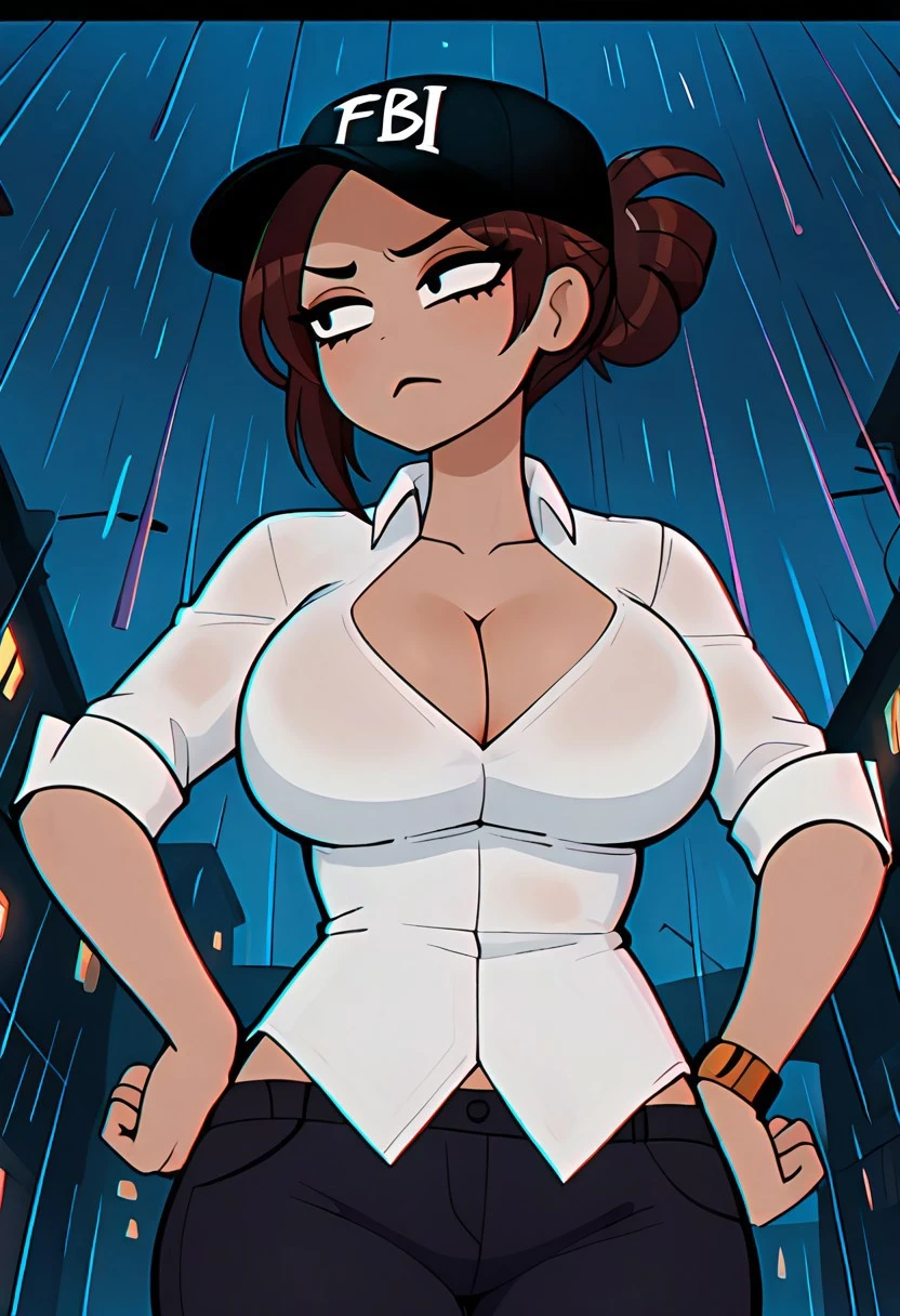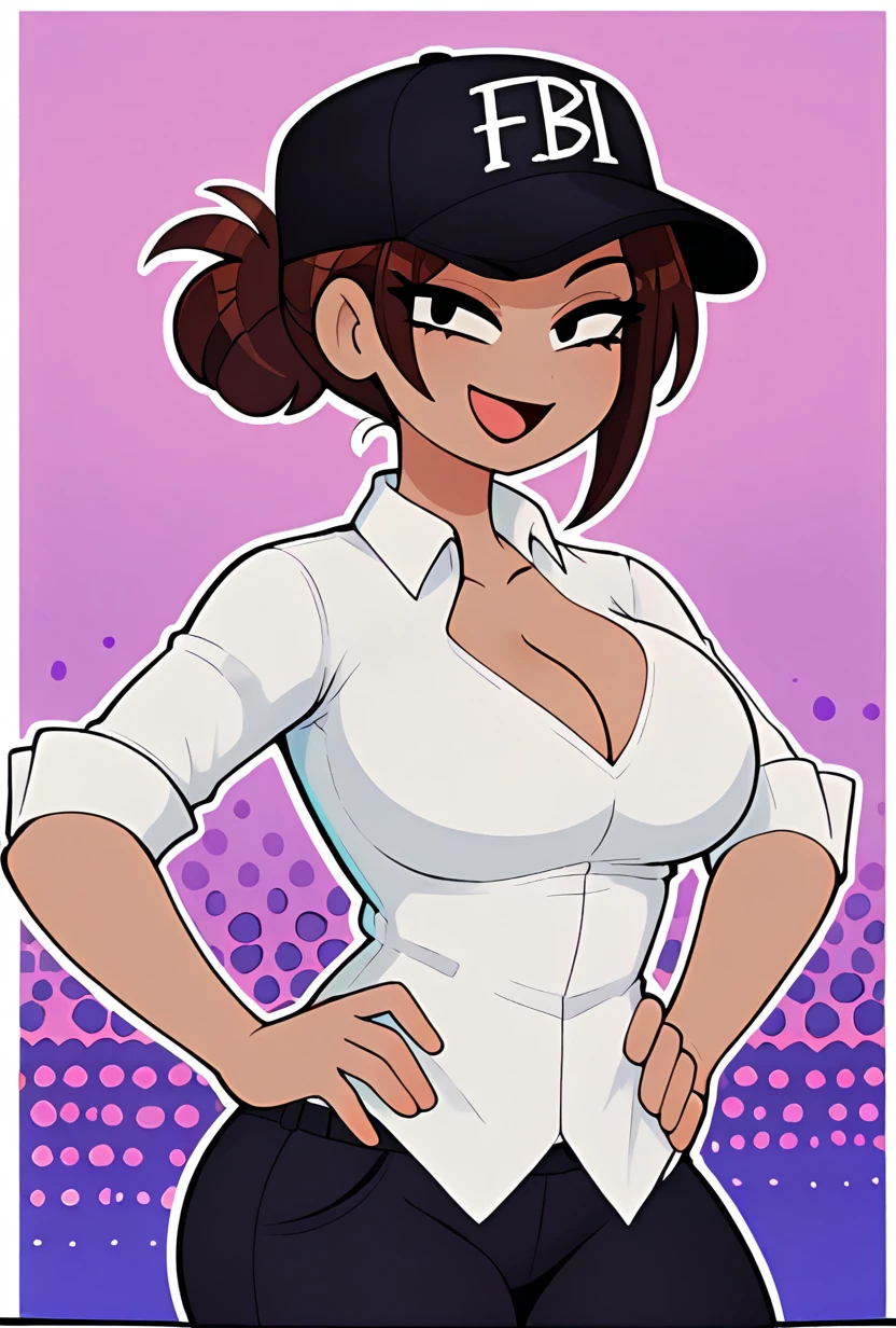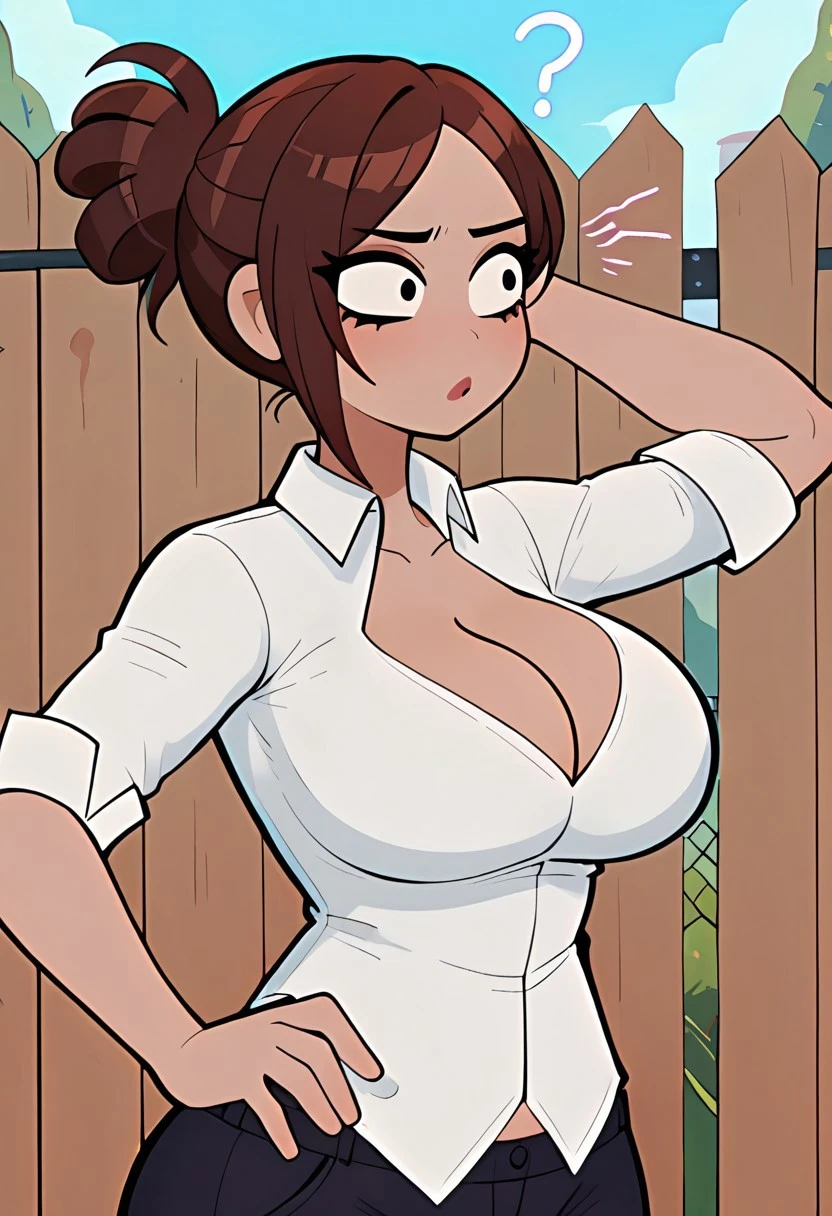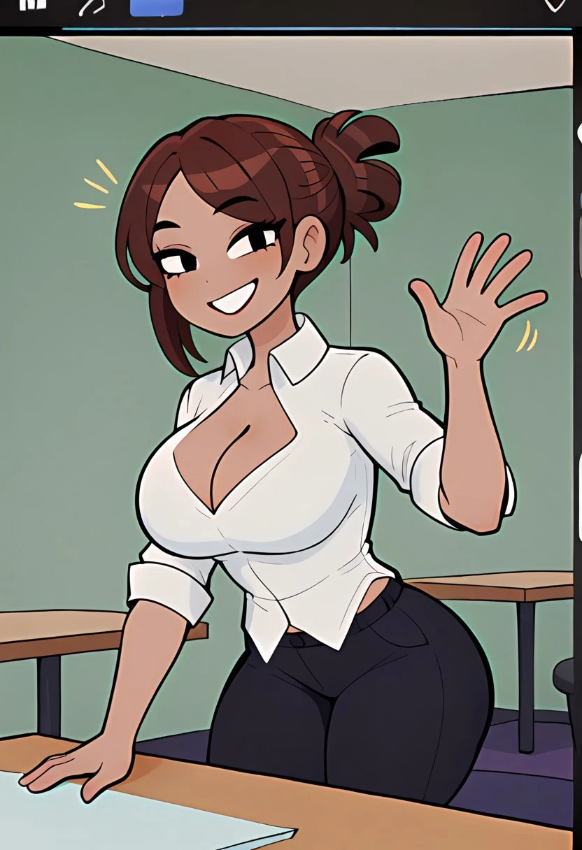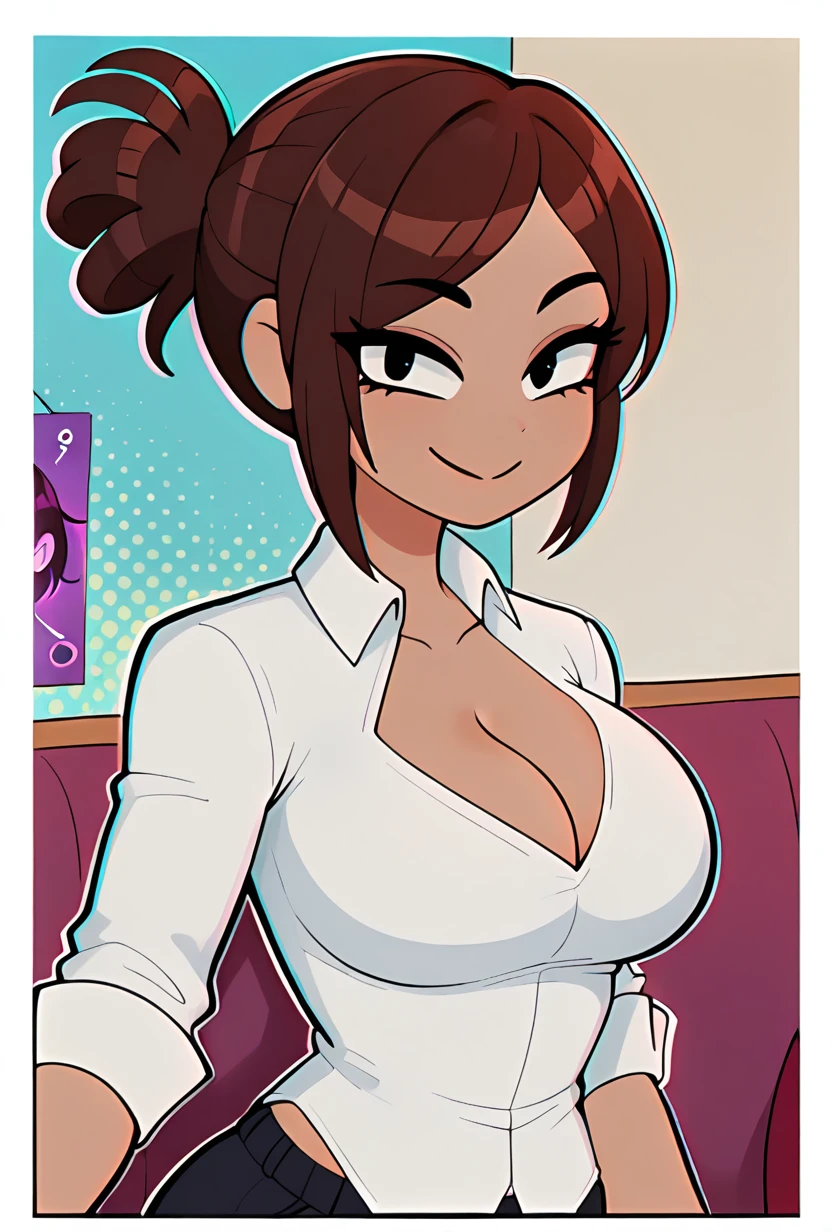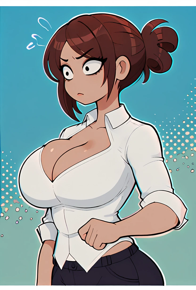 shadmanlatinamom, brown hair, large breasts, shirt, cleavage, 1girl, white shirt, black pants, collared shirt, single hair bun, dark skin,